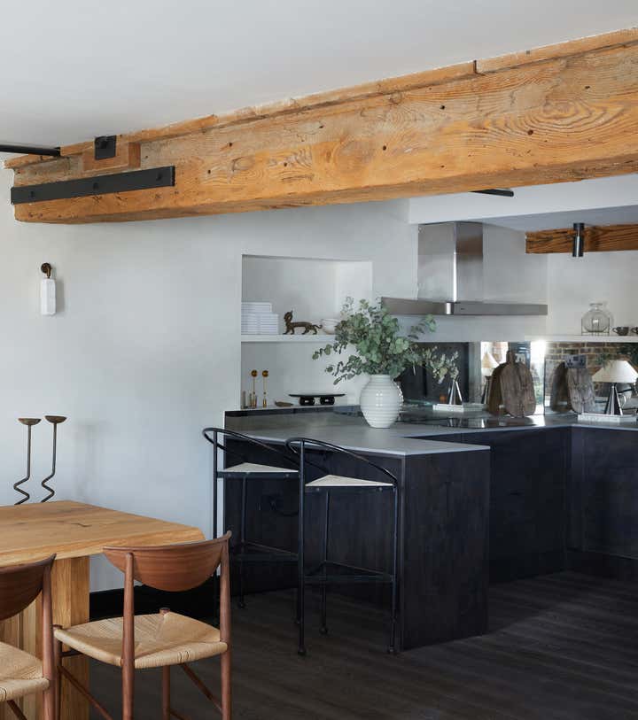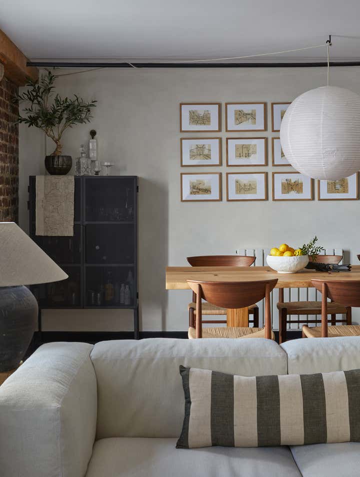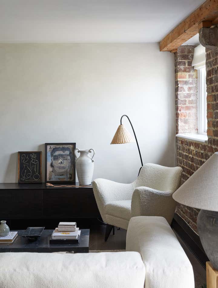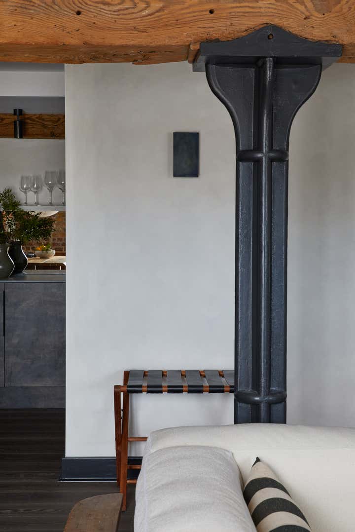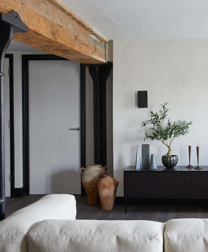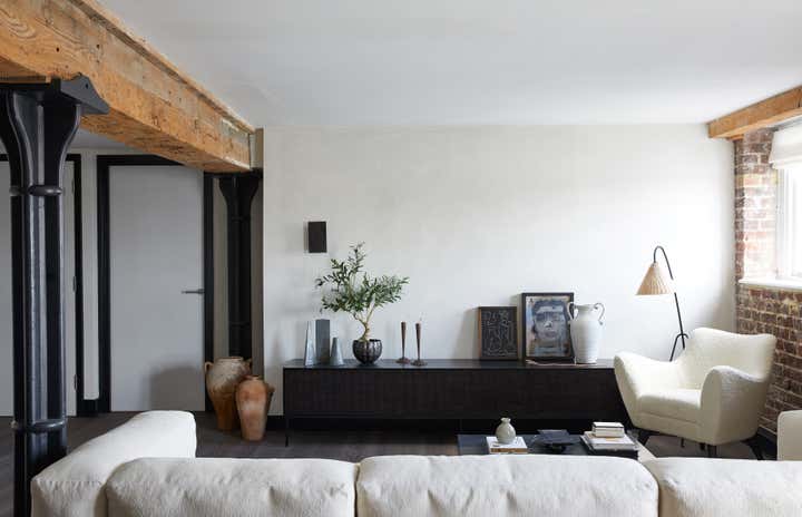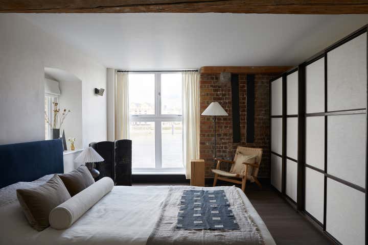 A unique listed warehouse conversion apartment on the bank of London s river Thames, designed in a worldly sculptural cottage style that looks to be floating right on the water.