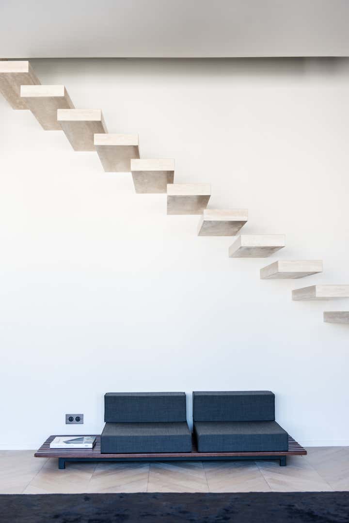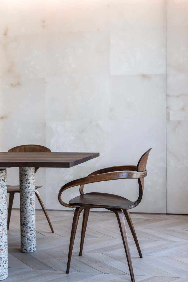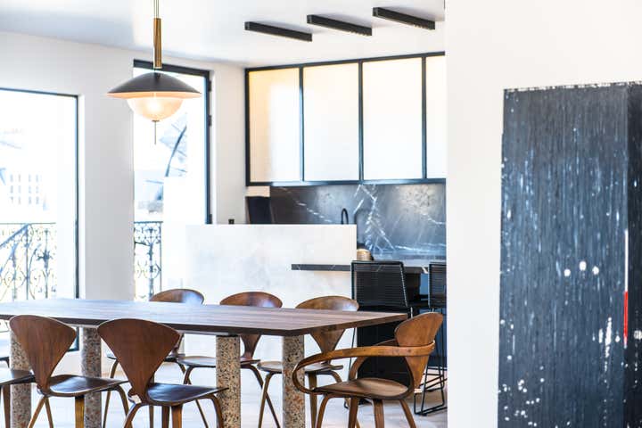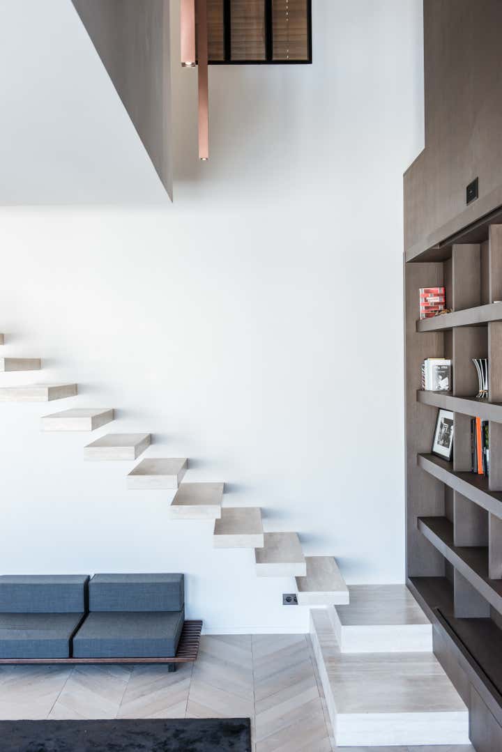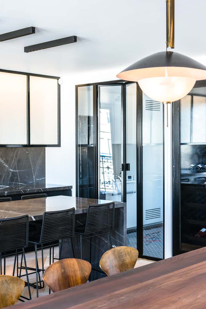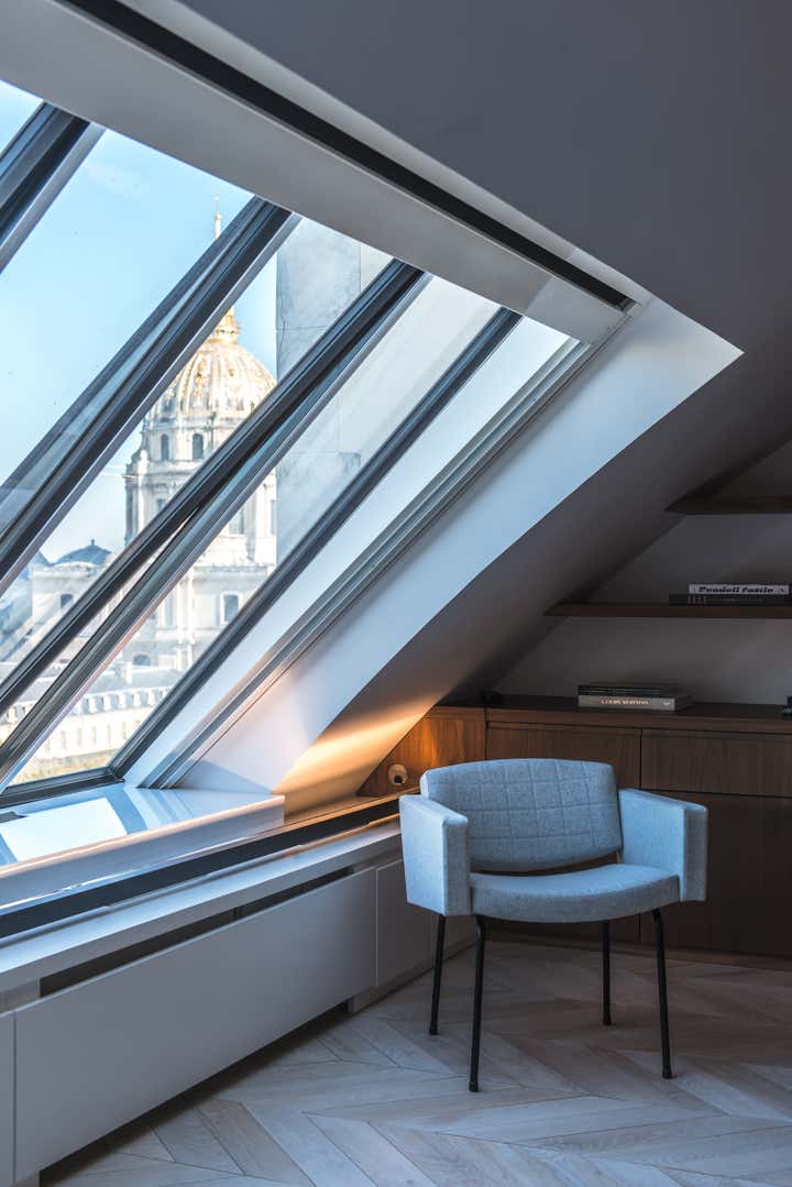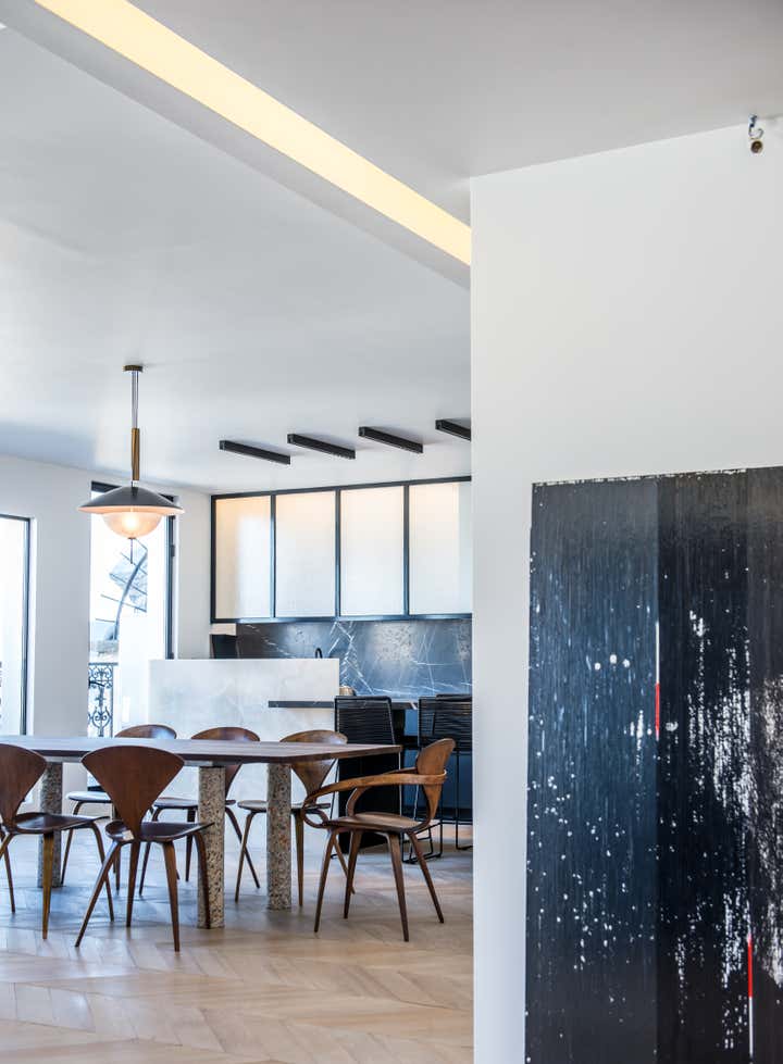 The stairway leads in a lightly way to the 1st floor and the view on the Effeil tower and the Dome des Invalides. The stairs are travertine marble bloc. The materials used are travertine marble, walnut, alabaster and few pieces in copper. The Kitchen that I drew is a living-kitchen, open on the dinning room with the Dome des Invalides as a view. The alabaster central Island hides a liquor bar. The living room hidden by the staircase offers different atmospheres, the view, the library and the alabaster cube. The library was created around a Corbusier s door bought at the auctions.