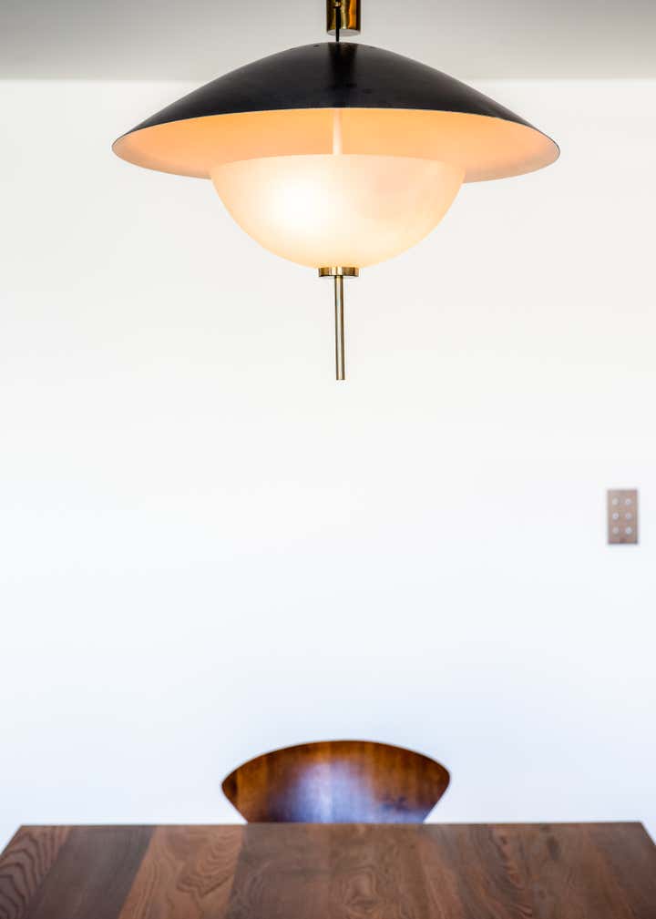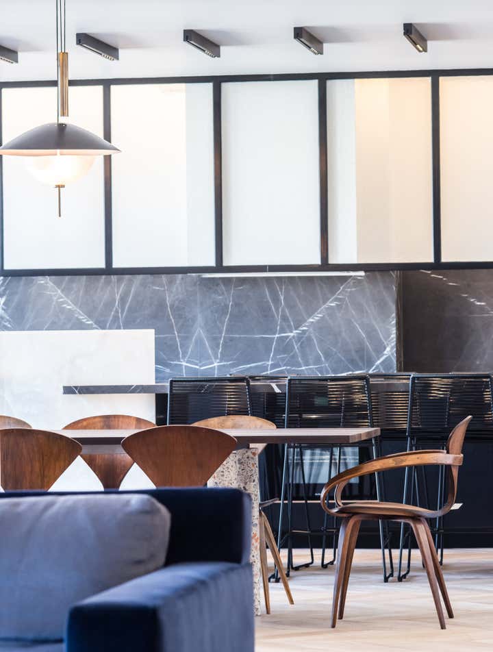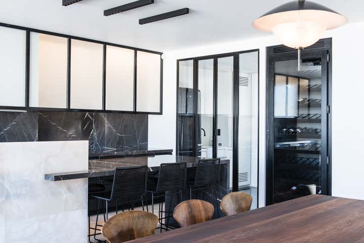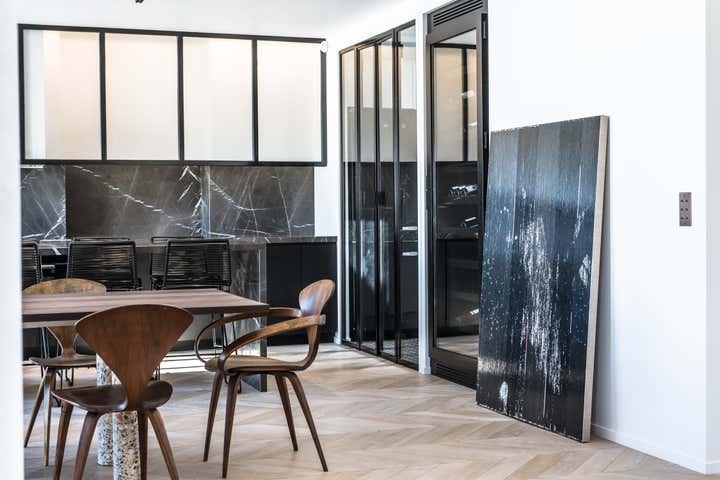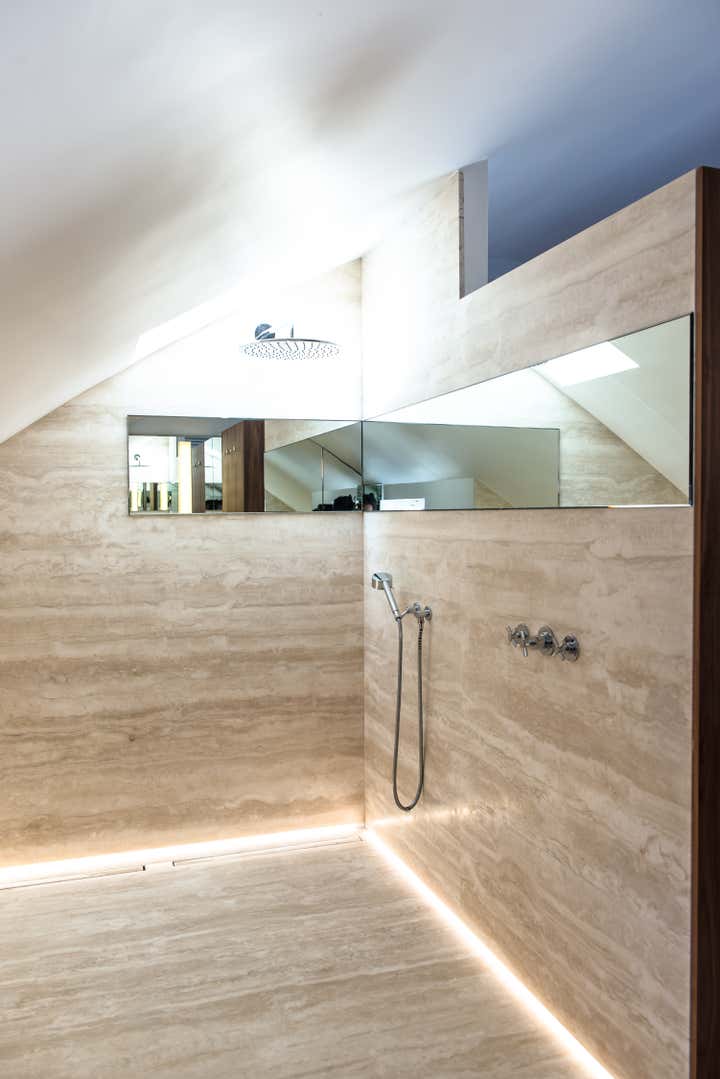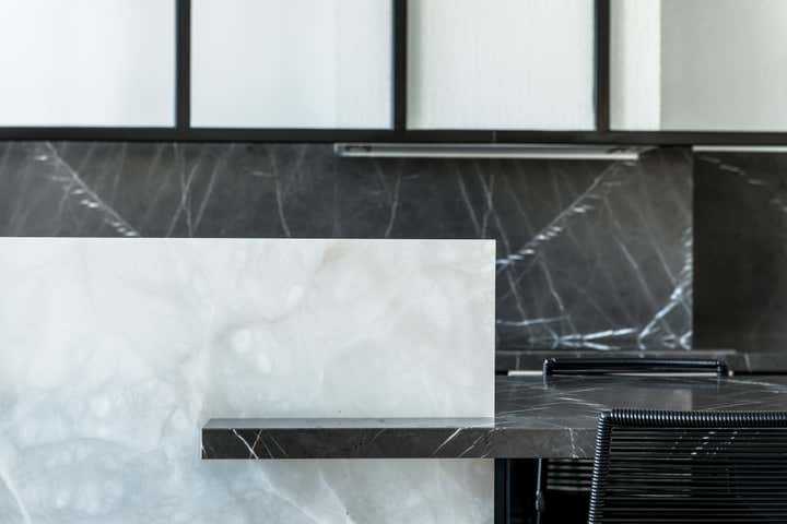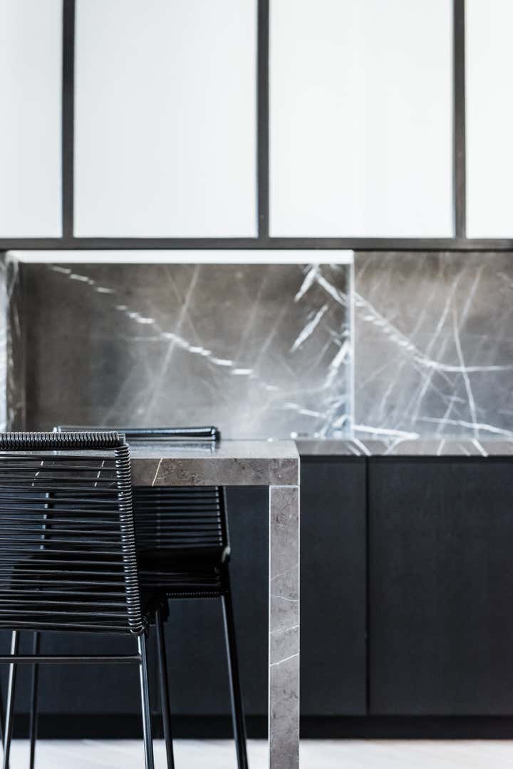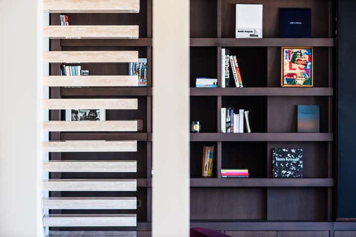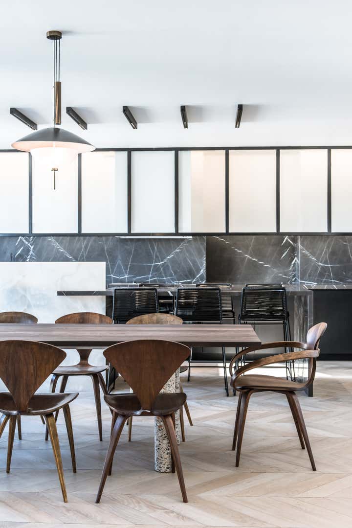 The stairway leads in a lightly way to the 1st floor and the view on the Effeil tower and the Dome des Invalides. The stairs are travertine marble bloc. The materials used are travertine marble, walnut, alabaster and few pieces in copper. The Kitchen that I drew is a living-kitchen, open on the dinning room with the Dome des Invalides as a view. The alabaster central Island hides a liquor bar. The living room hidden by the staircase offers different atmospheres, the view, the library and the alabaster cube. The library was created around a Corbusier s door bought at the auctions.