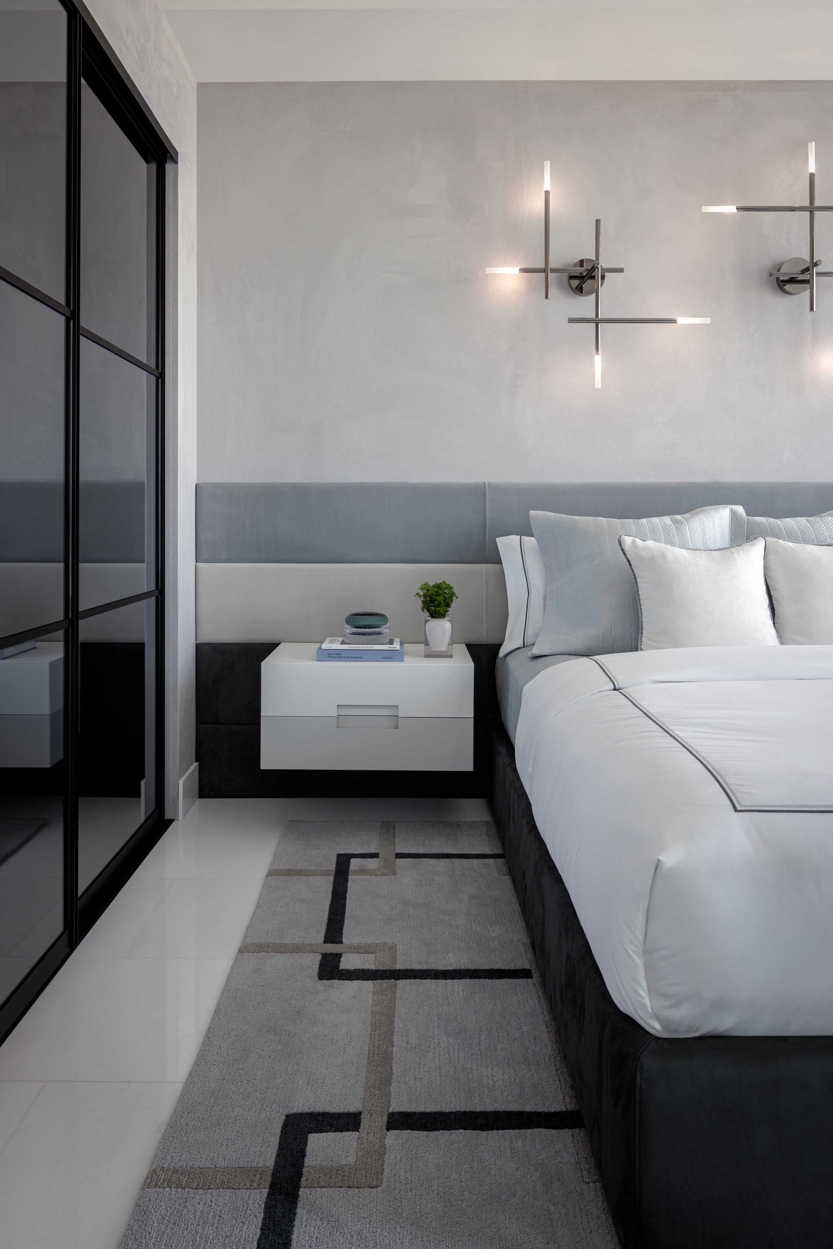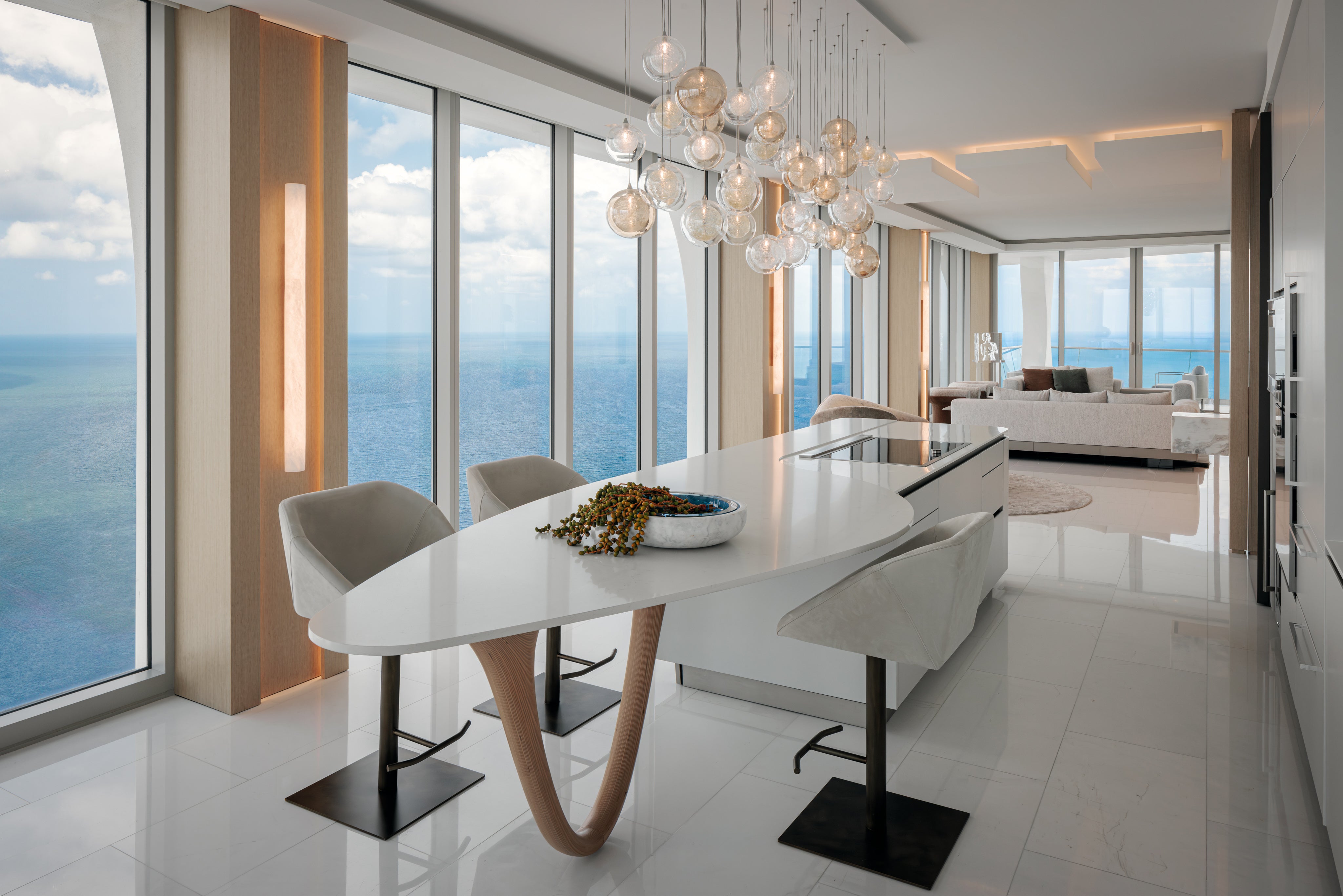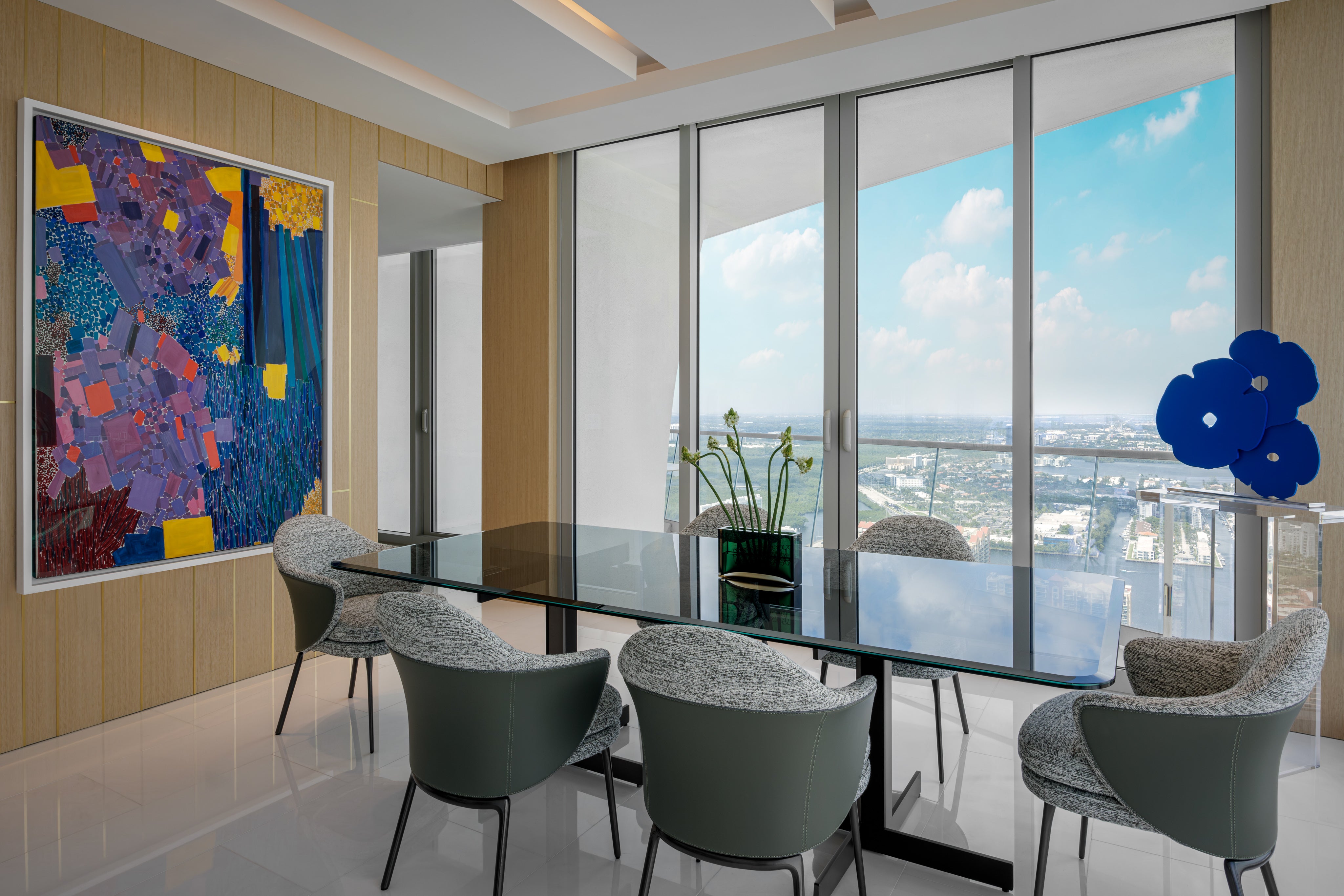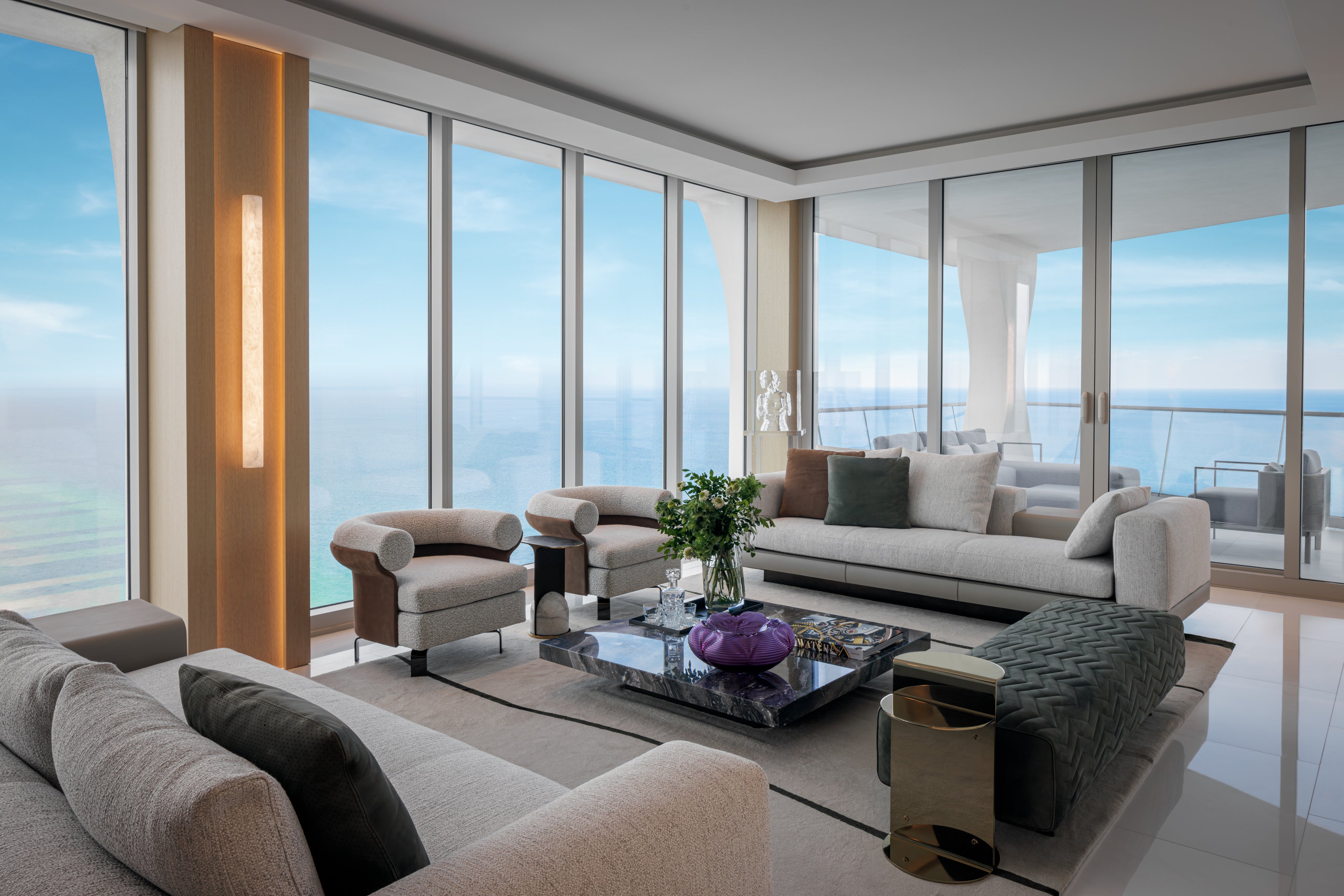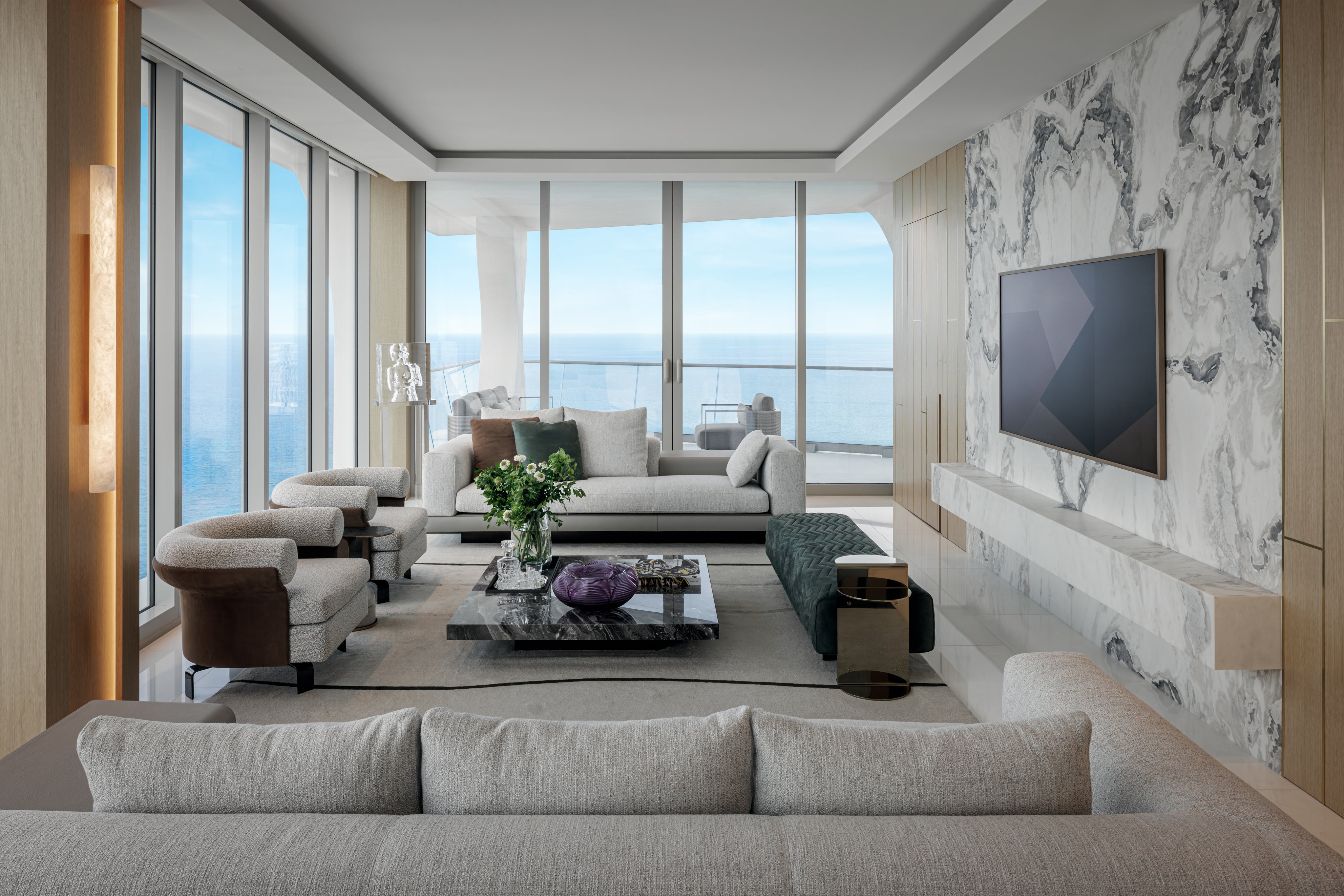 Designed for a family as their vacation home in Miami, this Jade Signature residence by Tamara Feldman takes a modern approach to beachfront living. The interiors are a reflection of the client’s love for sleek finishes, statement art, and unexpected design moments. From the cantilevered console in archipelago stone in the foyer to the marble wall by ARCA in the living, each space is expertly curated.