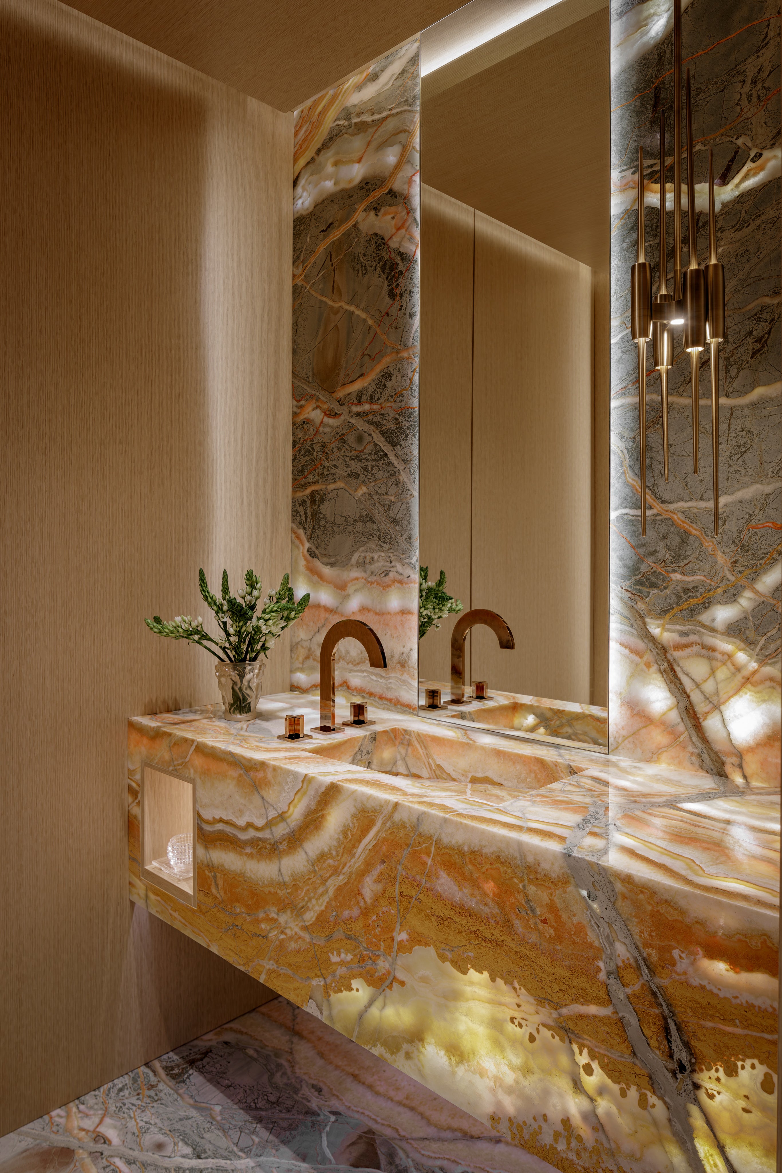The main entrance features high-gloss lacquered white-fluted wood that wraps the inner foyers concealing three doors, among them the powder room, which is a jewel box of a space. Indirect lighting, oak wood paneling, a Van Gogh granite sink with rose gold faucet by Franz Biegener create an everlasting impression. With an open plan layout the design concept uniquely connects each area through the thoughtful transition of colors and materials.