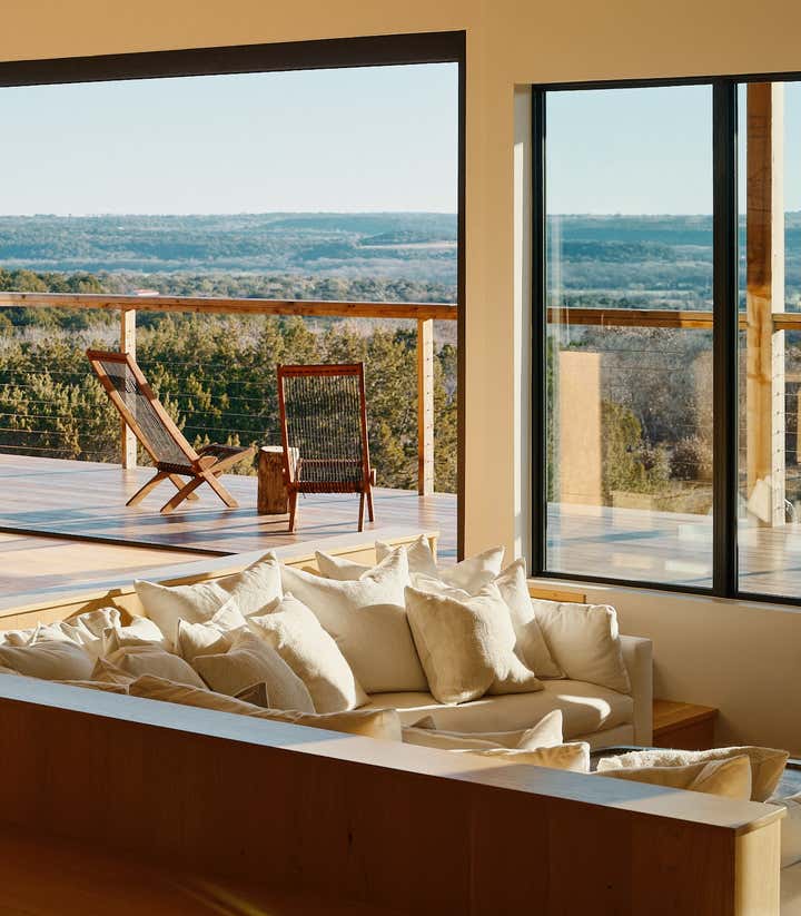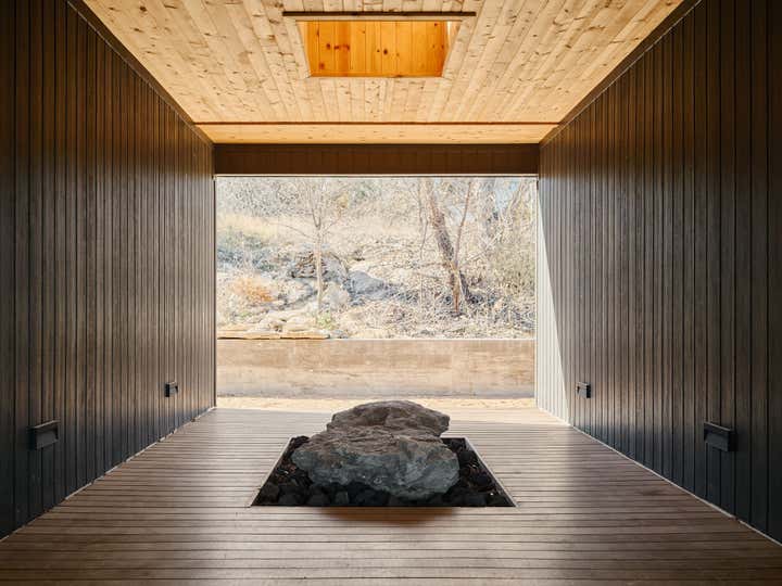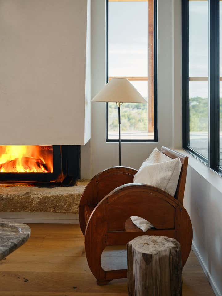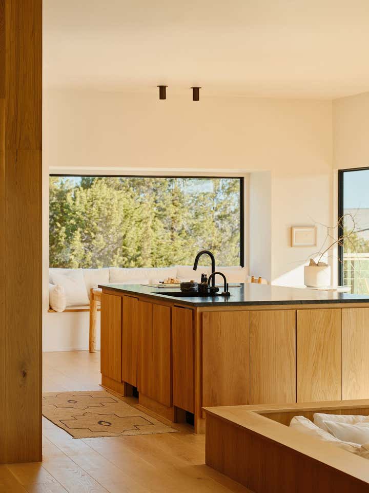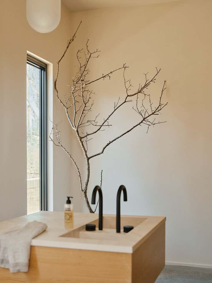 Every detail of this ground-up new build was overseen by the studio, from the home’s exact placement on the hillside lot to the bath linens and silverware. Starting with the massive rock, culled from the property, that greets visitors as they approach the central breezeway, the modern dogtrot house is a study in embracing the surrounding landscape. Unfinished oak and hand-troweled plaster walls, unlacquered brass plumbing and hardware, raw-edge stone bathroom sinks, and honed black granite kitchen countertops celebrate the beauty of natural materials as they patina over time. Rooms are furnished with plush seating in linen and shearling, found objects, vintage pieces, and an assemblage of sculptural lighting and highly personal art, creating a feel of soulful, considered comfort