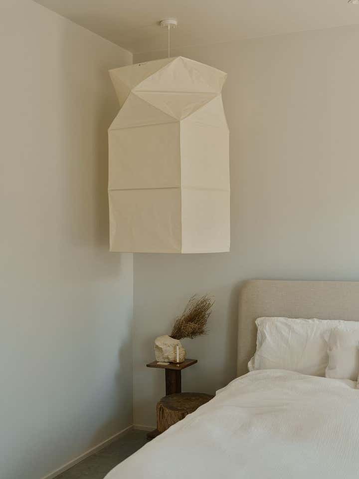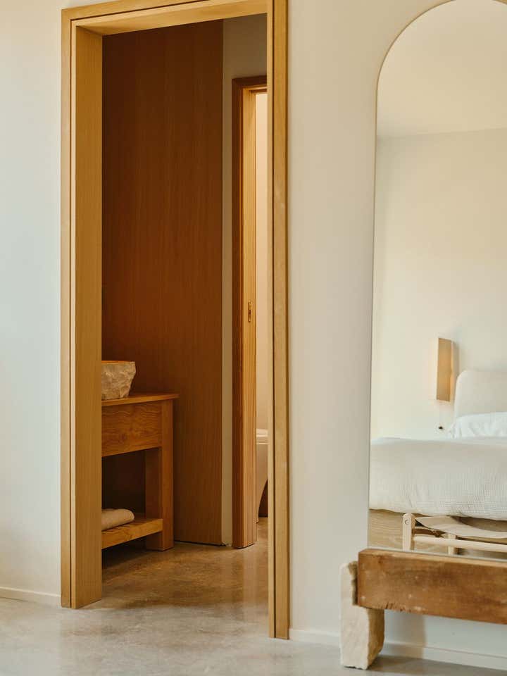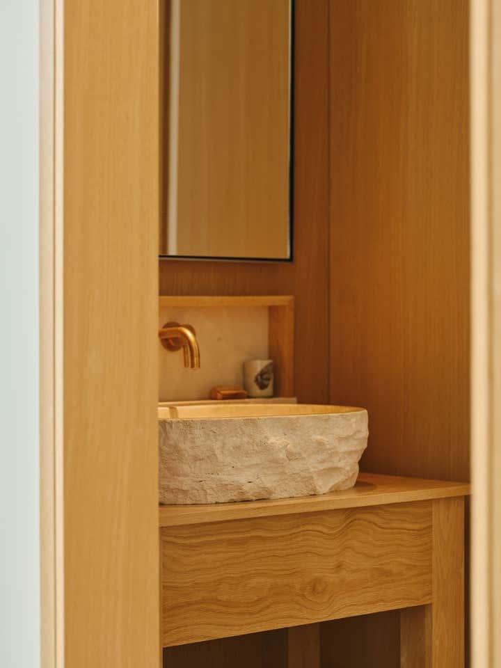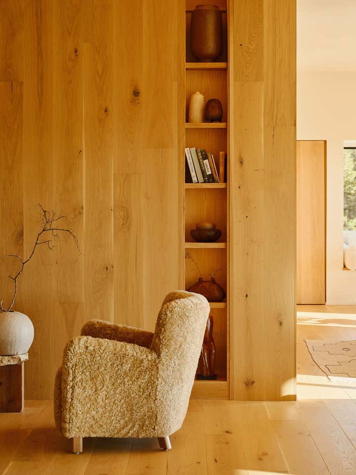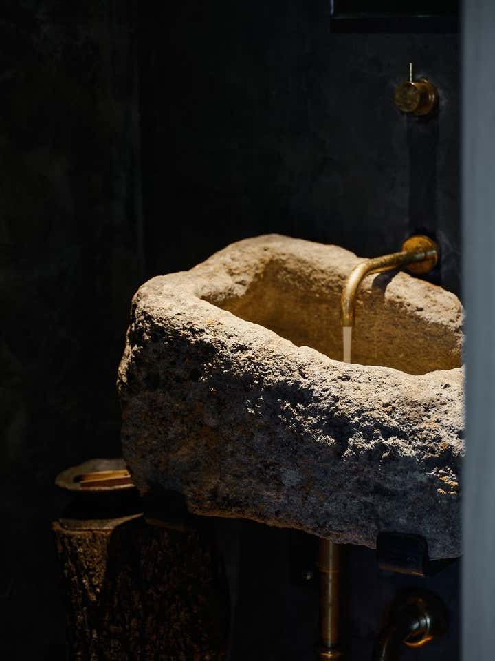 Every detail of this ground-up new build was overseen by the studio, from the home’s exact placement on the hillside lot to the bath linens and silverware. Starting with the massive rock, culled from the property, that greets visitors as they approach the central breezeway, the modern dogtrot house is a study in embracing the surrounding landscape. Unfinished oak and hand-troweled plaster walls, unlacquered brass plumbing and hardware, raw-edge stone bathroom sinks, and honed black granite kitchen countertops celebrate the beauty of natural materials as they patina over time. Rooms are furnished with plush seating in linen and shearling, found objects, vintage pieces, and an assemblage of sculptural lighting and highly personal art, creating a feel of soulful, considered comfort