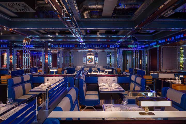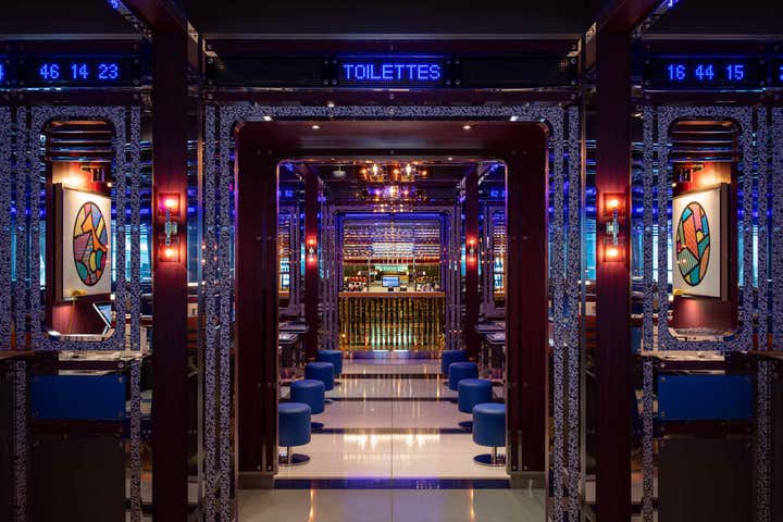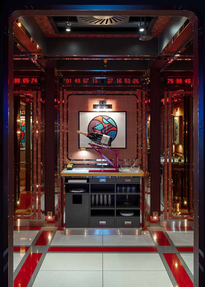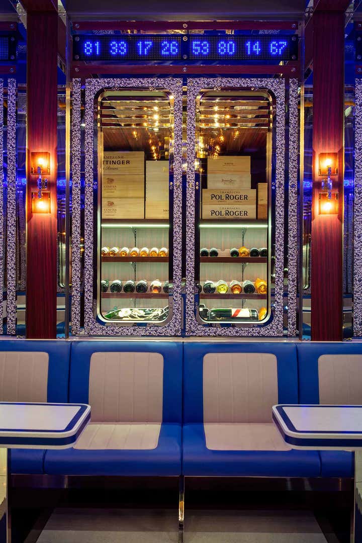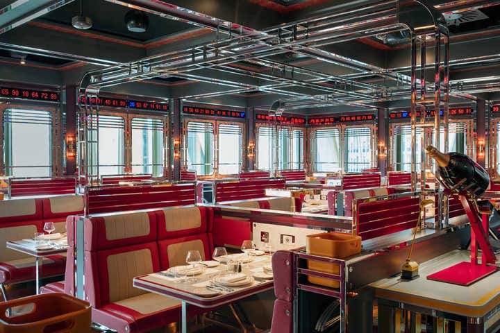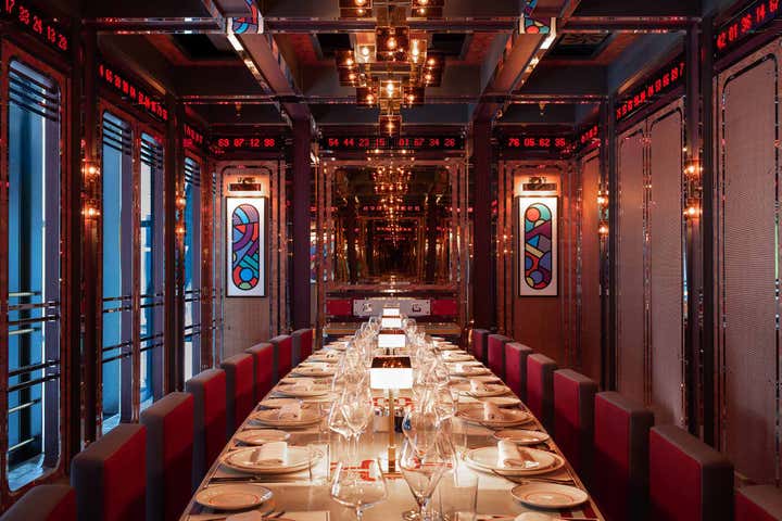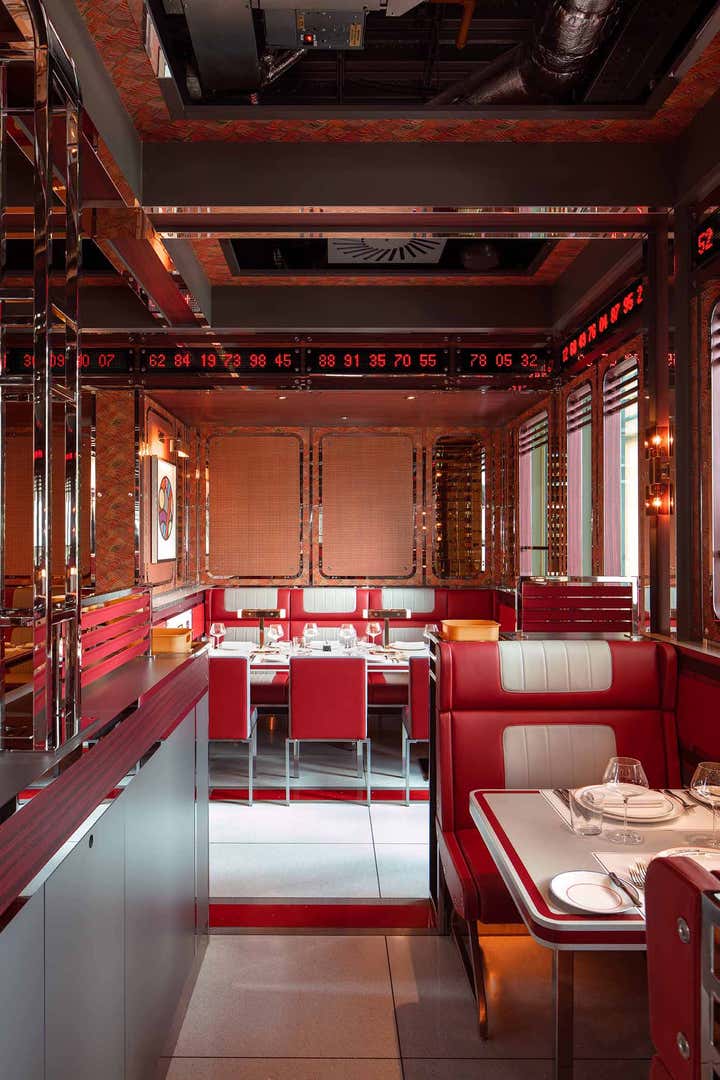 Ultra-camp meets ultra-luxury in the design of Bob Bob Cité. Exquisitely crafted interiors and perfect symmetry strike a delicate equilibrium of aesthetic excess. Inspired by 21st century design and air aviation, the restaurant seamlessly merges the ornate mirrored wall panels with intricate book binding paper and indulgent leather banquettes.