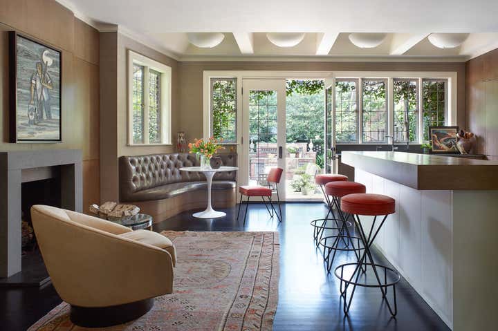 Over more than two decades, this 1920s English-cottage-style brick house was expanded and renovated to accommodate a growing family, a significant art collection and stronger connections between indoor and outdoor living spaces. The latest updates center on a kitchen redesigned as a social hub, a mix of timeless and mid-century furnishings throughout and interiors that balance traditional architecture with modern art and vibrant accents.