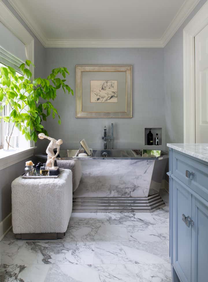 Since purchasing the home, Jamie and Vincent redesigned the kitchen, a powder room and family room were added, and each bedroom received an en suite bathroom, including the main bathroom with a striking stainless-steel neoclassical tub.