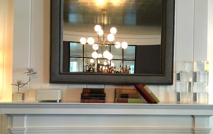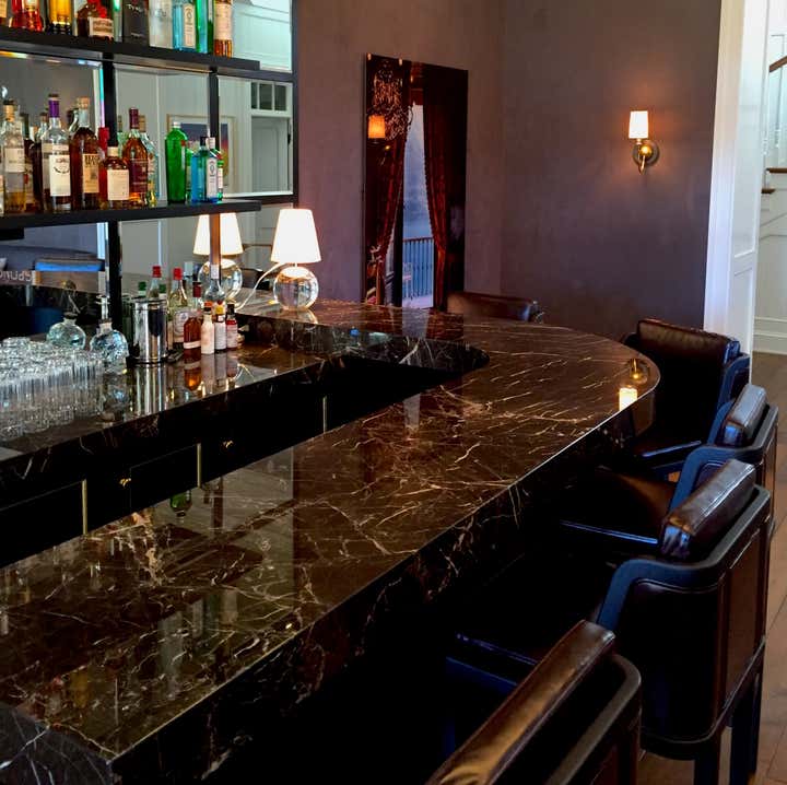 Custom curved noir st. laurent marble bar top. Suede walls and silver leaf reflective ceiling. Light bounces all over this welcoming lounge.