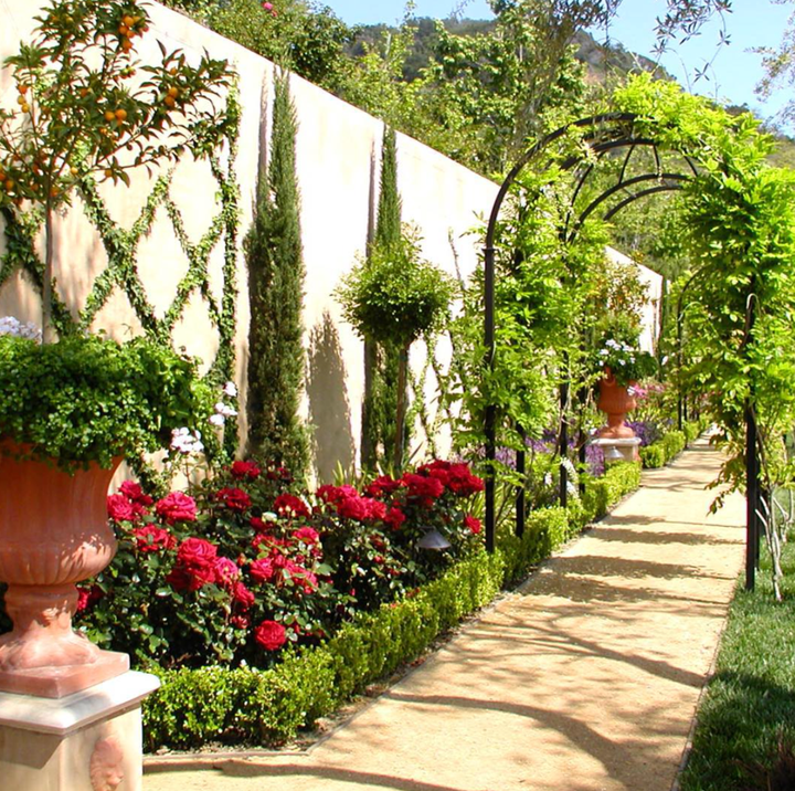Large scale retaining walls were used to expand an existing hillside garden at this Tuscan estate. Decomposed grant walkways are punctuated with masses of roses, antique pottery and wisteria covered pergolas.