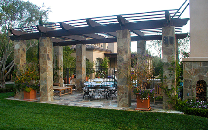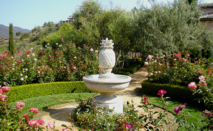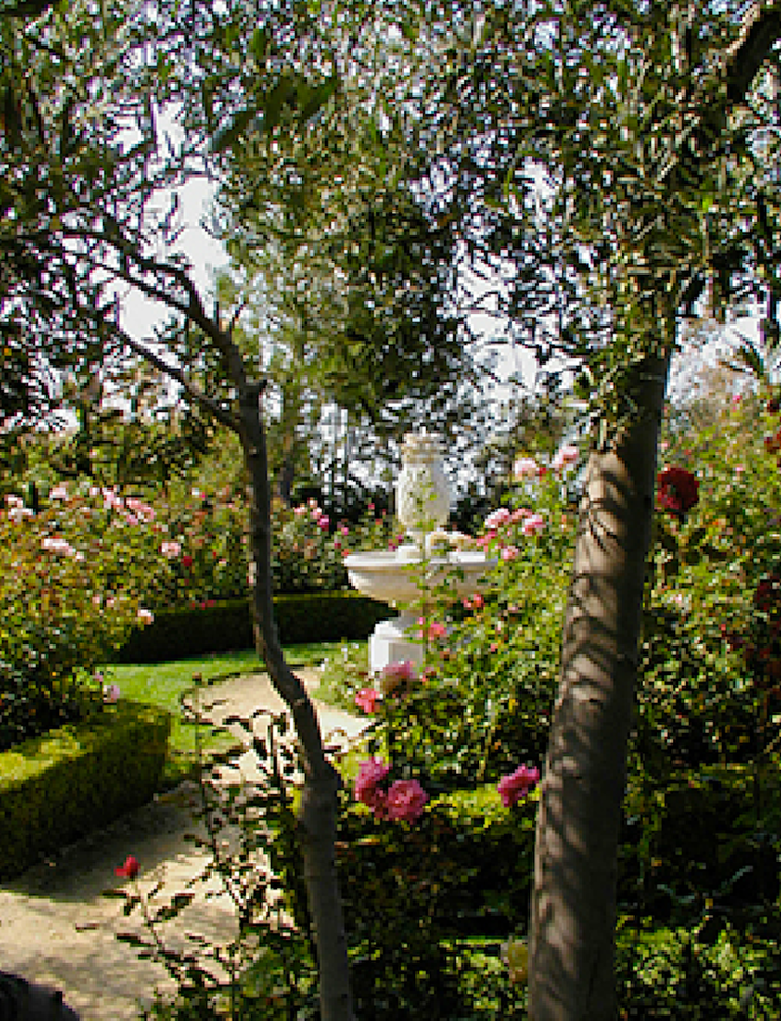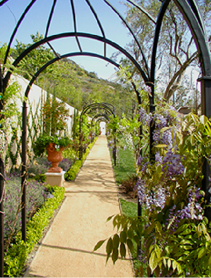 Old grove olive trees, Italian cypress, and clipped hedges create strong axial views. The addition of a honeysuckle covered pavilion allows for dining al fresco and enjoying the distant views.