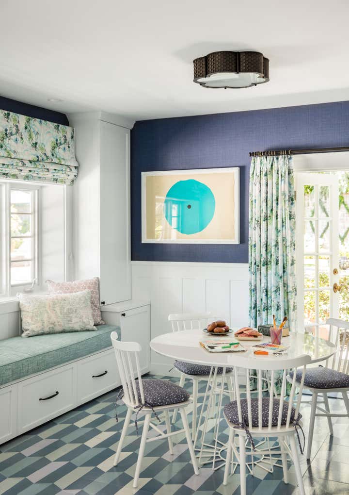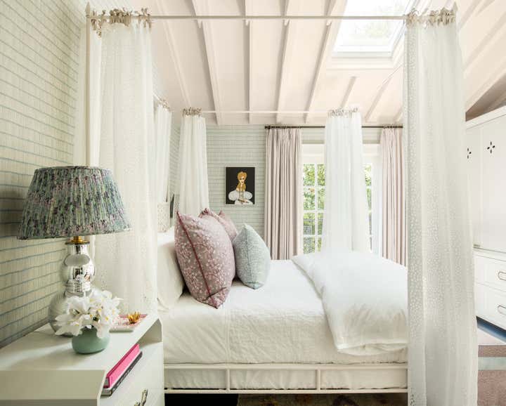 The one-time garage and carriage house of a historic Brentwood estate is transformed into a multi-purpose playroom below, and guest suite above. Traditional beadboard and exposed beam ceilings are highlighted in paint shades and wallpapers that pop, shaggy antique rugs and playful fabrics.