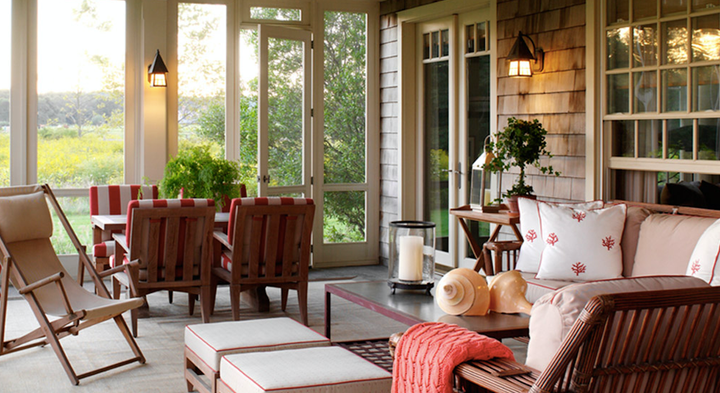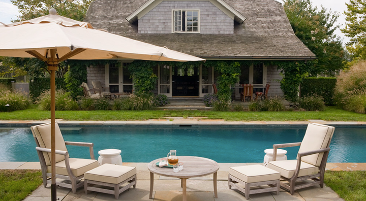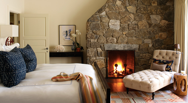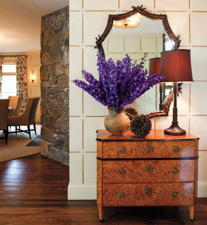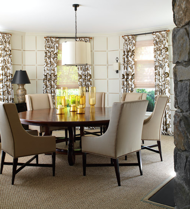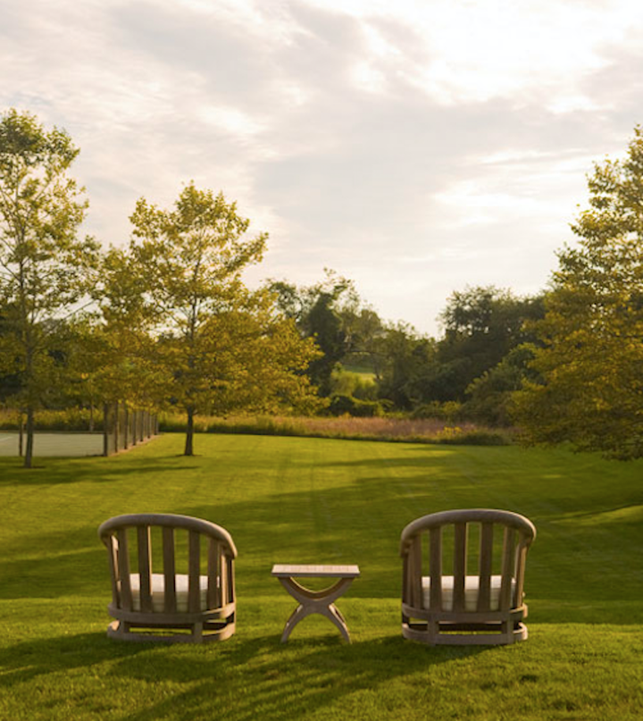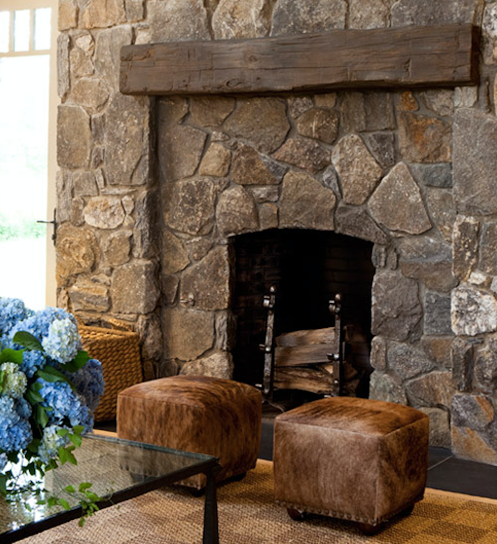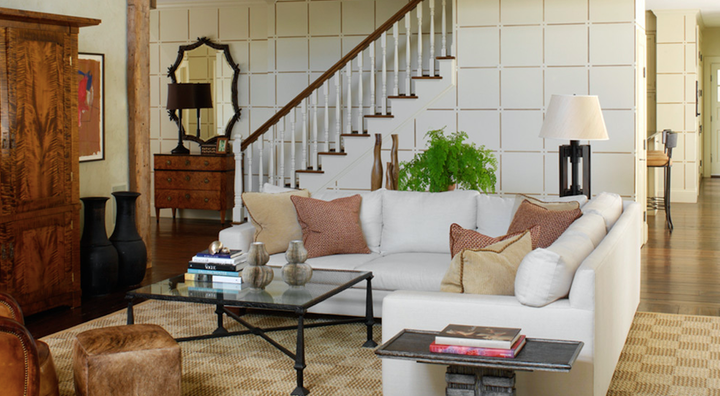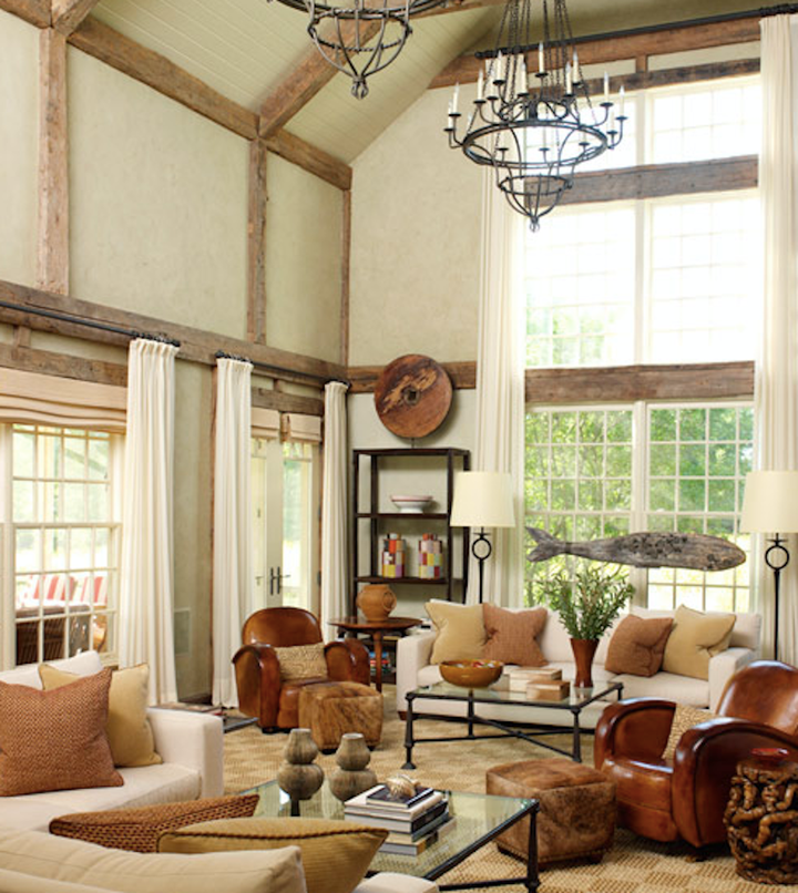 Layering various textures – rich leathers, woven textiles, rustic metals, and earthy woods – create a warm and masculine residence. This large home in the heart of horse country is the ideal setting for relaxed summers. The rich brown coloration and earth tones used throughout the rooms were derived from the dark chestnut floors, the beams in the double-height living room, and the stone hearth. Unique rugs in variations of geometric patterns, give the rooms a subtle added dimension.