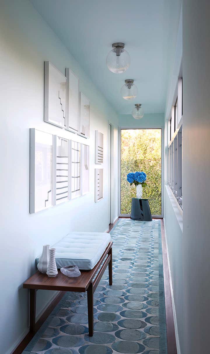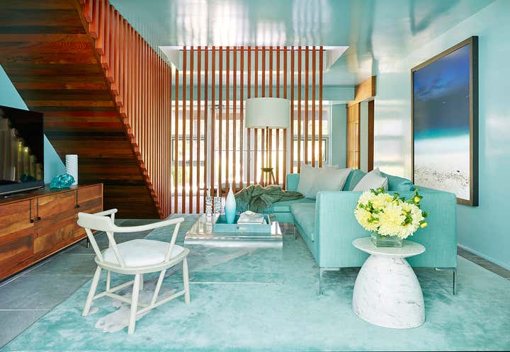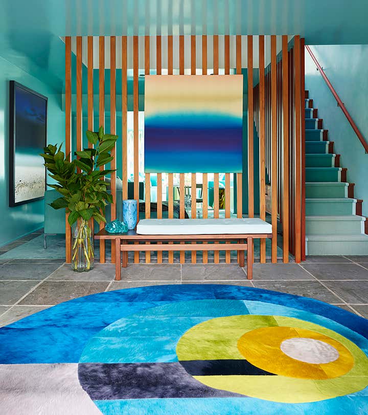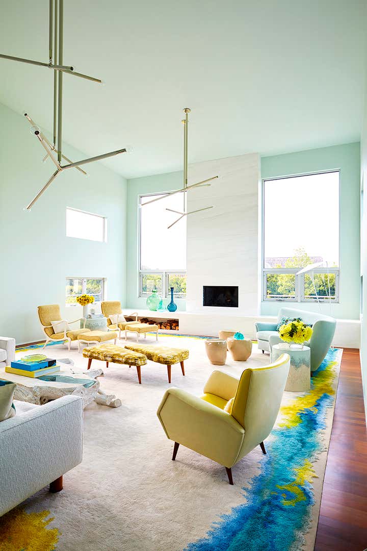 Vibrant colors and textures inspired by the sea and sky invite entertaining and relaxation at this Hamptons summer home embellished with artisanally crafted and vintage pieces.