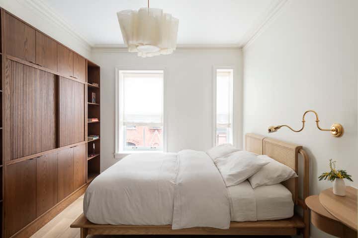 The house was selectively gutted and completely transformed to create a restful pied-a-terre for a West coast professional who travels to NYC regularly for long stays. The house has one bedroom and a luxurious bath on the top floor, however the lower levels are designed for both solo living and also for entertaining.