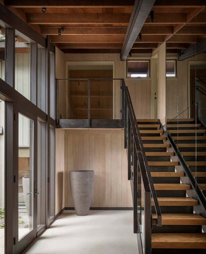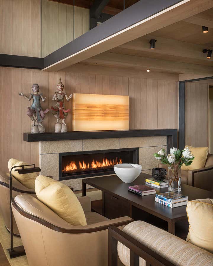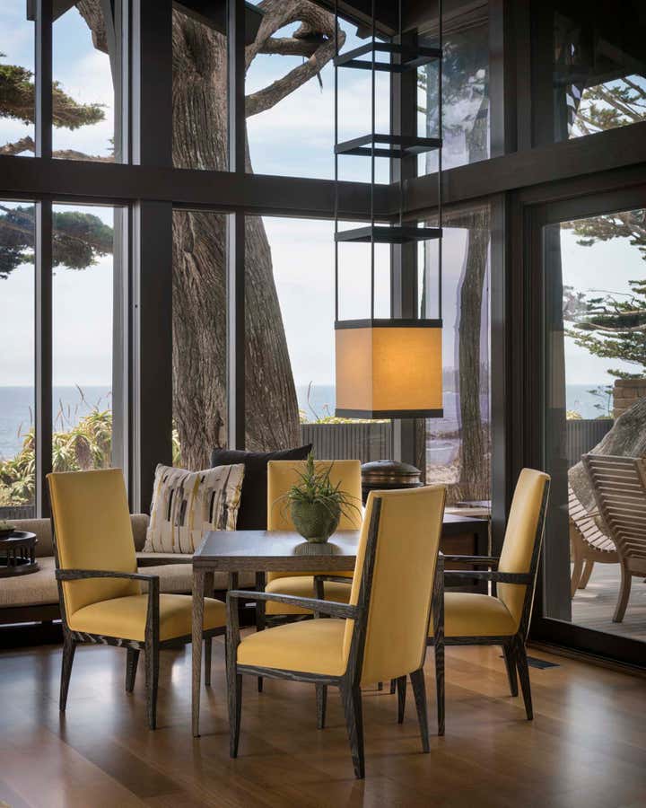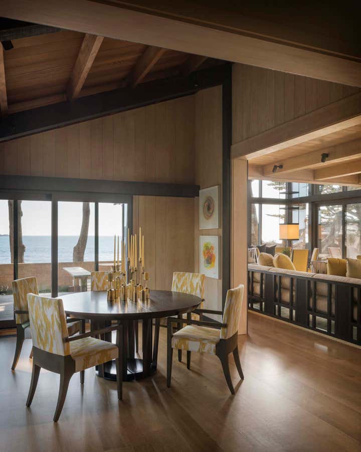This family envisioned a home highlighting the natural beauty of the ocean for generations to come. The minimalist Asian aesthetic complements the mid-century architecture as seen in the custom pendant lights that resemble contemporary Japanese lanterns. In the living room, a mirrored wall captures the reflection of the water, and the floating bench provides extra seating while allowing visibility of the landscape and exterior vistas. Throughout the interiors, bold oranges, yellows, greens, bronze finishes, and nuanced textures punctuate the warm neutral color palette.