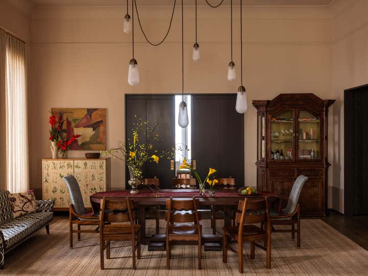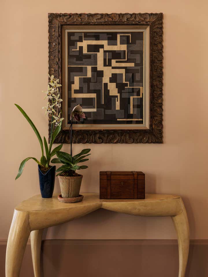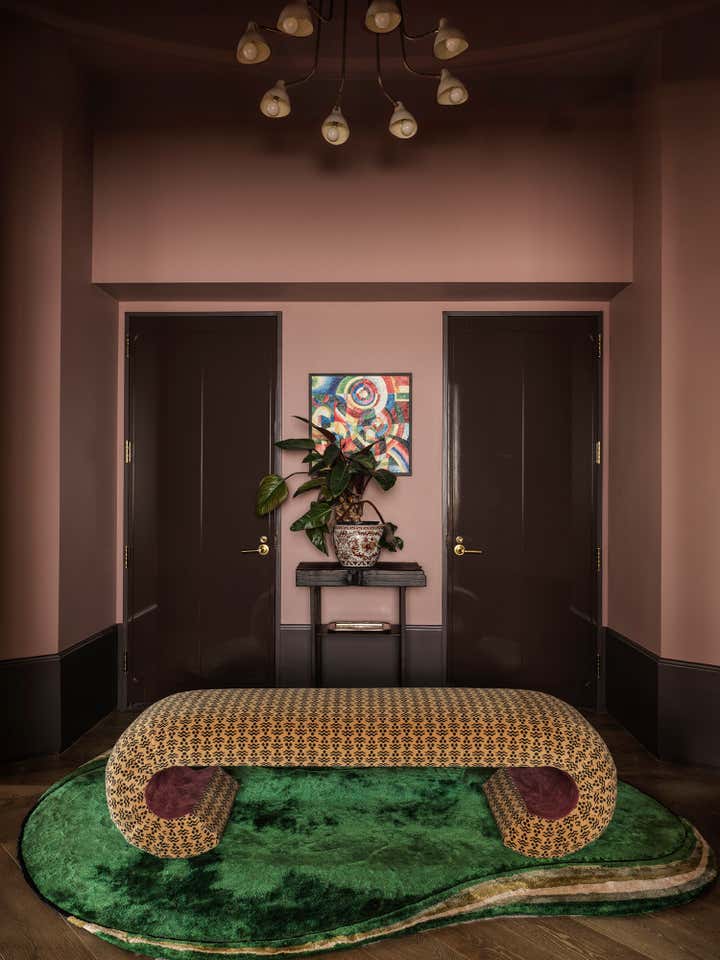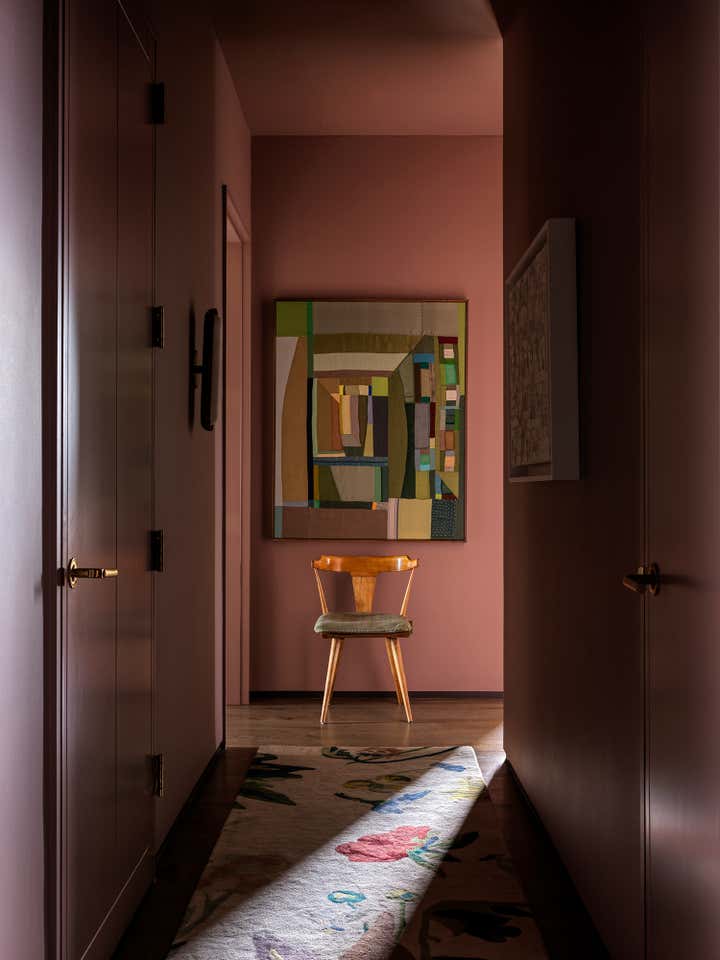 Our interior design team incorporated an eclectic blend of furniture styles from midcentury-modern with bespoke artisan furniture and fine period antiques. Tactile layers of rugs and textiles complement pieces of character with aged patina, creating soulful rooms filled with warmth and comfort that harmoniously blend color and pattern. The apartment took on a dramatic, moody feeling, yet one that complimented the more minimal architecture of the space and exercised a particular Shaker restraint.