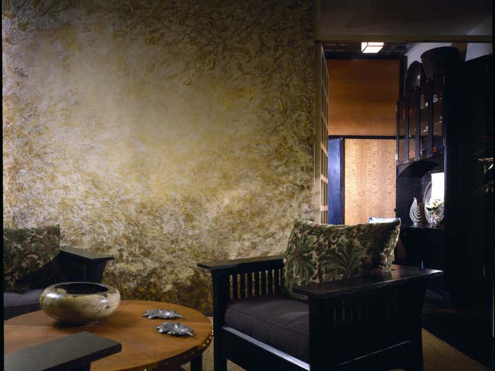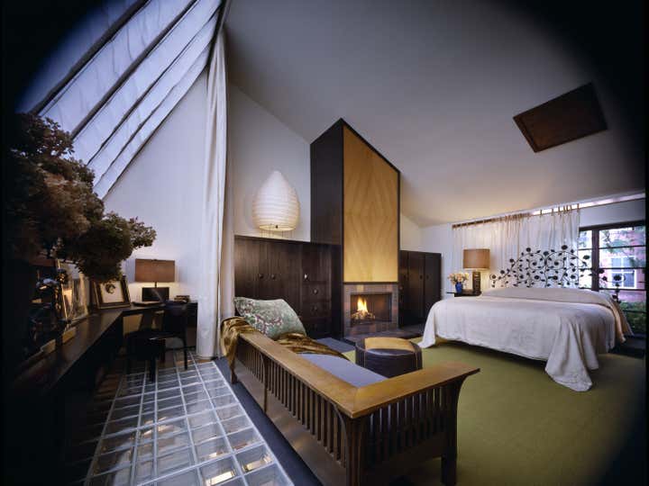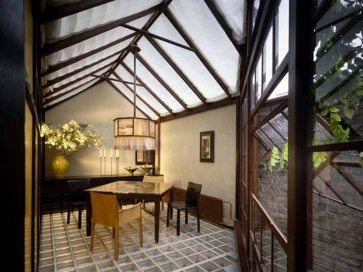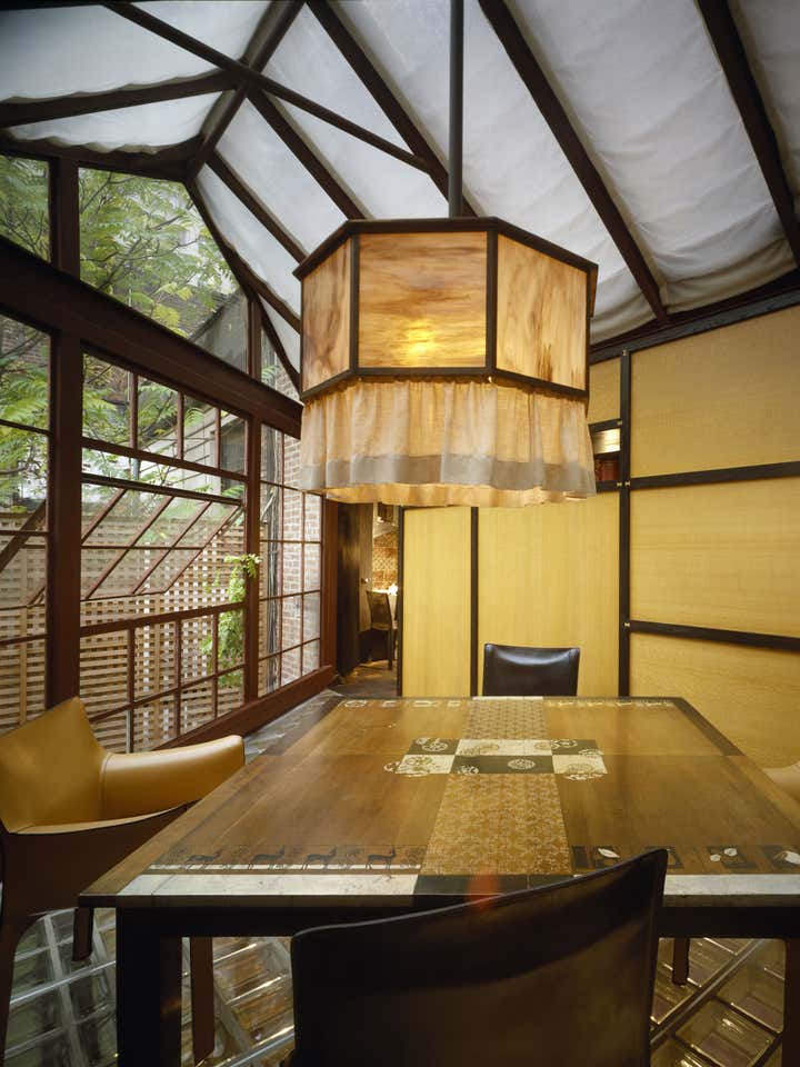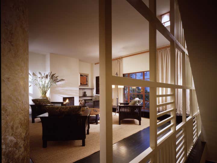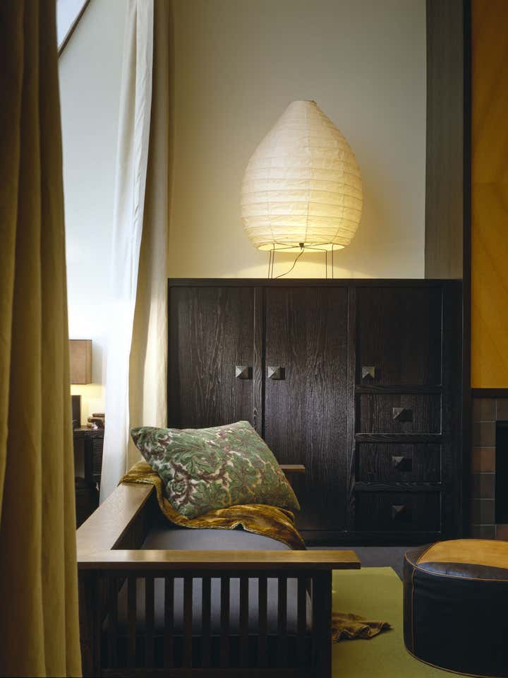 A former carriage house situated on a private alley evokes the Arts and Crafts movement incorporating many Stickley furnishings. "The goal was to use elements of that period without being too literal and to infuse it with a modern take." It has long been a private and contemplative retreat in a busy city for the actor and his family.