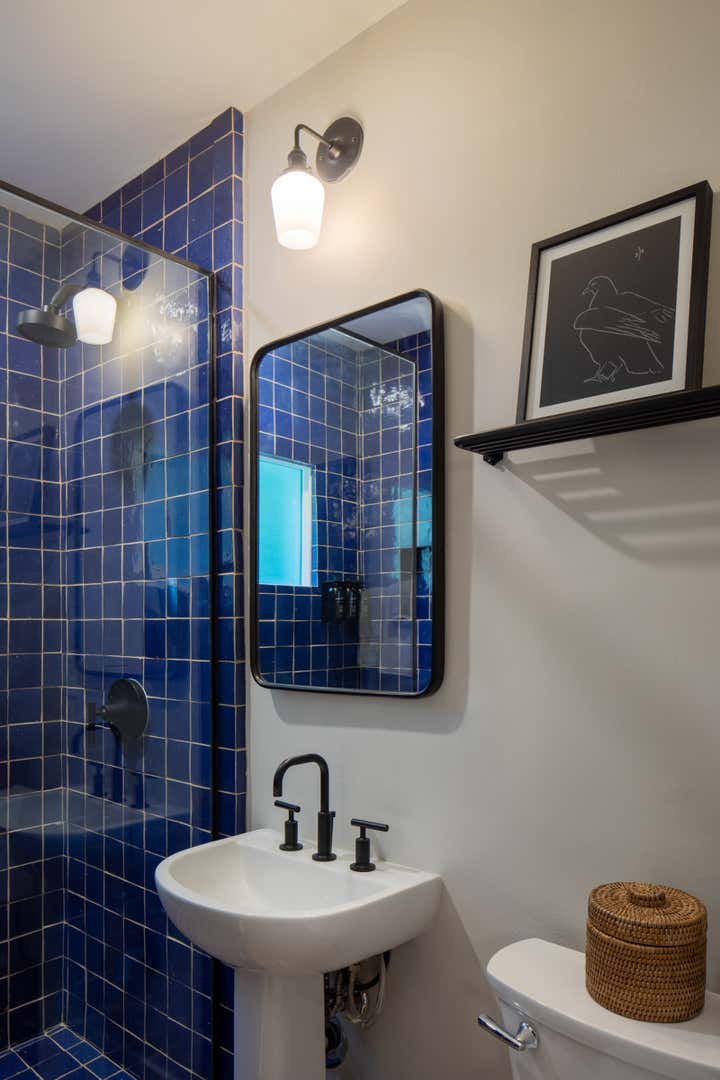 With warm coral velvet, textured blue-green accents, and otomi-patterned pillows, the rooms are imbued with depth to enliven the existing plaster interior. Each room features richly colored zellige tile and deep blue millwork in the bathrooms and bar areas, reflecting the Mediterranean influence in a modern design. Electric Bowery custom designed upholstered elements and cabinetry in the space for an inviting, residential feel. Dark wood tones balance the rich pops of color, creating a classic yet modern aesthetic that is unlike any other in Palm Springs, as unique as the vibrant history of the property.