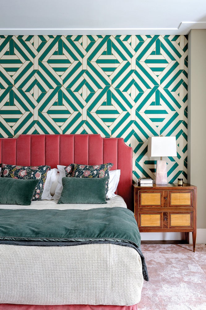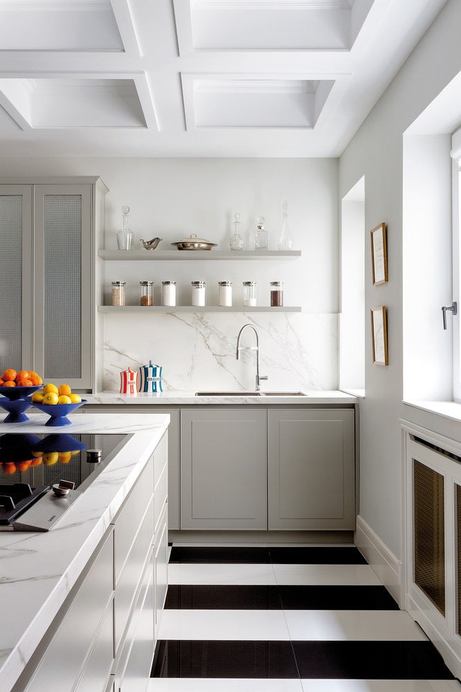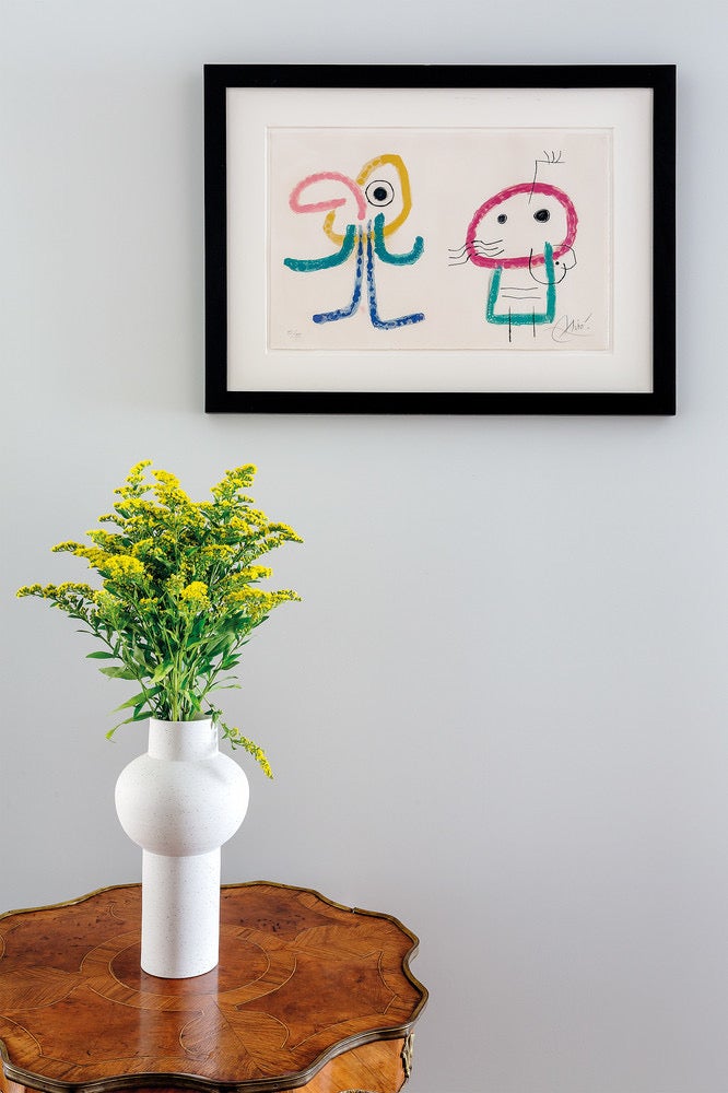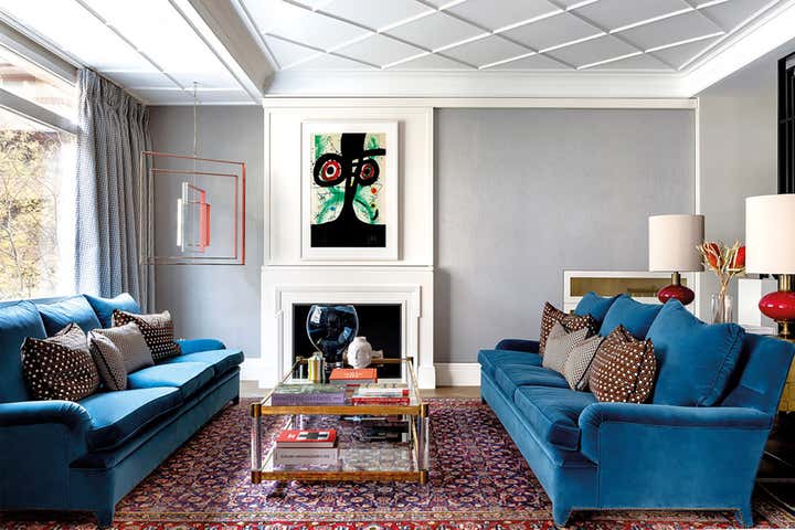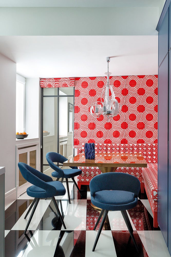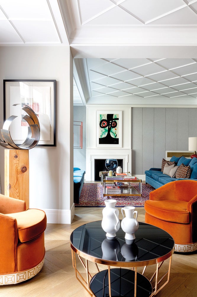 Designed for a 4 member family moving from Munich to Madrid for a change of life, the apartment has on the main level a dramatic hall with a black and white marble floor combined with two original wall lamps from the 60s design of the house and a Kelly Wearstler lamp on top of an Art Deco round table.
