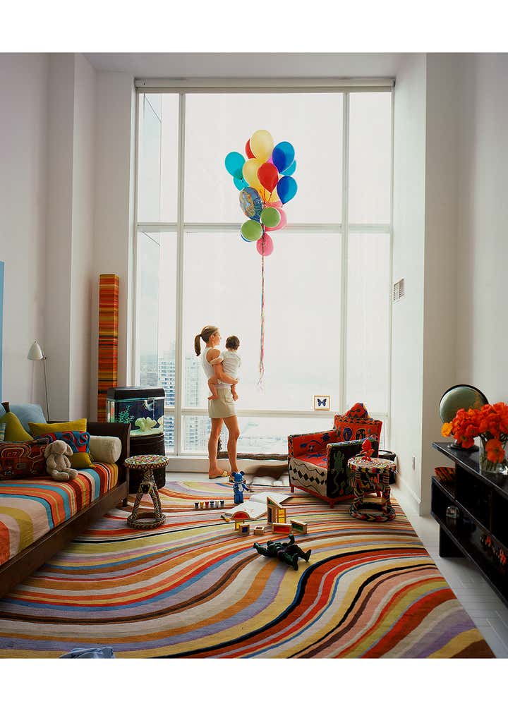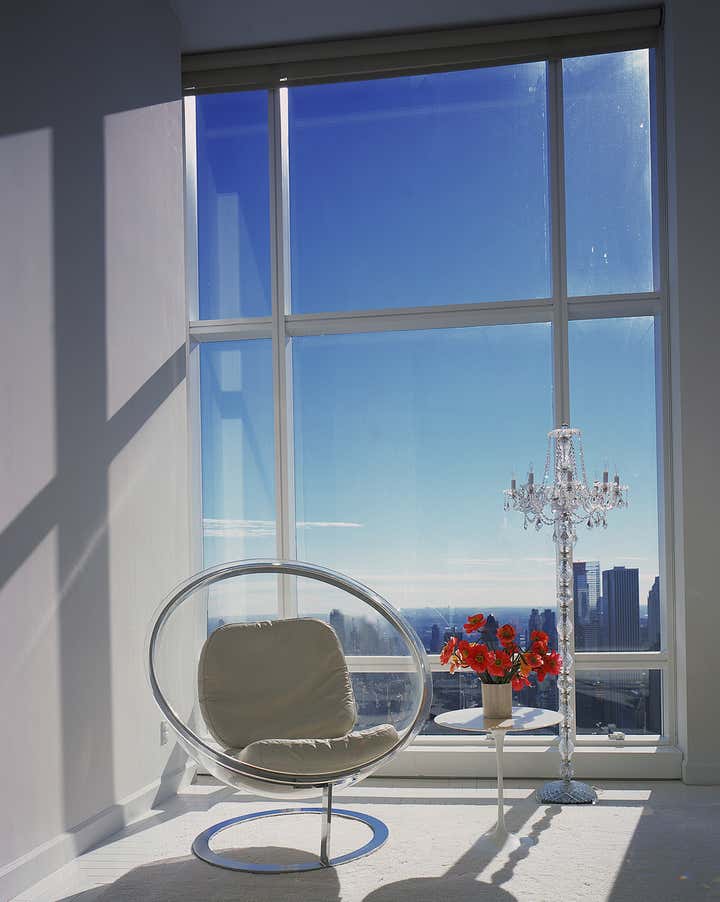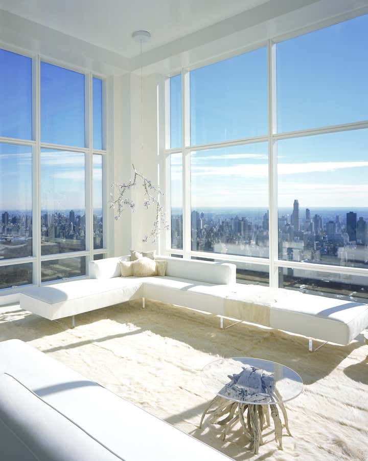 Featured on the cover of New York Magazine, this project was guided by two simple principles: to create a light and meditative space that provided a respite from the hustle and bustle of city life below; and to be mindful not to upstage the expansive views of Central Park and beyond. Some highlights are the Tord Boontje blossom chandelier from his first run of this now iconic piece, a pair of customized Vladimir Kagan sofas, and a printed and handpainted wallpaper taken from a digital photograph of the sky snapped from the living room windows. By utilizing lots of texture and varying shades of white throughout the main living areas - from matte wall paints that allow for easy touch ups, and hi-gloss ceiling paints to reflect the raking light, to slipcovers and upholstery fabrics that were easily cleaned like ultrasuede - the result provides definitive proof that it is possible to live in a cloud of your own making.
