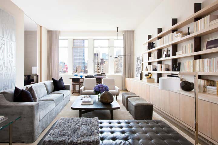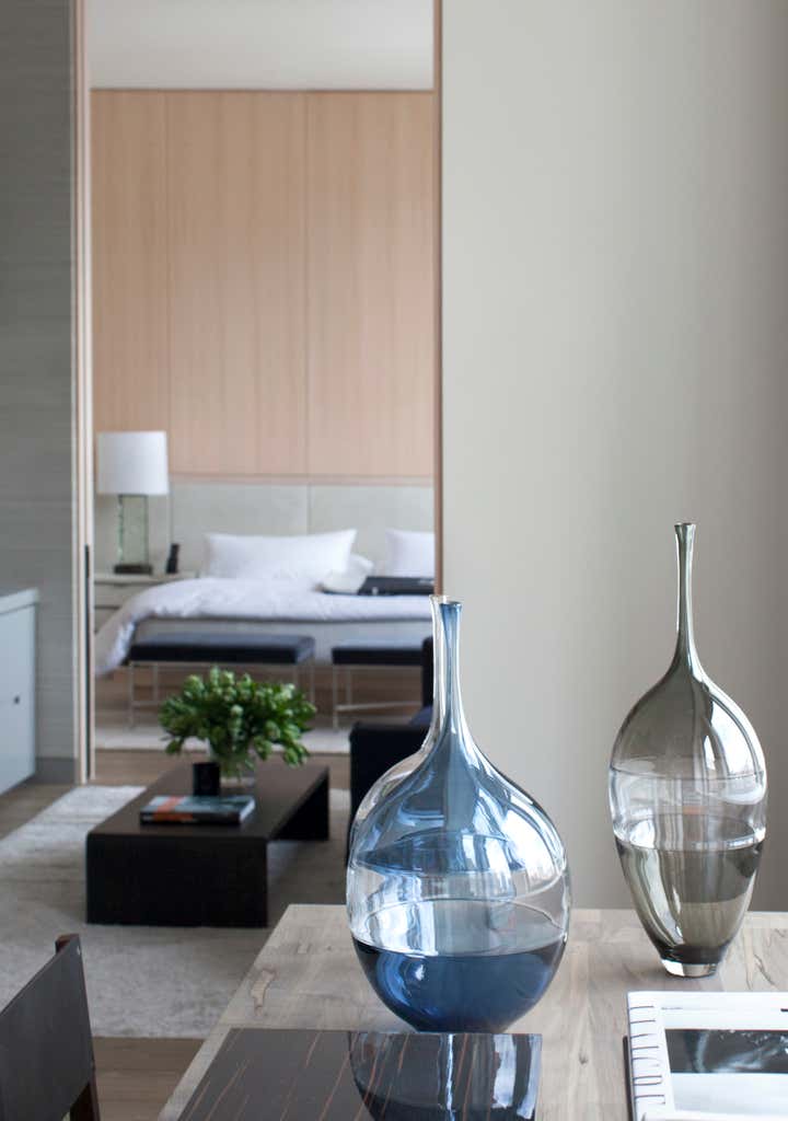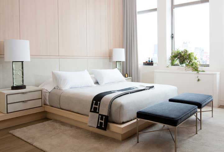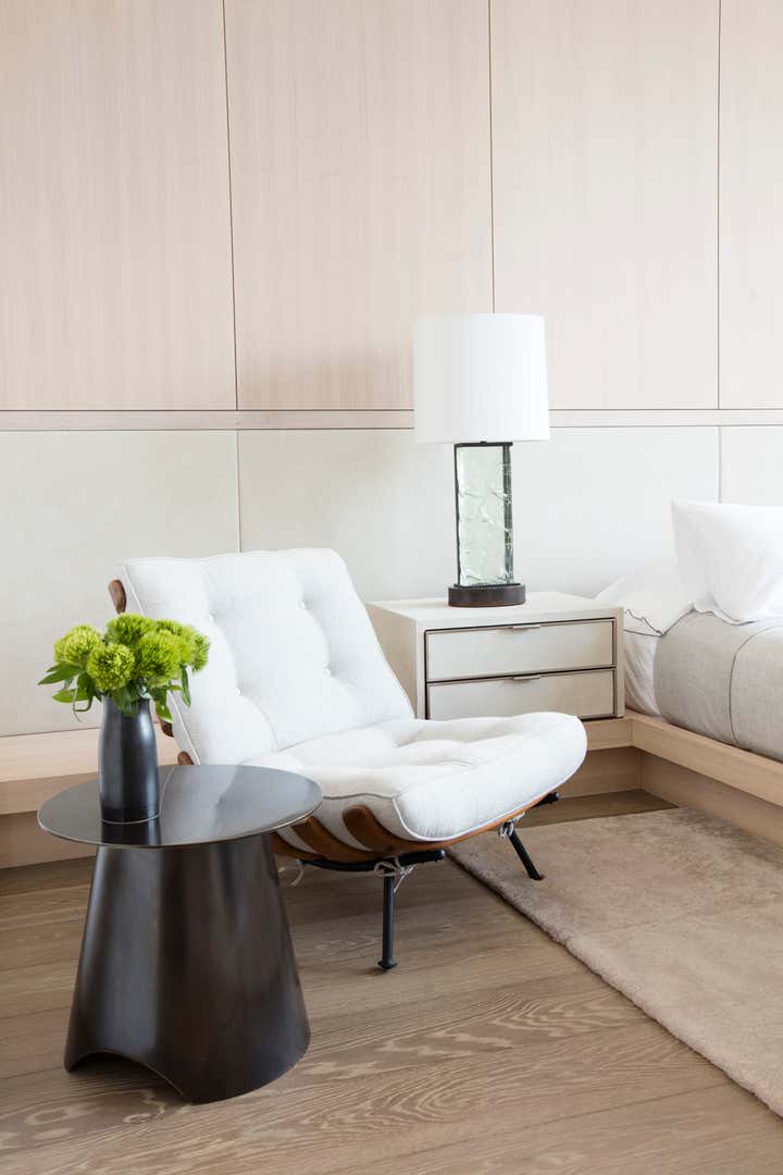 The Chelsea Apartment was an alteration of a 1,500-square-foot Manhattan apartment. The living room and bedroom are connected by a den with floor-to-ceiling pocket doors. Custom bleached walnut casework that extends from the living room to the bedroom is contrasted by a dramatic black-and-white kitchen with blackened oak casework and Calacatta Marble. Tall ceilings, soft white walls, and views of the Empire State Building create a backdrop for modern and luxurious furnishings that are understated and livable.