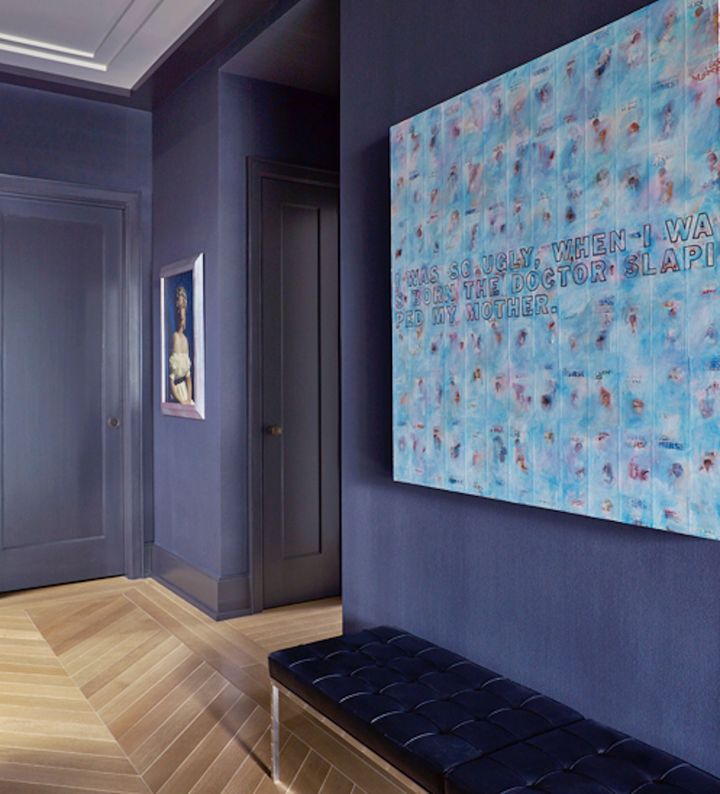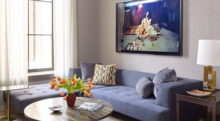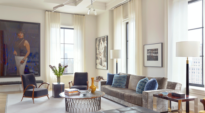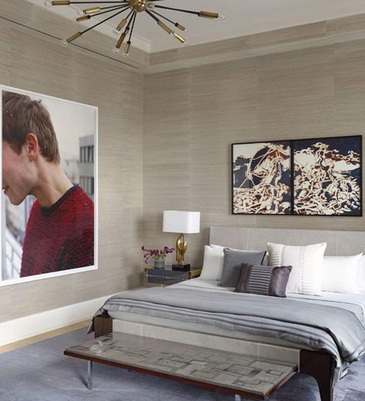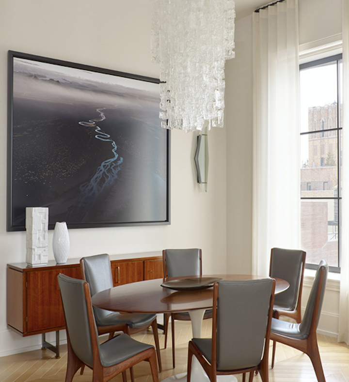 Located in Walker Tower, an architectural landmark in Manhattan’s Chelsea neighborhood – this light-filled two bedroom home showcases exceptional vintage furnishings combined with bespoke upholstery and case goods. Enhanced by an eclectic art collection featuring works by Cindy Sherman, Wolfgang Tillman, Ed Ruscha, Vik Muniz, and Nan Goldin, combines with the design scheme to create an environment that feels curated rather than decorated; accentuating the dramatic tonal contrast interiors while striking a balance between light and shadow. Textured wall finishes, sumptuous textiles and area rugs complete the neutral backdrop, while sculptural lighting animate the spaces with a playful quality.