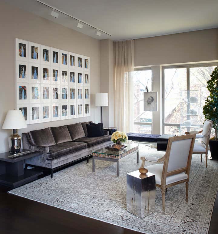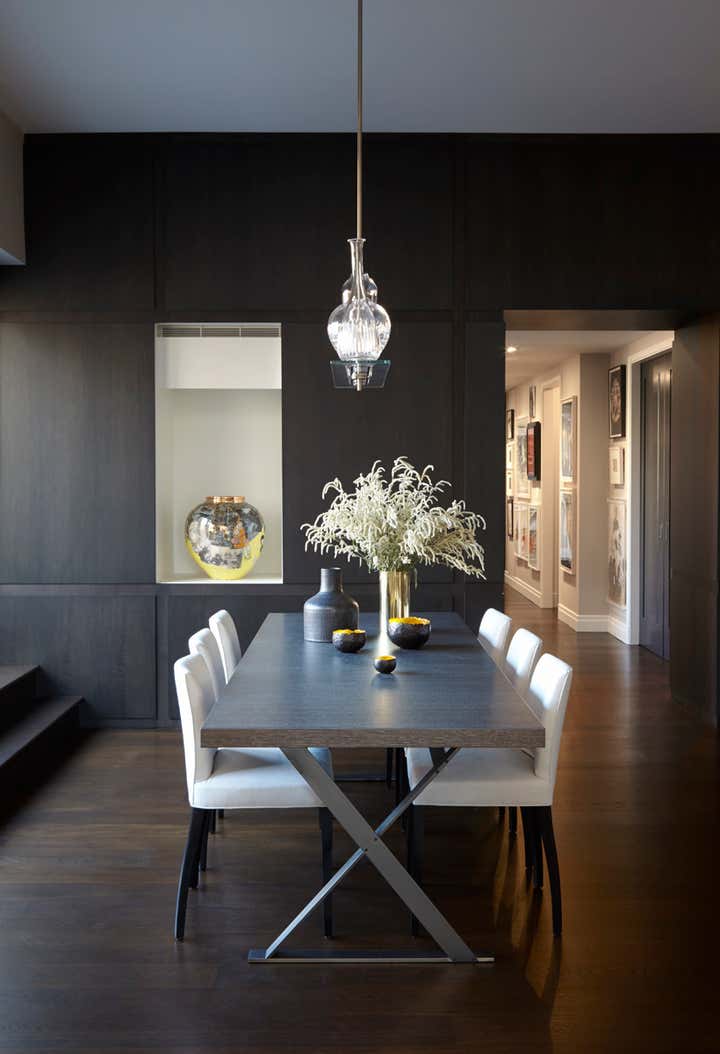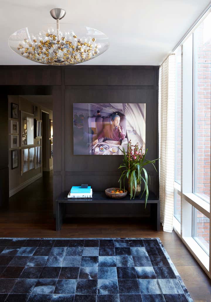 Designed for a young family, this four-bedroom apartment in Chelsea was renovated and decorated to highlight the couple’s extensive art collection. Ebony stained oak paneling and floors are contrasted with parchment colored walls to create a dynamic yet subtle backdrop to highlight the art hanging creatively throughout. Hung tightly in a stacked gallery style, in small clusters or singly, the display of the collection varies to allow the viewer greater appreciation of the works. Art is even integrated into the decoration with easels and display niches, commissioned pendant lighting and an abstract coffee table for the living room. Mixing old and new, the more traditional furnishings create a sophisticated blend of French antiques, mid-century classics and contemporary pieces. Taken all in, the home balances living with such an extensive art collection with an ease and casualness that reflects the client’s lifestyle.