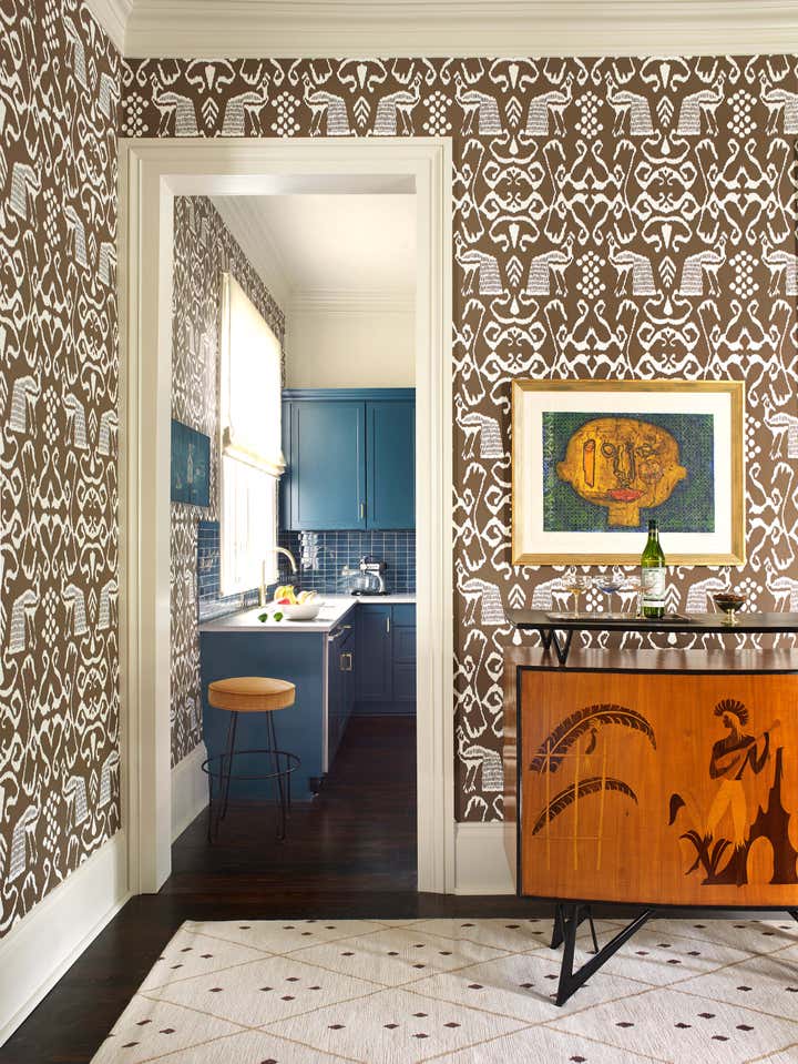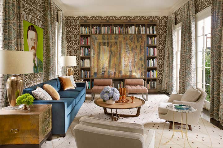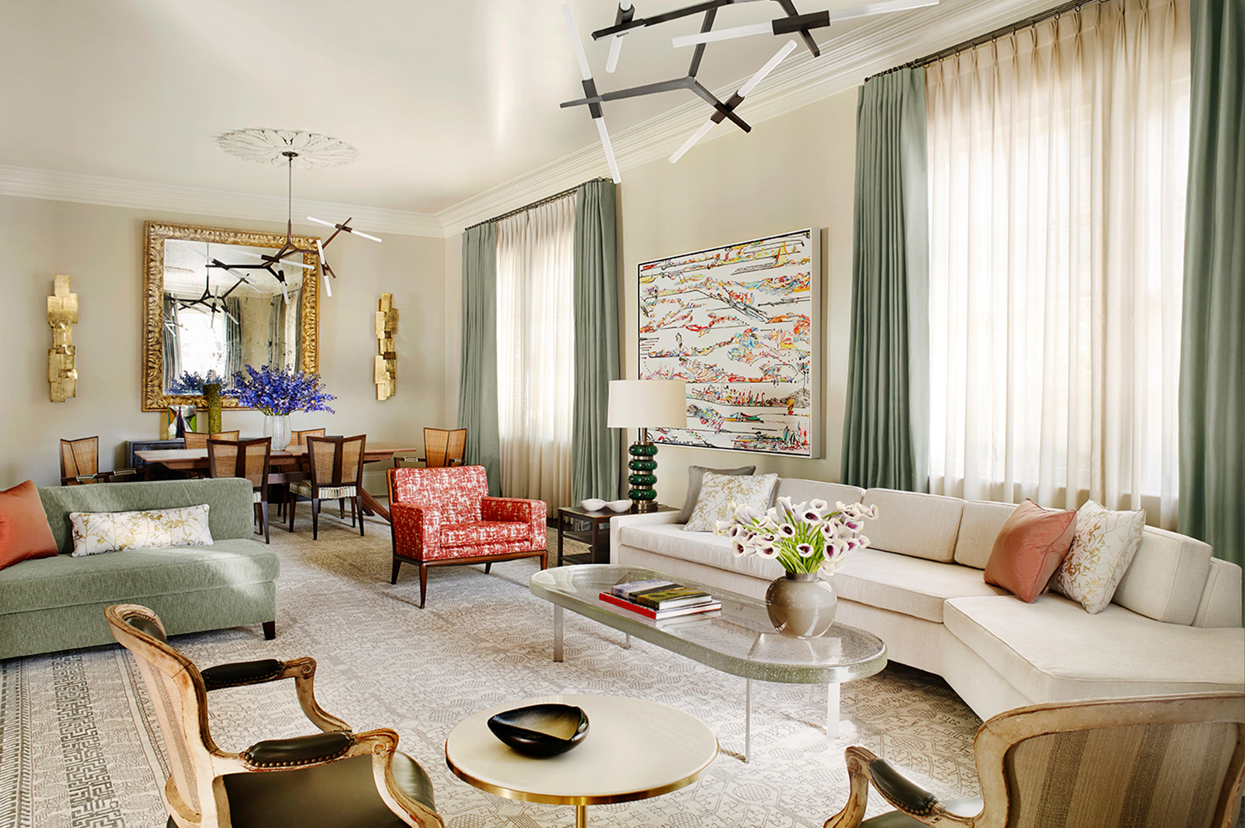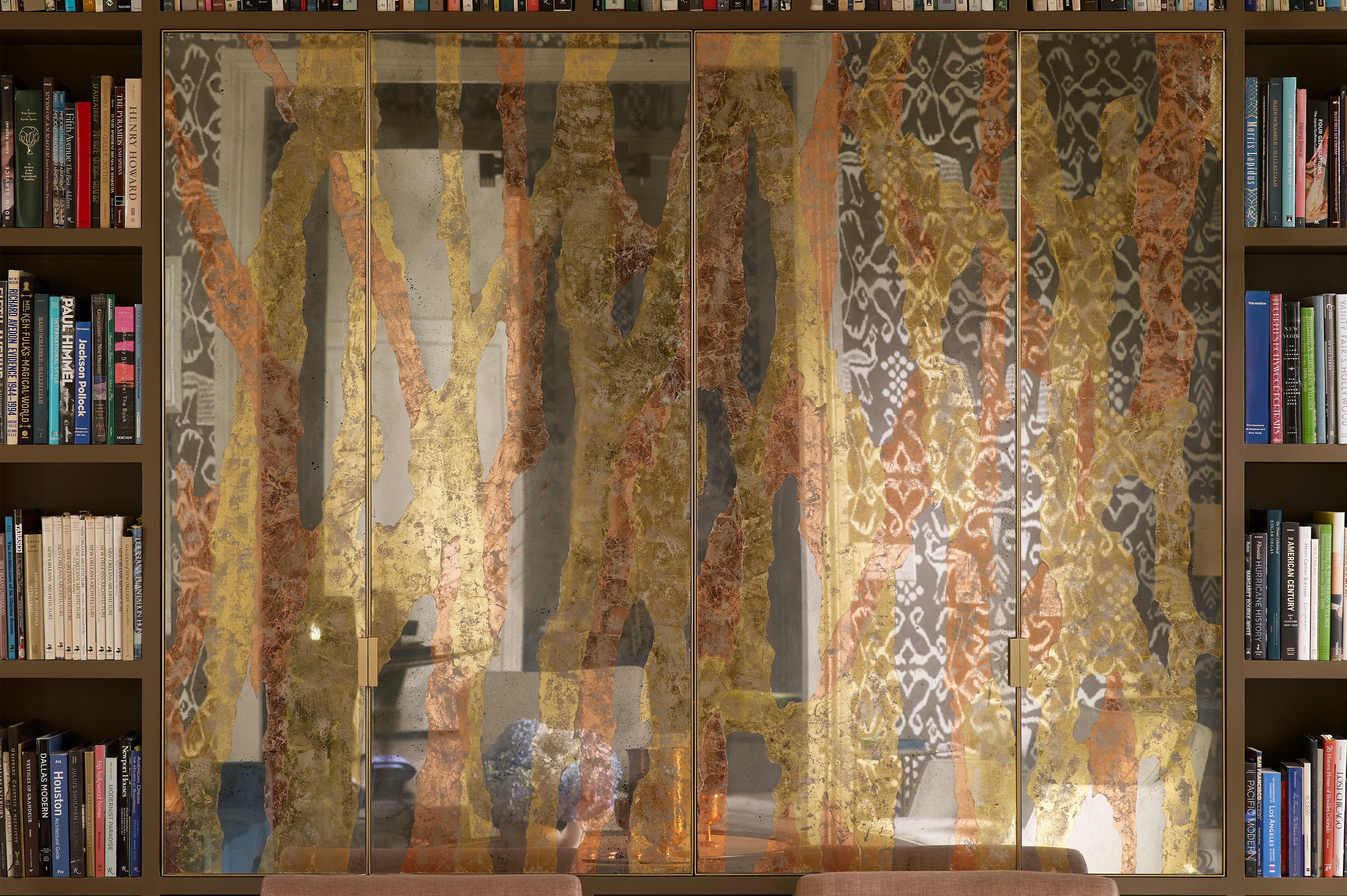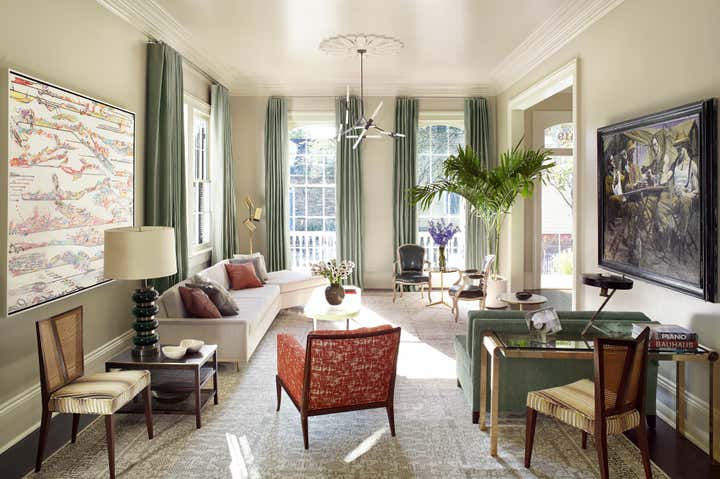 A collaboration with Bell Architects in an 1850 Garden District home resulted in a more open floor plan with custom millwork and new bathrooms and kitchen. The interior features a mix of bespoke furniture, carpets and lighting paired with mid-century modern and antique pieces. Two former parlors were combined into a new, enlarged living/dining room that are anchored by Lindsey Adelman chandeliers and period-derived plaster medallions. While the public rooms embrace a club-like richness of layered patterns and bold colors, the upstairs balances a dramatic cork-and-gold study and gold-leaf ceiling with a serene primary suite of cool blues vintage Venetian glass.
