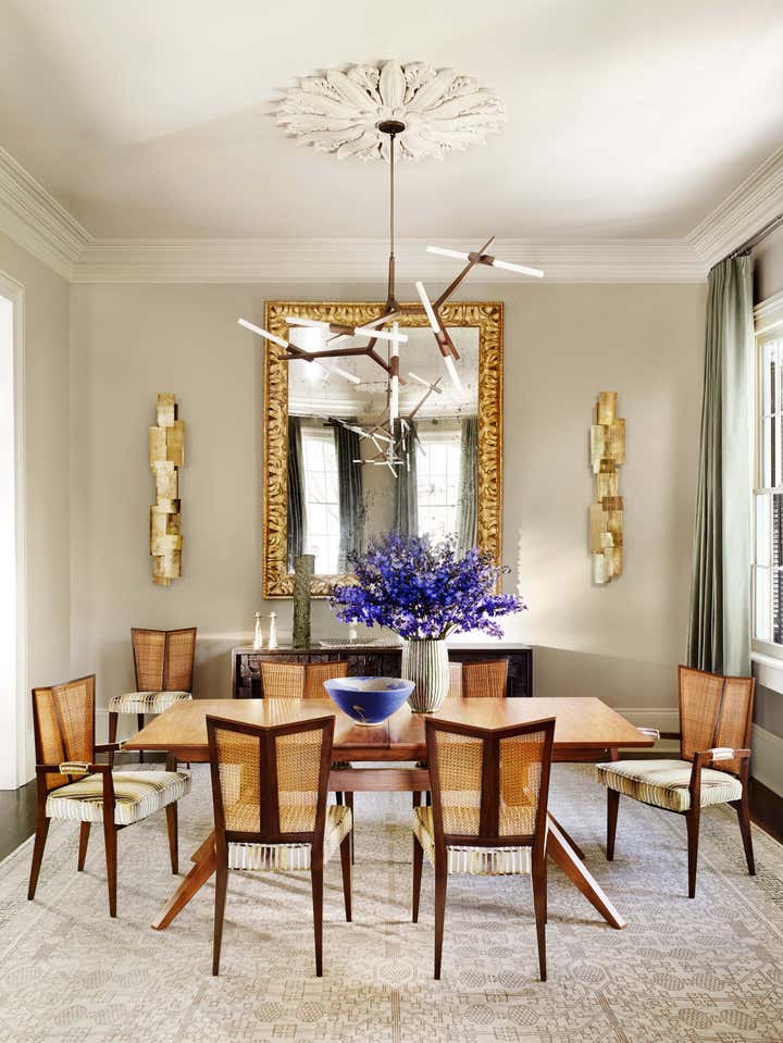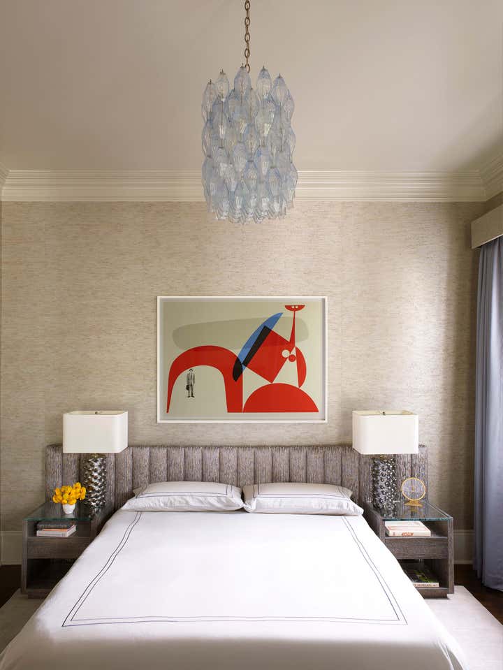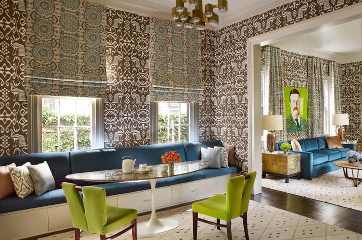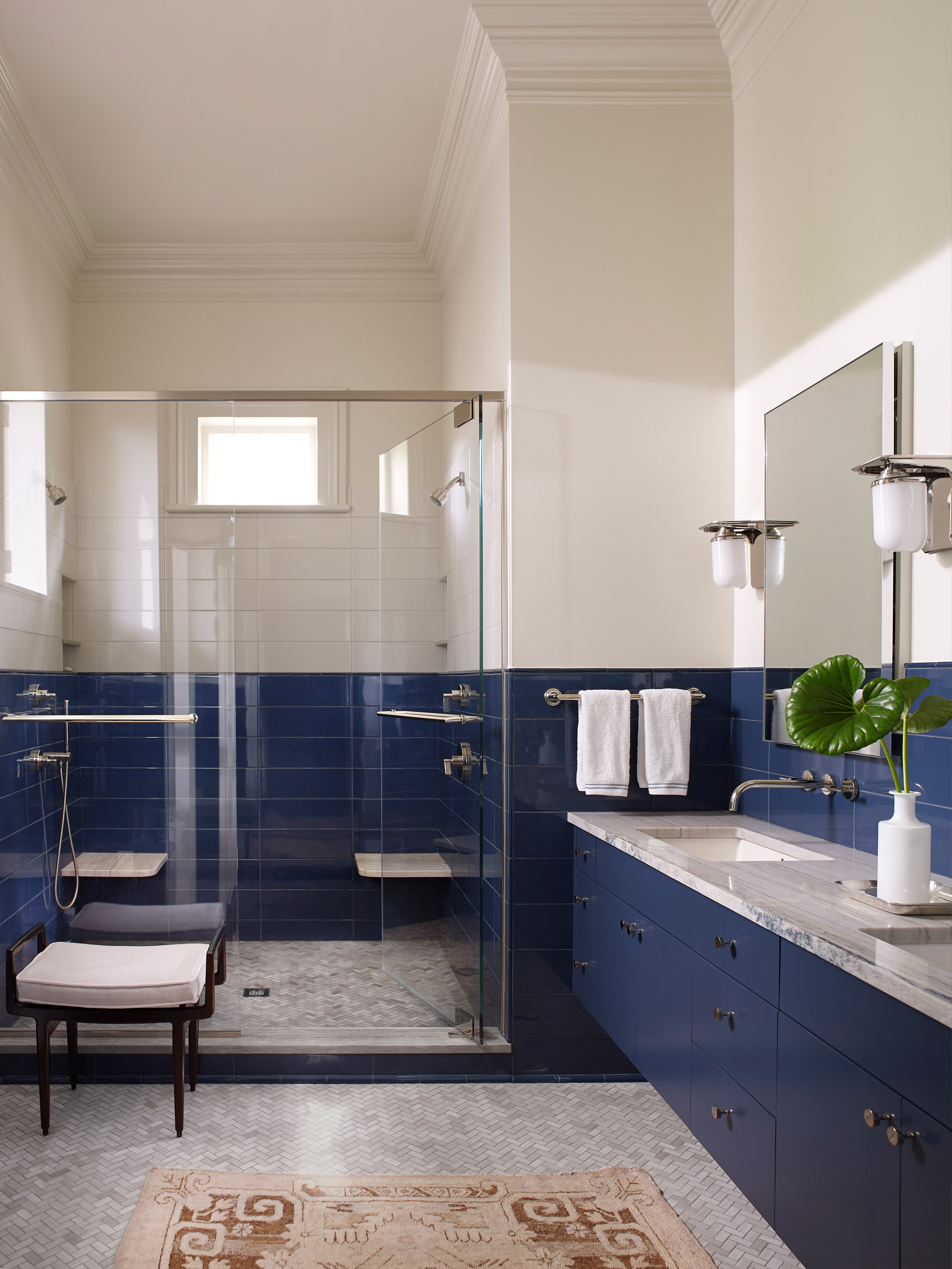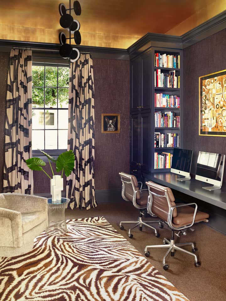 A collaboration with Bell Architects in an 1850 Garden District home resulted in a more open floor plan with custom millwork and new bathrooms and kitchen. The interior features a mix of bespoke furniture, carpets and lighting paired with mid-century modern and antique pieces. Two former parlors were combined into a new, enlarged living/dining room that are anchored by Lindsey Adelman chandeliers and period-derived plaster medallions. While the public rooms embrace a club-like richness of layered patterns and bold colors, the upstairs balances a dramatic cork-and-gold study and gold-leaf ceiling with a serene primary suite of cool blues vintage Venetian glass.