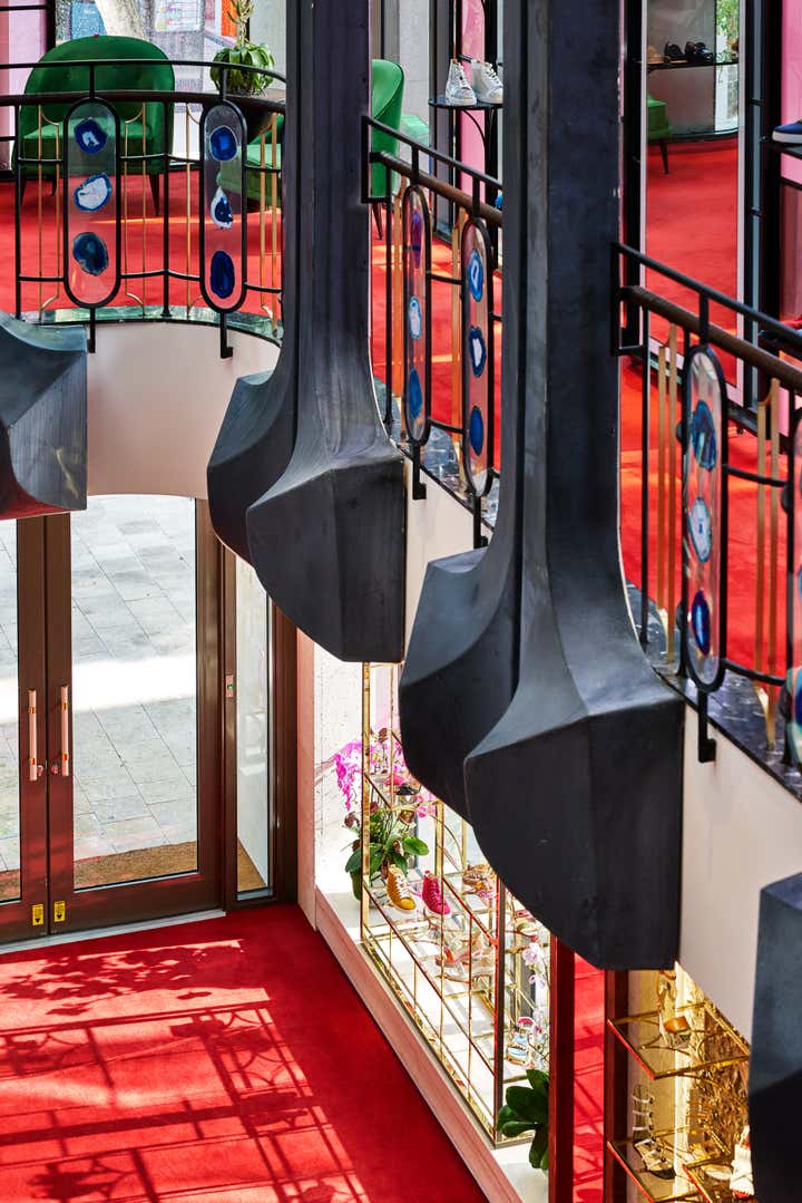 Christian Louboutin Miami Flagship in the Design District: The exterior is completely clad in Poplar tree bark, while the interior has softer bark walls of white birch, gold birch and pin cherry accents. The materials have softened and enriched a lot of the interior design, allowing the material s natural beauty to resonate. We tried to keep the use of the materials simple by puzzling various patterns of bark or relentlessly coating entire surfaces to create a new painting of nature as a back drop to the elegant sculptures of each of Christian s shoes. Other sustainable efforts include: - the use of reclaimed facade panels from a 1970 s Parisian office building line the mezzanine and create a dramatic colonnade to the main two story space - a dramatic, tiered skylight atop the double height space provides ambient indirect light throughout the day (inspired by the Musee des Colonies in Paris) - all bark has been harvested to keep the trees in tact; a platinum category was created by Cradle to Cradle to celebrate the product s environmental efforts.