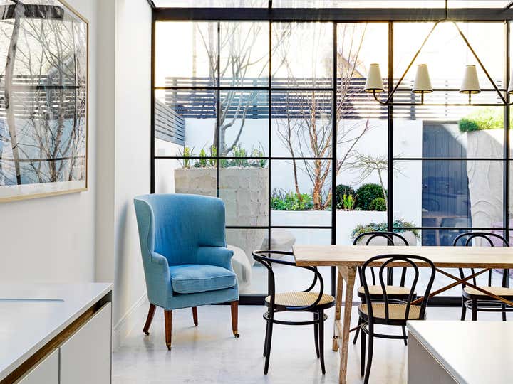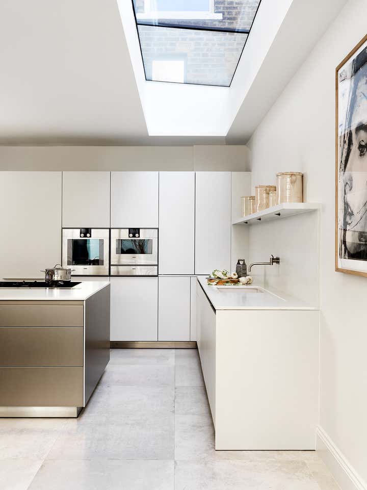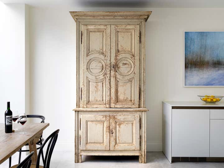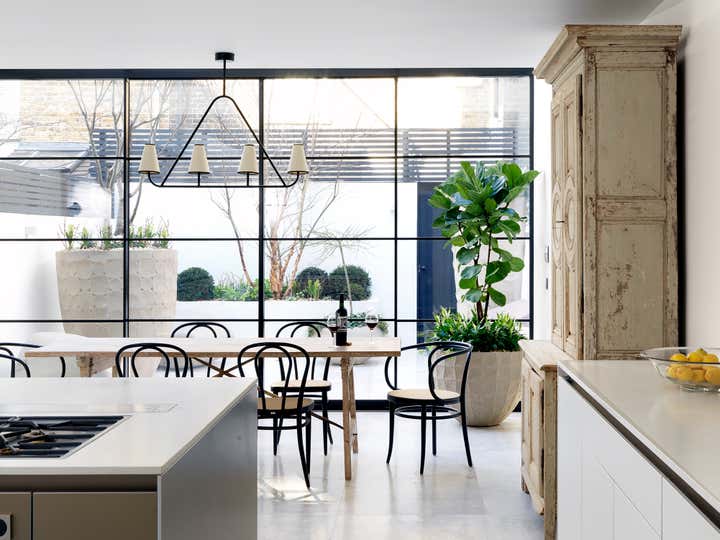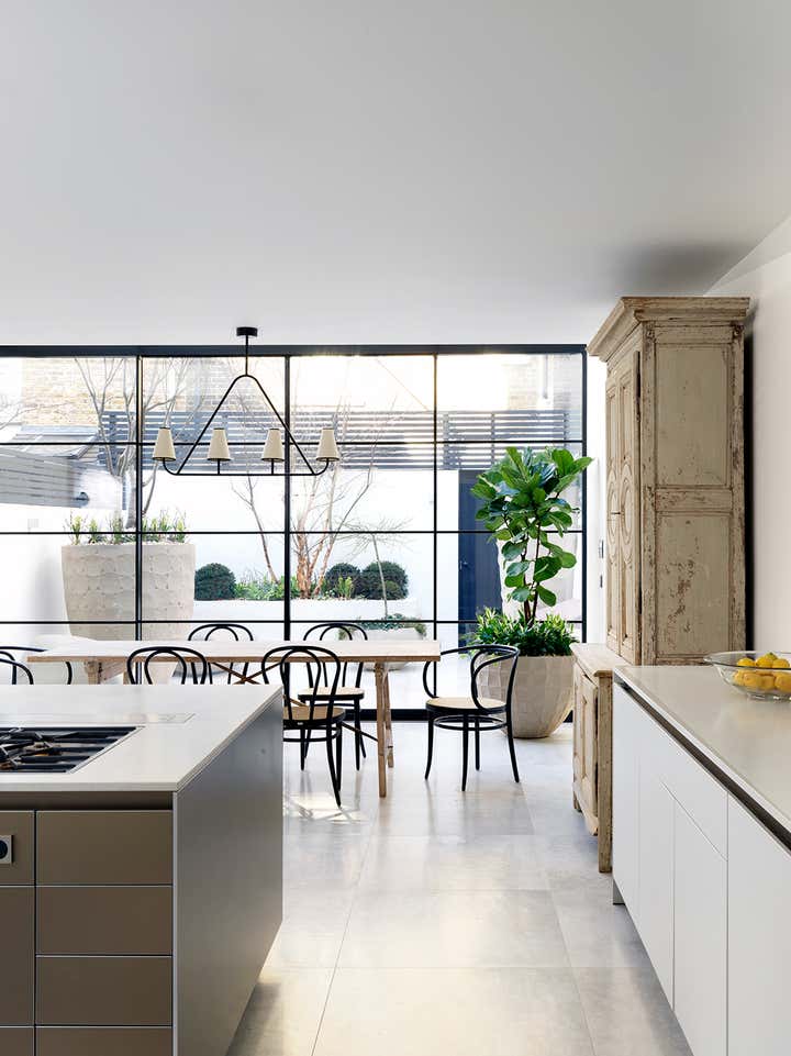 This family home in the heart of London was a wreck. Working alongside the architect we reconfigured the layout to create an open plan kitchen/dining area leading onto the small garden at the back, created by Stephen Woodhams. The house is pared back, as per the client s wishes utilising some wonderful antique pieces sourced at brocantes and antique fairs around the countryside.