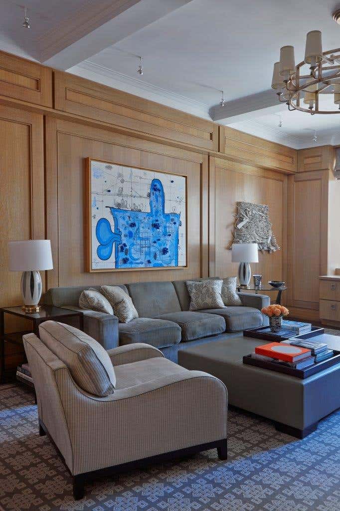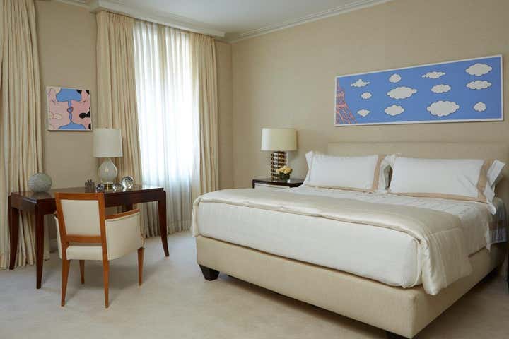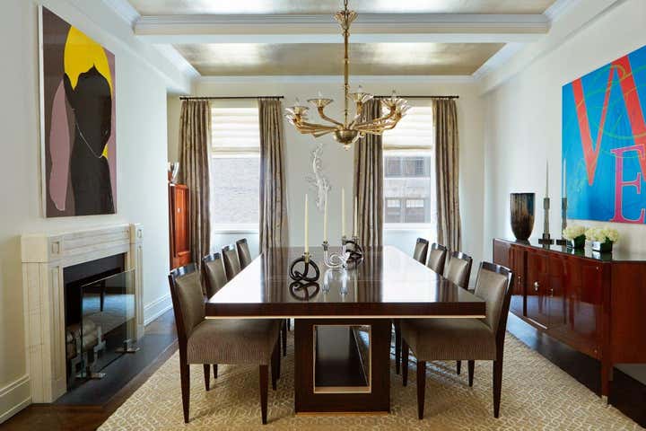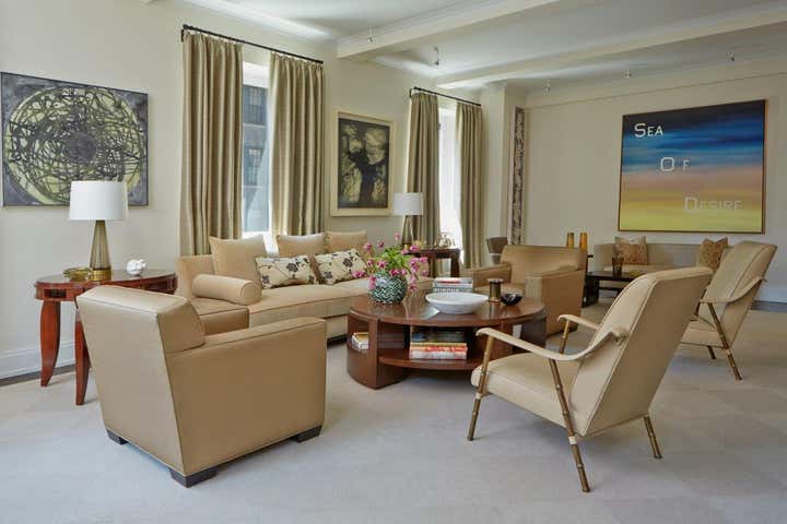 A highly orchestrated collection of neutrals and rich wood finishes designed to showcase contemporary art. The spacious living room has three seating areas, the most ample ideal for entertaining is centered in the room. A large dining table capable of extending is Macassar wood with ivory and brass trim sitting on a silk and wool trellis patterned rug. Upholstered walls of linen and silk blend in the master bedroom envelope it with quite intimacy.
