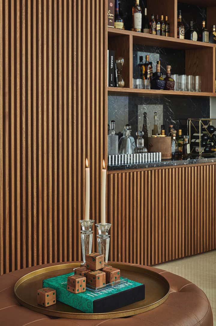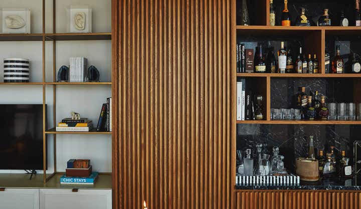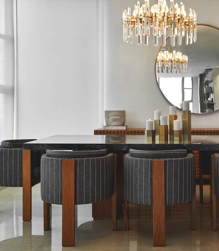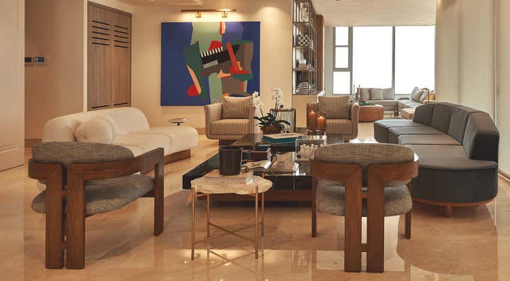 The mix of custom furniture with designer objects such as the Fendi candleholders and Hermes wallpaper, make of this contemporary ambiance an intriguing yet welcoming space. This open-space apartment concept design was built into an area of 300sqm and features Michelangelo marble coffee tables, geometric mirrors and colorful art by Panamanian artist, Ana Elena Garuz. The wood paneling hides a private elevator.