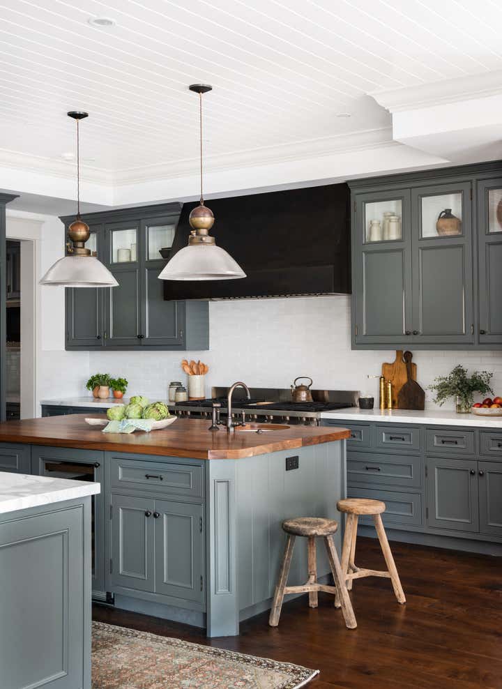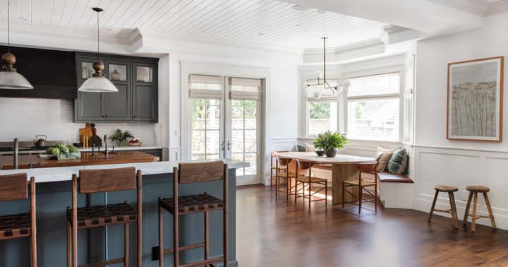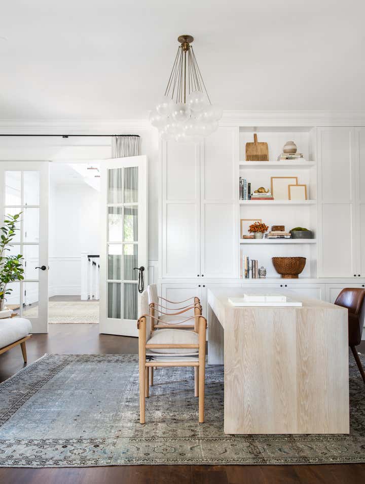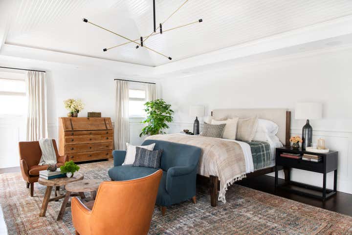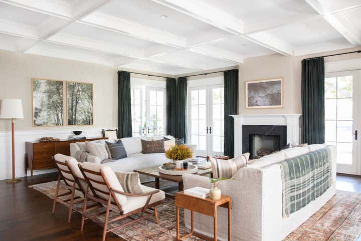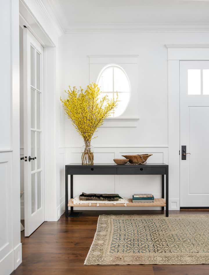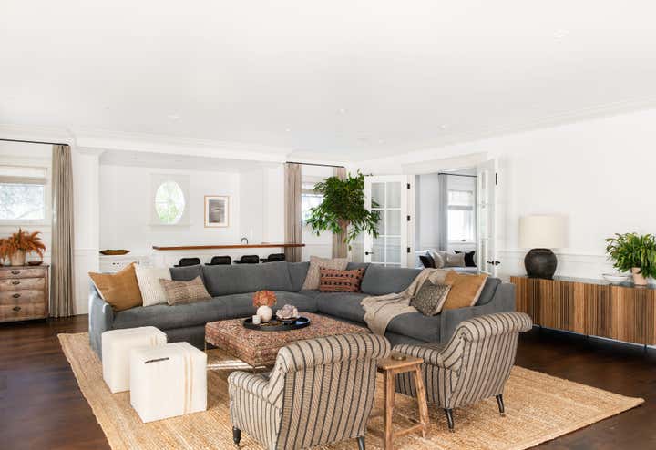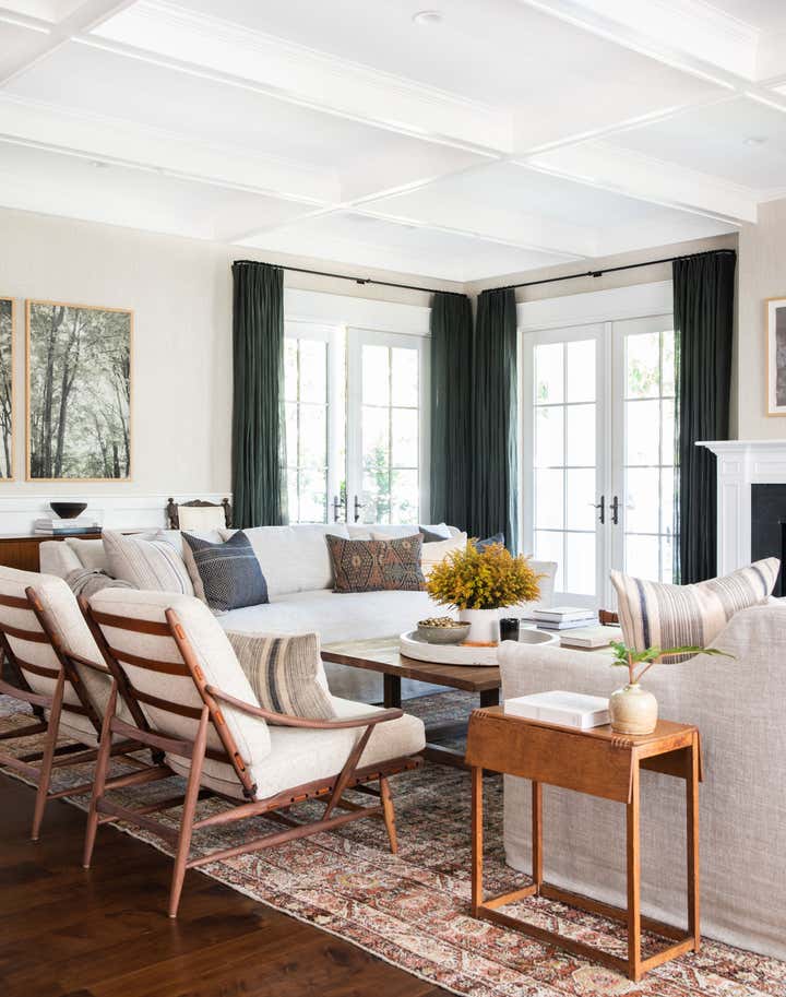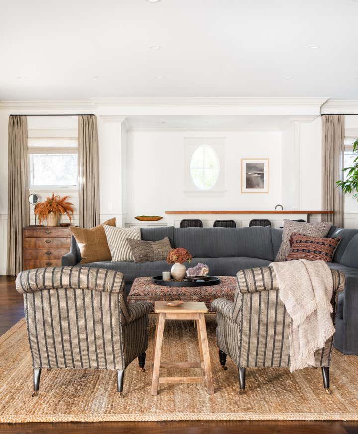 A traditional white box family home update featuring a homey layered feel with lots of texture and warm tones.