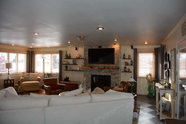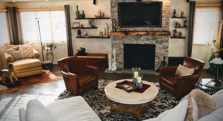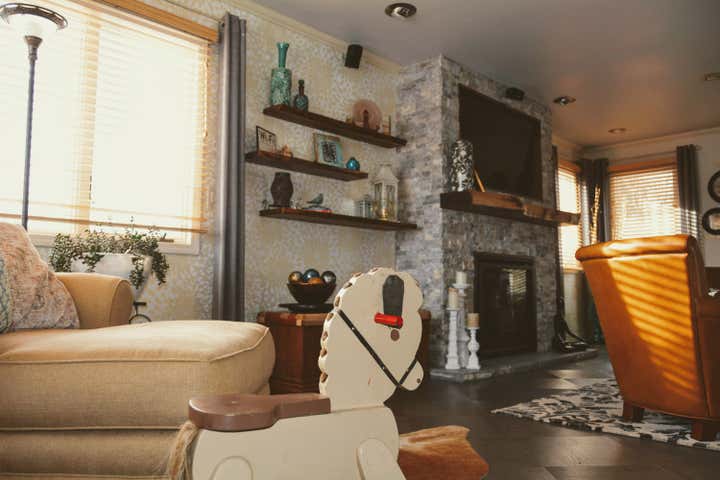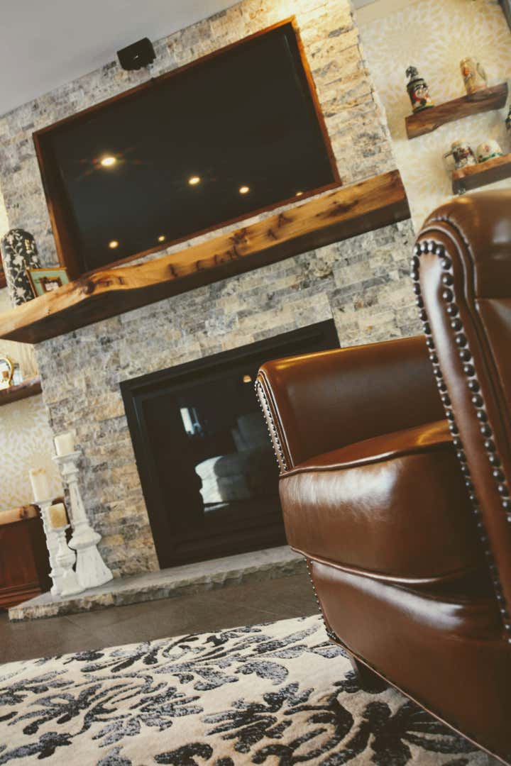 To create a clear delineation of spaces without losing the openness they had originally worked so hard to achieve, we chose to add a fireplace feature to the current empty wall, use wallpaper in a contemporary and vibrant color to draw the eye, and install window coverings to warm up the space and dampen sound. By adding some lighting in the ceiling that mimicked our floor plan, we were able to define further the different areas without bulky furniture, and a similar approach was used with the rug placement. Touches of contemporary were brought in to tone down the heaviness of some of the vintage furnishings, and the whimsical pattern of the wallpaper kept the space light and fun. We sourced a one-of-a-kind raw edge mantle made of Black Walnut from the area. The grey stone hearth mimics the live edge pattern with its hand-chipped edge, and the rough-hewn stacked stone in a variety of whites and greys brings an added texture and depth to the pop-out section, further defining the living room area.