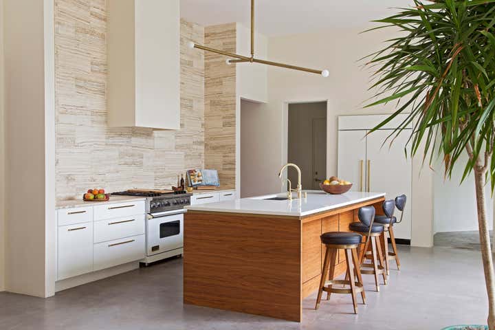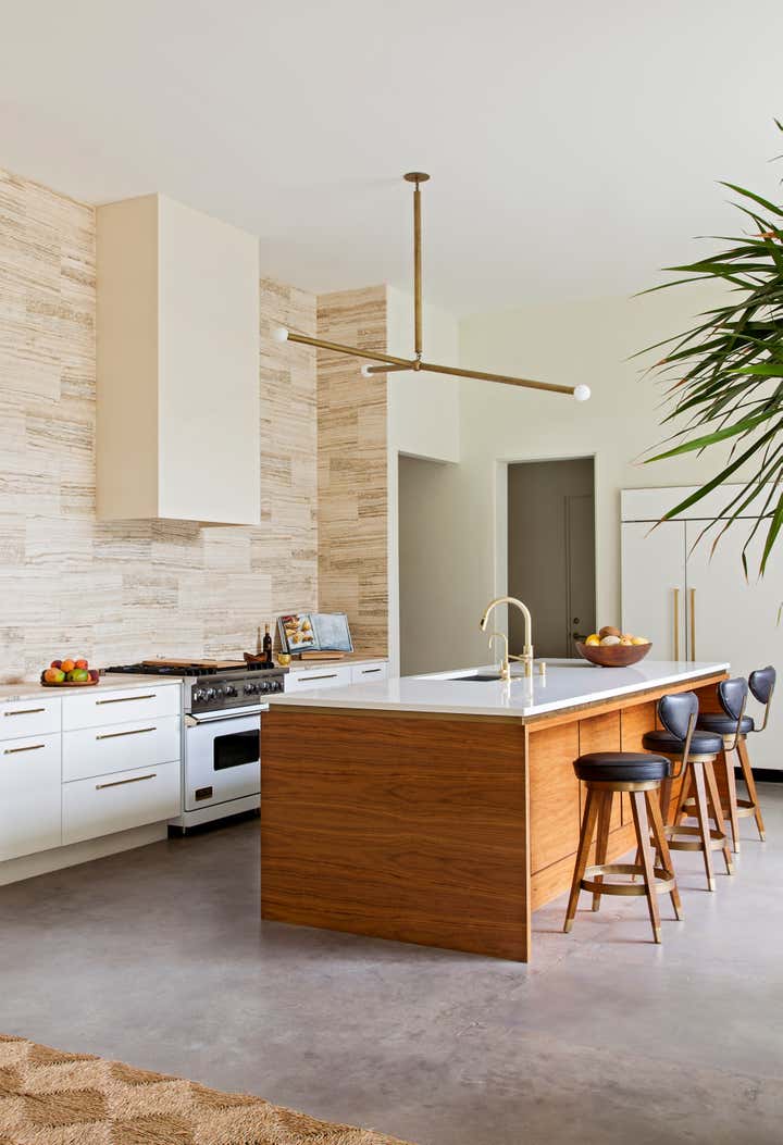 The renovation and design of this 1950 s home involved moving the kitchen from the side of the house where there was less light to the back of the house while adding a wall of glass overlooking the pool.