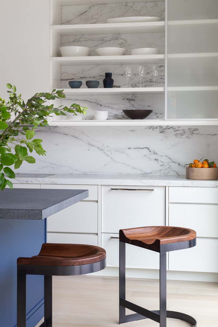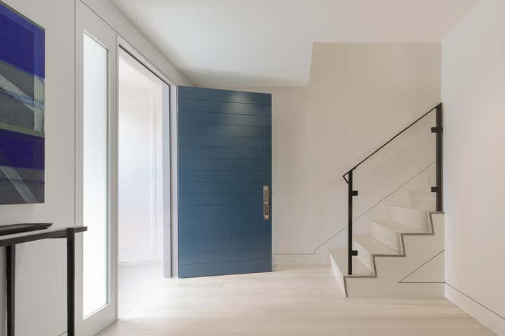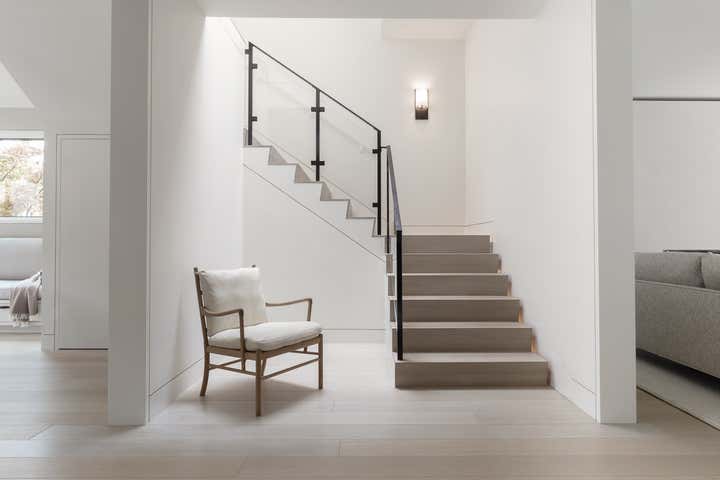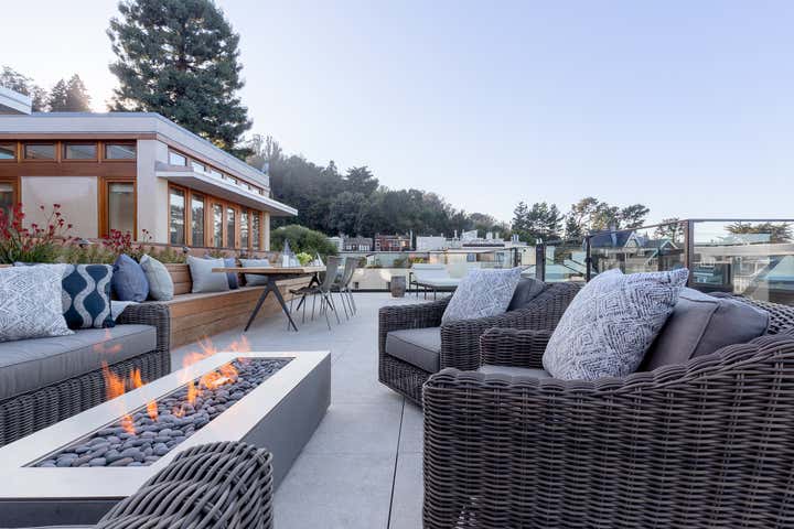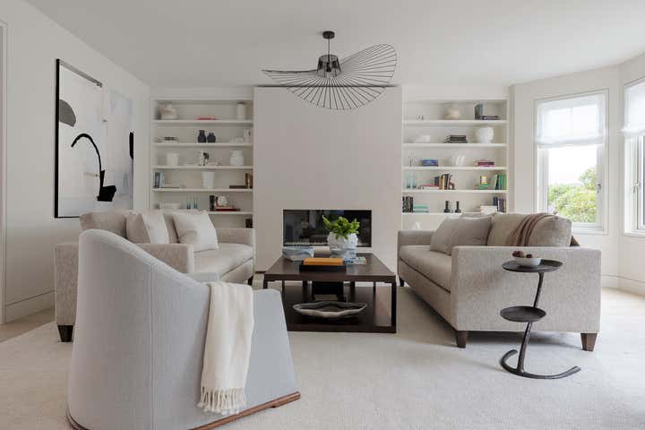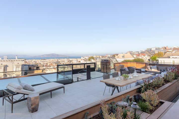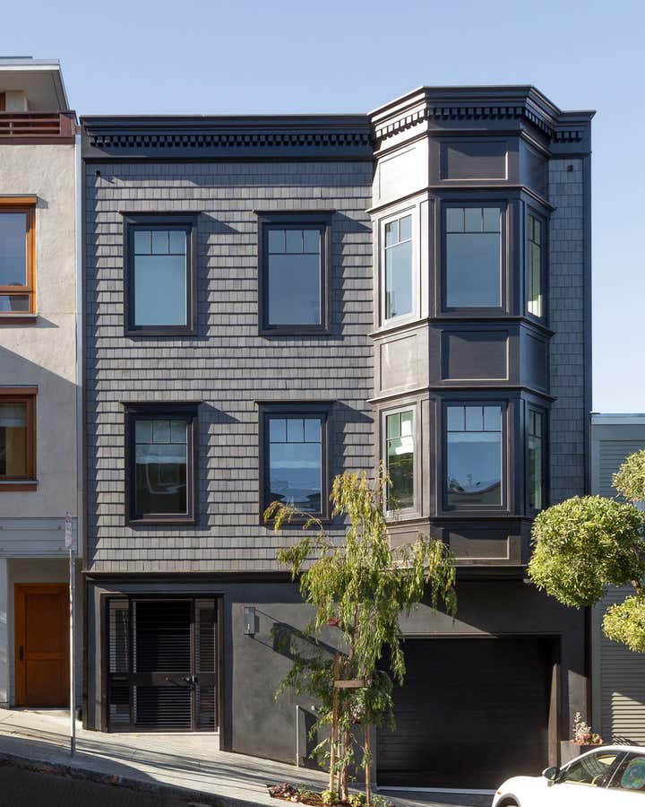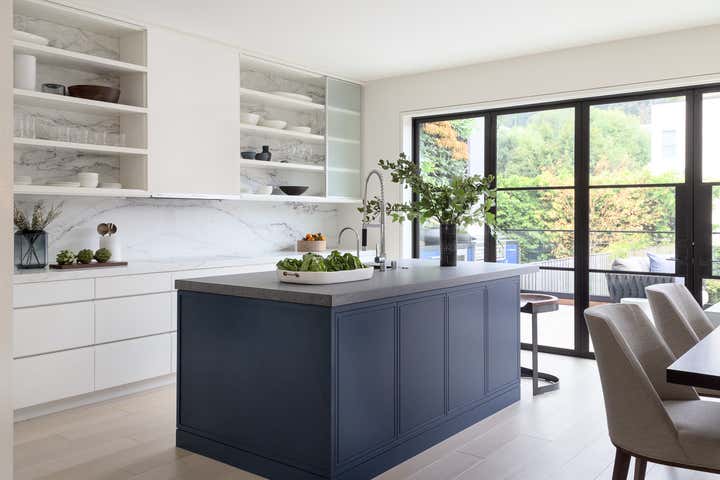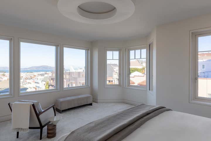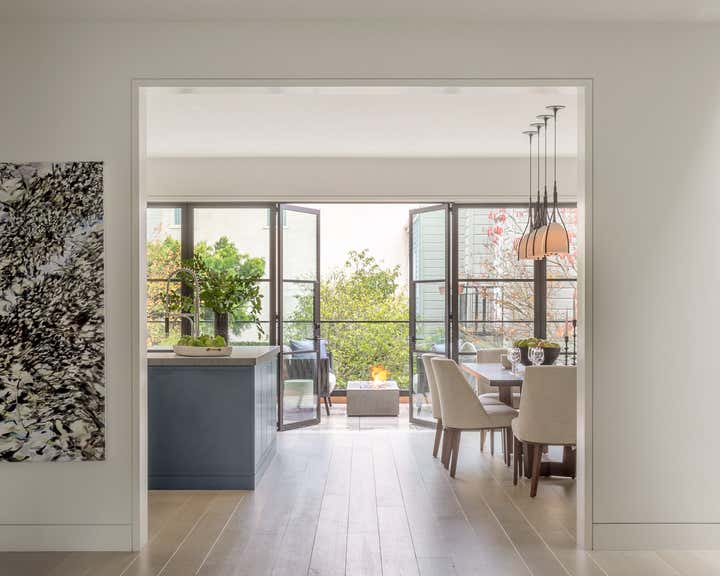Heather Hilliard Design and Sutro Architects completed an extensive interior and exterior renovation and decoration of a historic house in SF. To provide warmth to the minimal envelope, HHD specified rich materials including wide bleached white oak floors, hand applied smooth plaster at the fireplace, large warm honed stone slabs for all floors and walls in the bathrooms, suede textured granite on the kitchen island, large white veiny slabs of Calcutta on the kitchen counters, rift oak custom millwork throughout and fabric upholstery at the master bed wall. A notable feature is the light reveal between the stair treads and wall all the way up the staircase. The indirect light creates a warm glow that guides the eye up the stairs. Originally from the east coast and Germany, the clients embraced their new California lifestyle and requested a plan to bring the outside inside wherever possible. In the kitchen, large steel frame and glass doors open all the way up, blurring the lines of inside and outside. New wide picture windows in the bedroom frame the view of the the city. A large sliding glass skylight slides open at the top of the stairs to reveal a roof deck with a fire pit and expansive views of the bay. Large steel frame doors/windows were installed in the home office and off the media room to maximize views and access to the new lush backyard. To reflect the clients’ informal and immensely warm family dynamic, HHD suggested a neutral palette with pops of blue to keep the house feeling young and fresh. Every inch of this house was customized to suit the clients’ needs. The furnishings are a mix of custom and high-end pieces by master furniture makers. Bathroom walls were clad in stone slabs, LED lights were added to highlight architectural elements including the staircase and fossil niche in the powder room and a rooftop was added to maximize views of the Golden Gate Bridge. The result is a house that reflects the clients’ aesthetic and lifestyle.