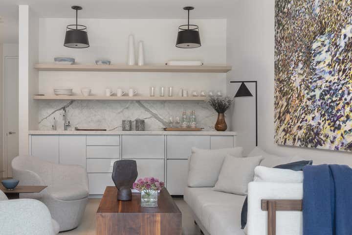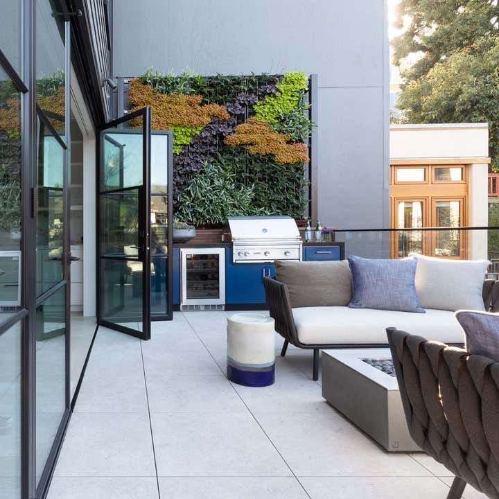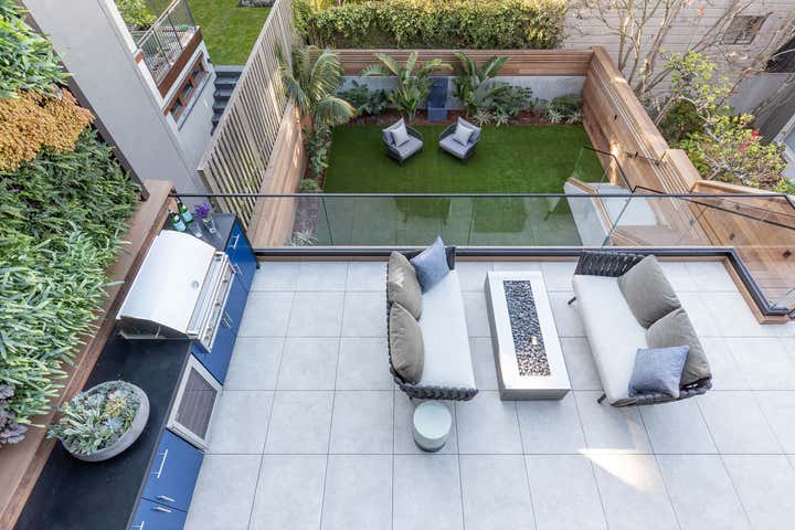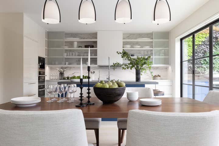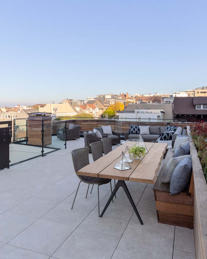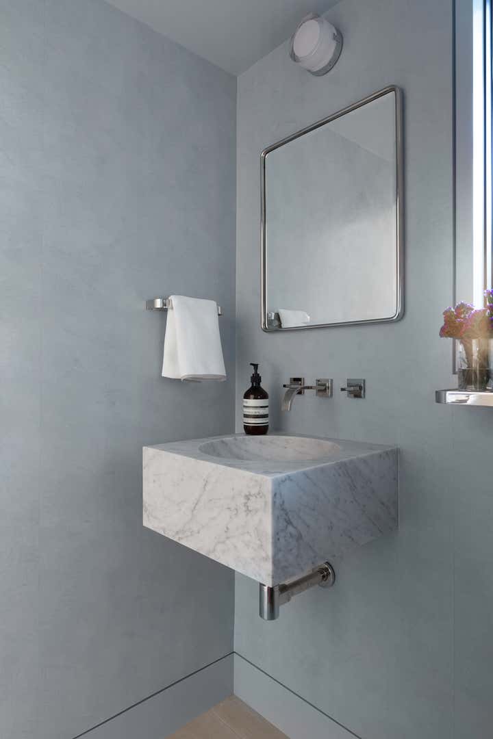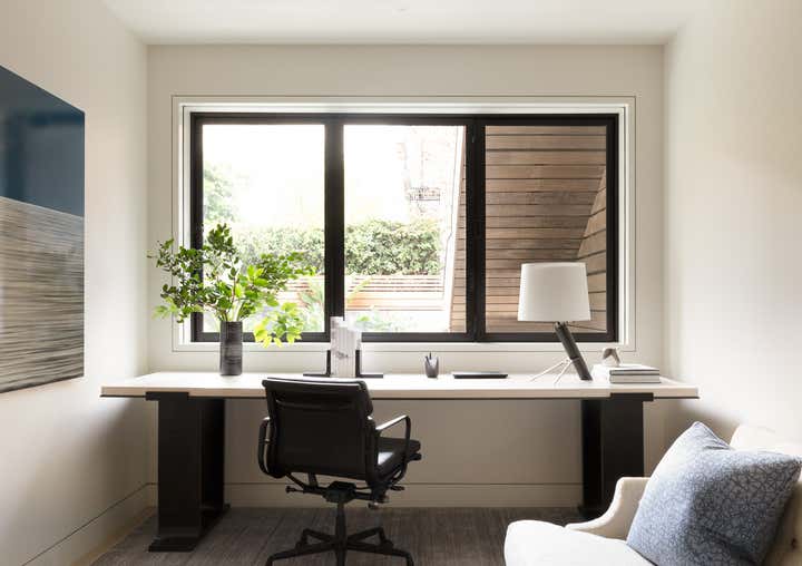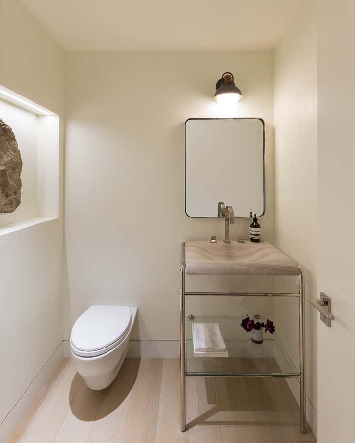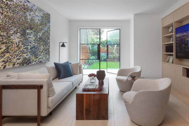 Heather Hilliard Design and Sutro Architects completed an extensive interior and exterior renovation and decoration of a historic house in SF. To provide warmth to the minimal envelope, HHD specified rich materials including wide bleached white oak floors, hand applied smooth plaster at the fireplace, large warm honed stone slabs for all floors and walls in the bathrooms, suede textured granite on the kitchen island, large white veiny slabs of Calcutta on the kitchen counters, rift oak custom millwork throughout and fabric upholstery at the master bed wall. A notable feature is the light reveal between the stair treads and wall all the way up the staircase. The indirect light creates a warm glow that guides the eye up the stairs. Originally from the east coast and Germany, the clients embraced their new California lifestyle and requested a plan to bring the outside inside wherever possible. In the kitchen, large steel frame and glass doors open all the way up, blurring the lines of inside and outside. New wide picture windows in the bedroom frame the view of the the city. A large sliding glass skylight slides open at the top of the stairs to reveal a roof deck with a fire pit and expansive views of the bay. Large steel frame doors/windows were installed in the home office and off the media room to maximize views and access to the new lush backyard. To reflect the clients’ informal and immensely warm family dynamic, HHD suggested a neutral palette with pops of blue to keep the house feeling young and fresh. Every inch of this house was customized to suit the clients’ needs. The furnishings are a mix of custom and high-end pieces by master furniture makers. Bathroom walls were clad in stone slabs, LED lights were added to highlight architectural elements including the staircase and fossil niche in the powder room and a rooftop was added to maximize views of the Golden Gate Bridge. The result is a house that reflects the clients’ aesthetic and lifestyle.