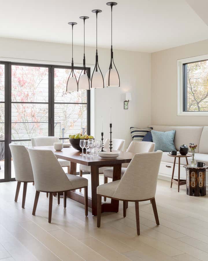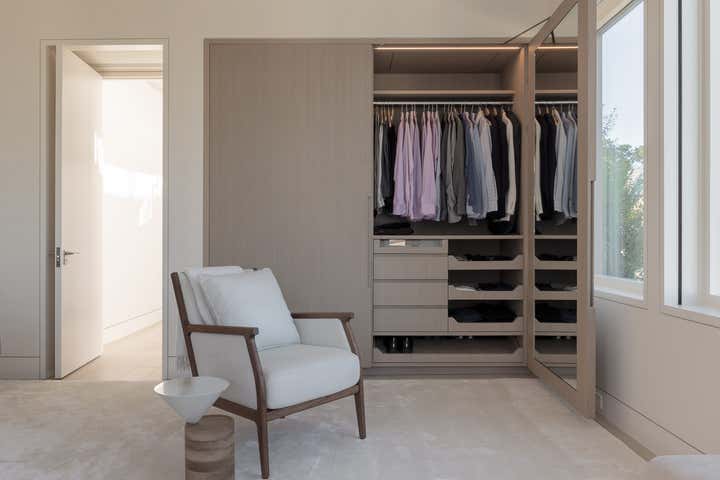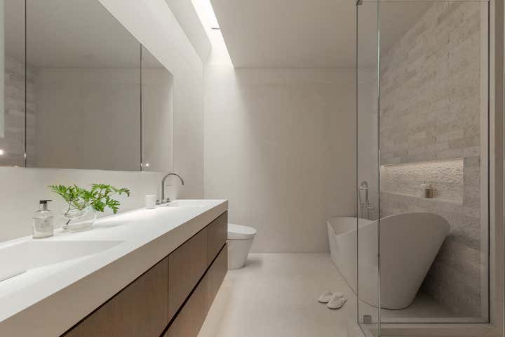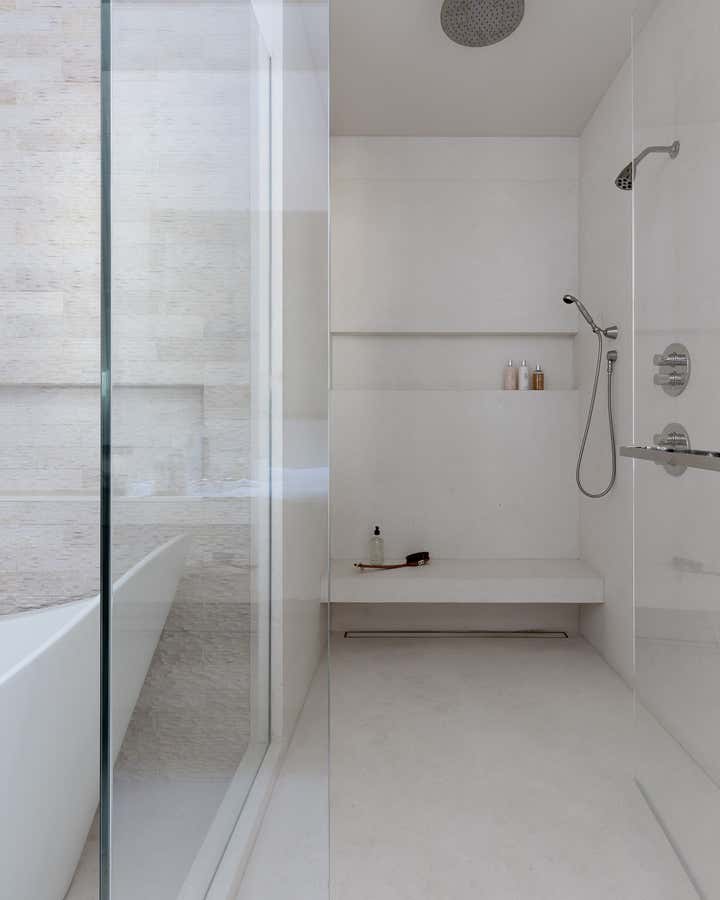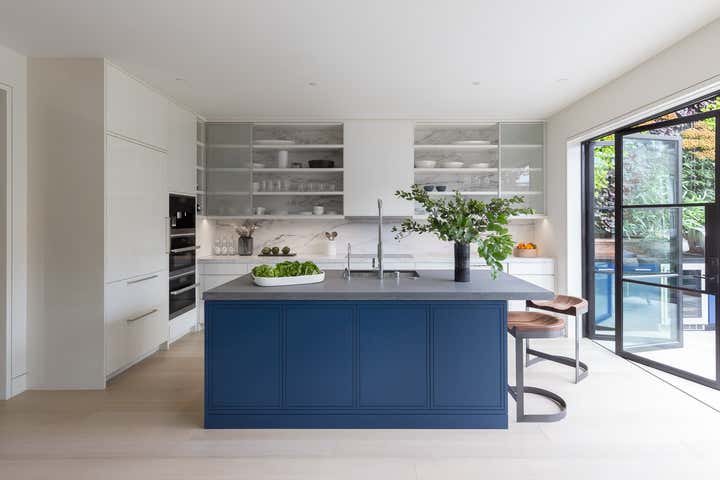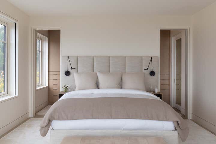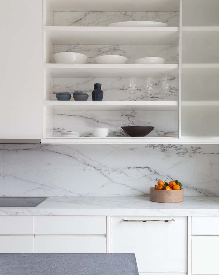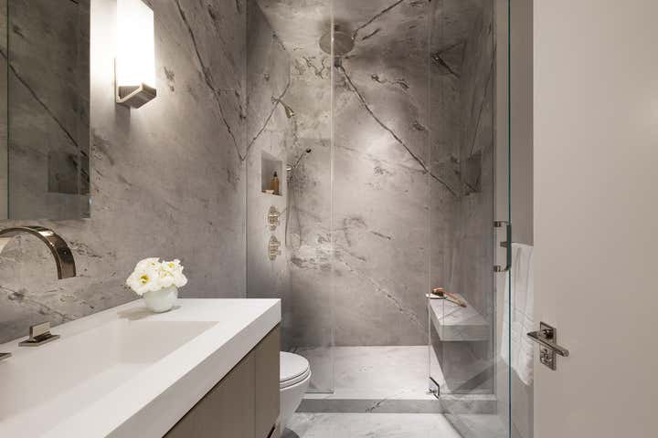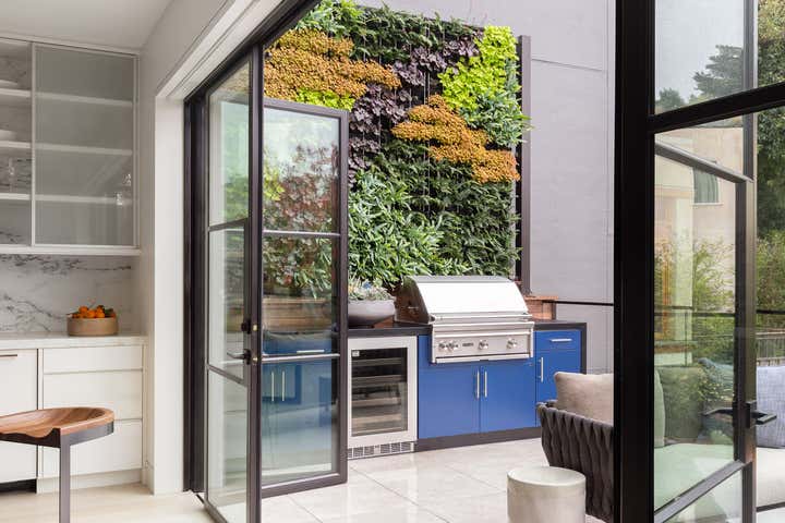 Heather Hilliard Design and Sutro Architects completed an extensive interior and exterior renovation and decoration of a historic house in SF. To provide warmth to the minimal envelope, HHD specified rich materials including wide bleached white oak floors, hand applied smooth plaster at the fireplace, large warm honed stone slabs for all floors and walls in the bathrooms, suede textured granite on the kitchen island, large white veiny slabs of Calcutta on the kitchen counters, rift oak custom millwork throughout and fabric upholstery at the master bed wall. A notable feature is the light reveal between the stair treads and wall all the way up the staircase. The indirect light creates a warm glow that guides the eye up the stairs. Originally from the east coast and Germany, the clients embraced their new California lifestyle and requested a plan to bring the outside inside wherever possible. In the kitchen, large steel frame and glass doors open all the way up, blurring the lines of inside and outside. New wide picture windows in the bedroom frame the view of the the city. A large sliding glass skylight slides open at the top of the stairs to reveal a roof deck with a fire pit and expansive views of the bay. Large steel frame doors/windows were installed in the home office and off the media room to maximize views and access to the new lush backyard. To reflect the clients’ informal and immensely warm family dynamic, HHD suggested a neutral palette with pops of blue to keep the house feeling young and fresh. Every inch of this house was customized to suit the clients’ needs. The furnishings are a mix of custom and high-end pieces by master furniture makers. Bathroom walls were clad in stone slabs, LED lights were added to highlight architectural elements including the staircase and fossil niche in the powder room and a rooftop was added to maximize views of the Golden Gate Bridge. The result is a house that reflects the clients’ aesthetic and lifestyle.