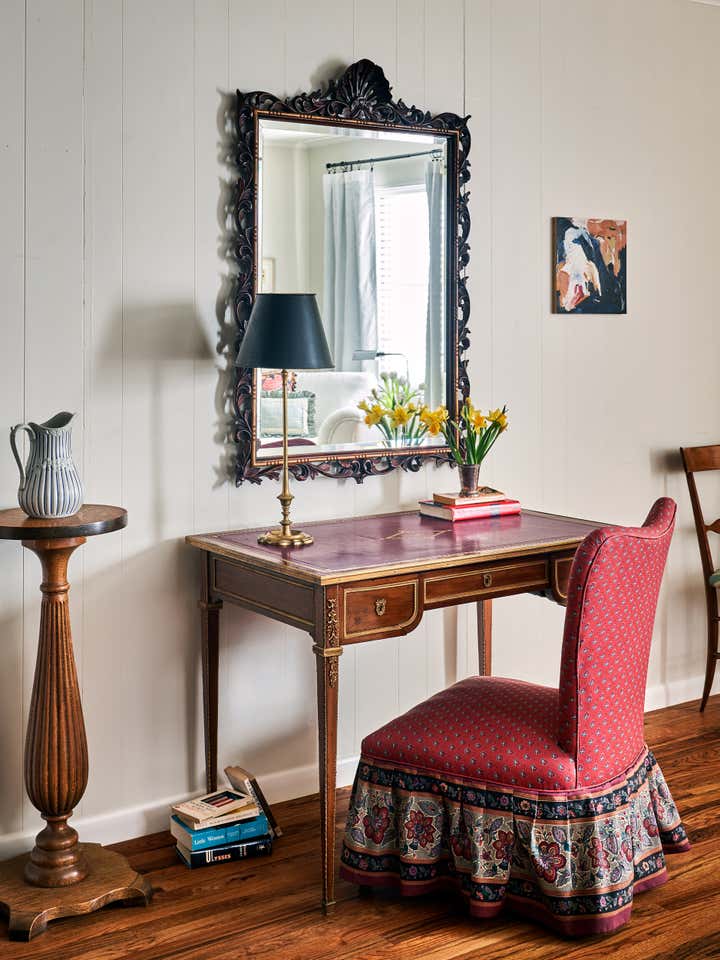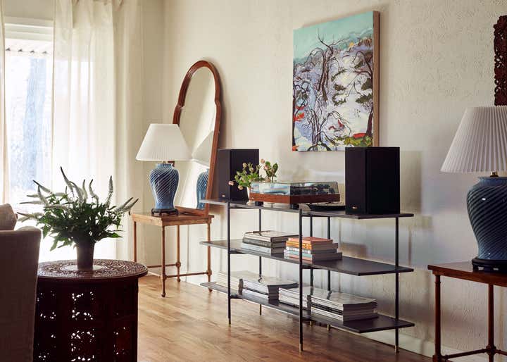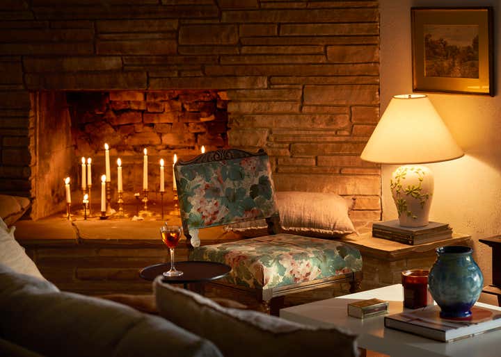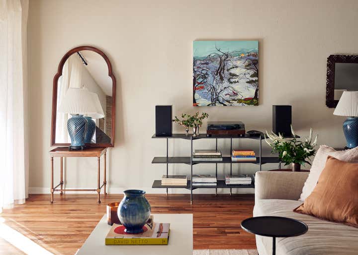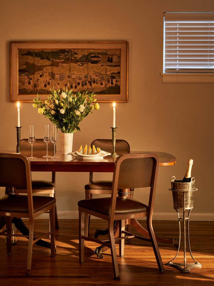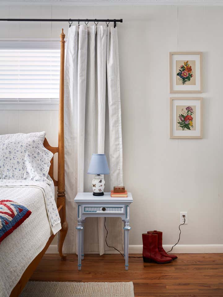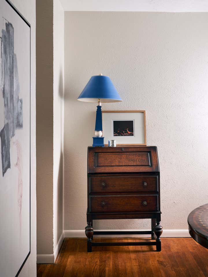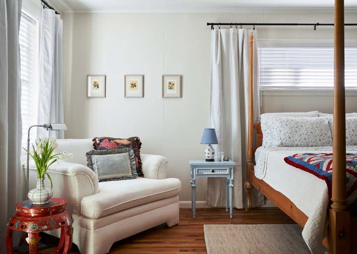This cozy mid-century bungalow prompted a scheme centered on a comfortable, sexy reinterpretation of Americana. Red, white and blue find their way into rooms in sometimes unexpected ways, weaving a common thread throughout the home. Funky lamps, vintage quilts and cartoonish silhouettes imbue fun and personality.