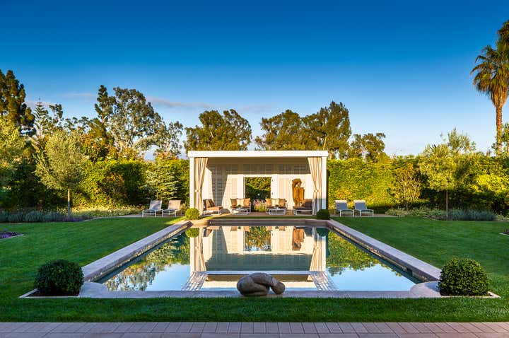 We were approached by the owners of a world-renowned home furnishings company to renovate their 5,000 square foot home located in the Birnam Wood community of Montecito, CA. The original home, which was initially designed by our firm in 1970, was ready for a compete makeover. The entire exterior façade has been transformed into a modern take on classical design that includes textured stucco with panel relief details, wood windows doors, and manicured landscaping. The interior maintains a certain level of sophistication with comfortable living spaces washed in natural daylighting through skylights, and kitchen paneling that sports a Chanel vibe. The living room is on a direct axis with the rear yard swimming pool, which has a simple freestanding cabana at the other end of the axis.