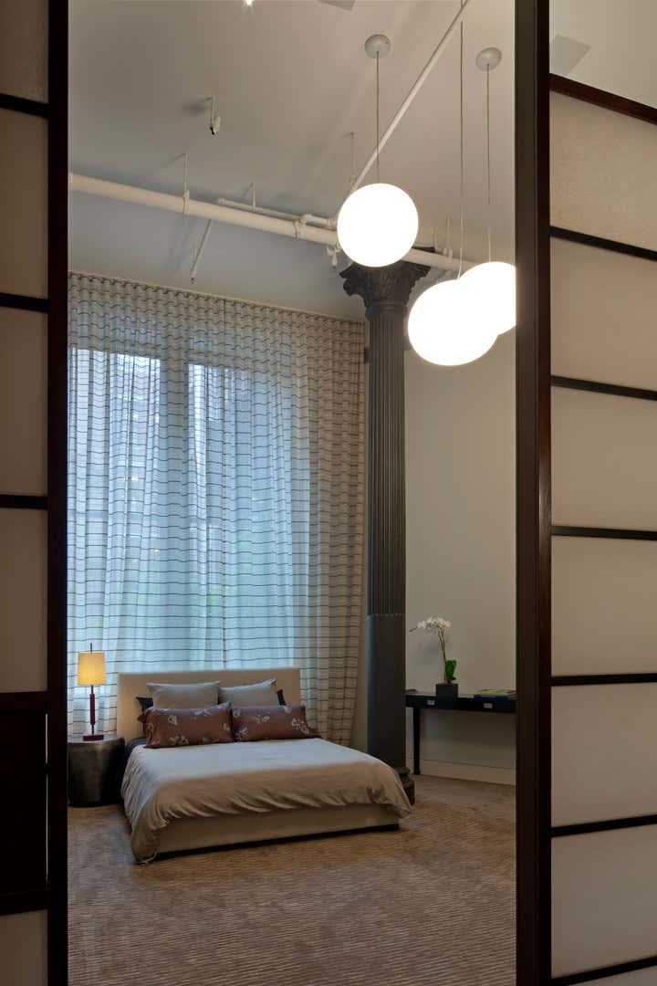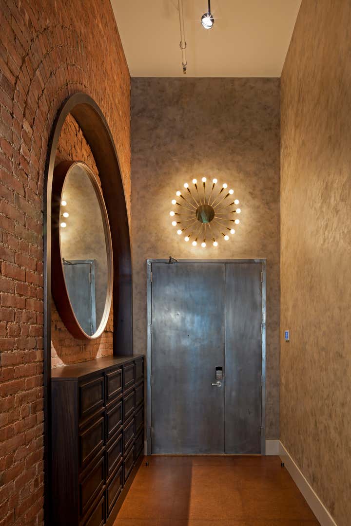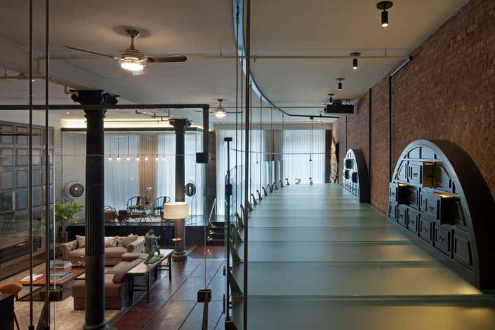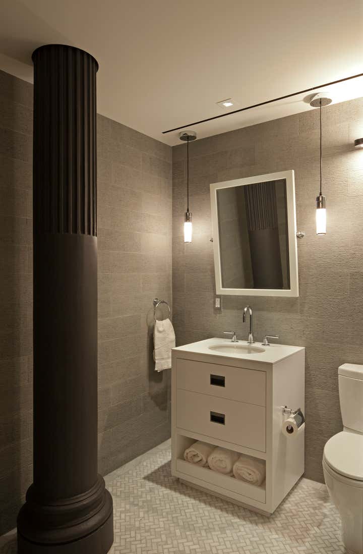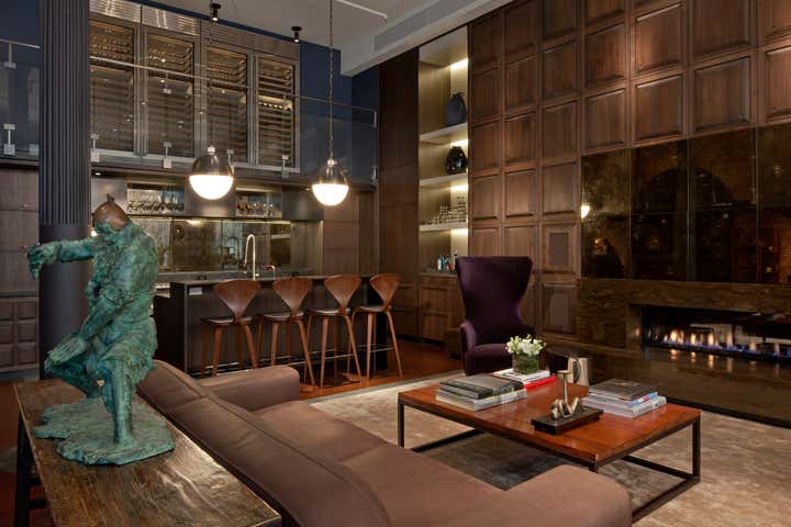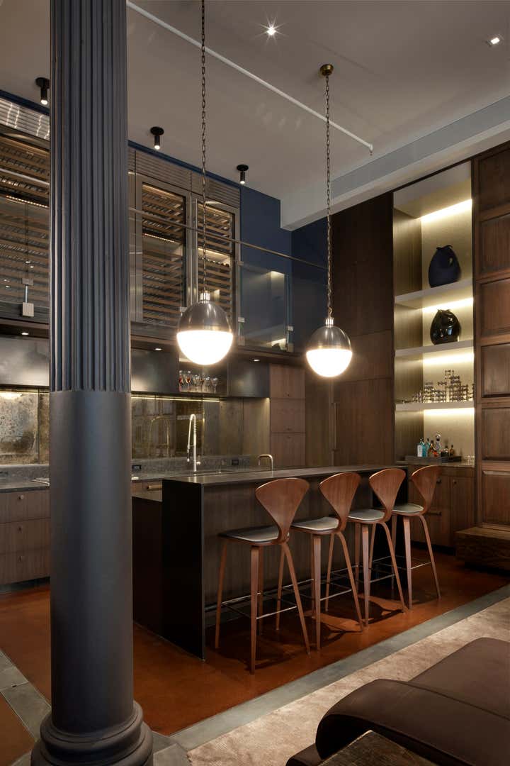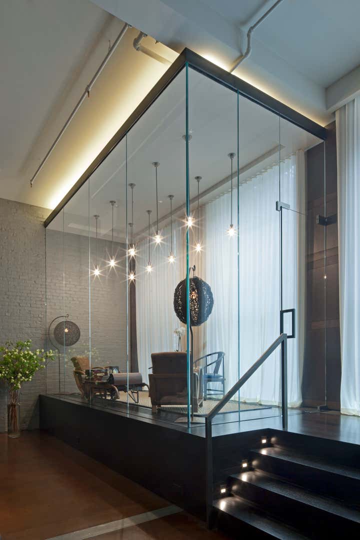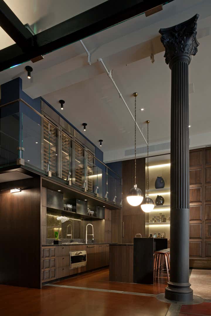 The Crosby Street Loft building is located on a cobblestone block in the Soho Cast Iron Historic District. Built in 1882, it was formerly a department store, and converted in 2001 to a 10-unit loft condominium. Our renovation of a second floor loft retains and celebrates many of the original details, including generous, open spaces, 14 foot plus ceiling heights, Corinthian-style columns, and a continuous 120 foot exposed brick wall with integrated archways. The design was a collaborative process, integrating elements discovered on the client’s world travels. Design features include a 12 foot tall glass lounge, two fireplaces, Control4 smart home system, a stone, cold-rolled steel and custom walnut cabinet kitchen and living room, and a luxurious master suite reminiscent of a 5-star hotel. Architect: David Howell Project Manager: Jill Diamant Interior Design: DHD Interiors