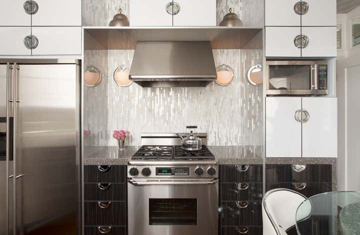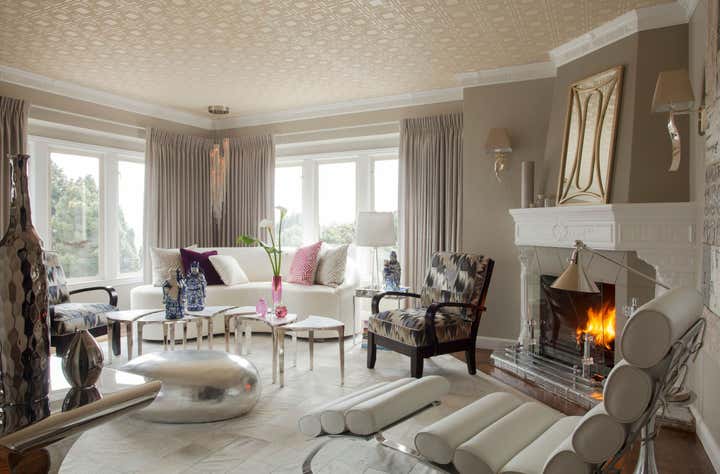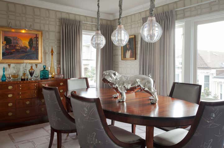 San Francisco is known for its distinctive architecture and dramatic cityscape. The clients for this art deco inspired building in San Francisco’s Buena Vista Park neighborhood wanted an elegant home with a liberal mix of contemporary, deco inspired and vintage/antique pieces. Favreau Design created a color palate of moody grays, crisp whites, and creamy gold as a canvas to the client’s sparkling jewel toned decanter collection highlighted by silver and gold leaves.