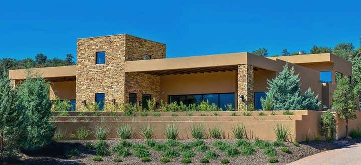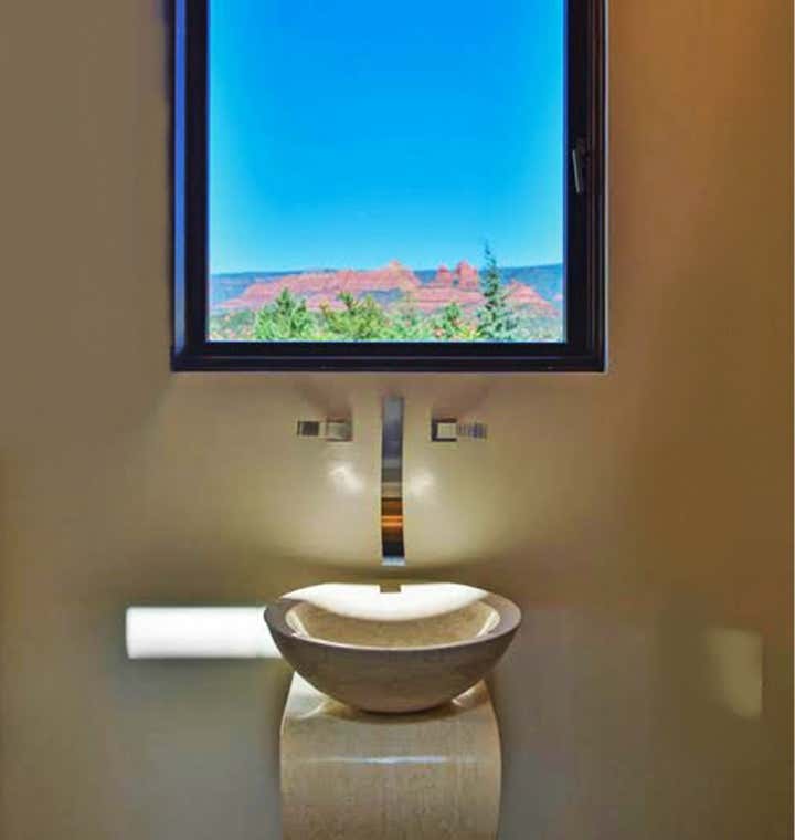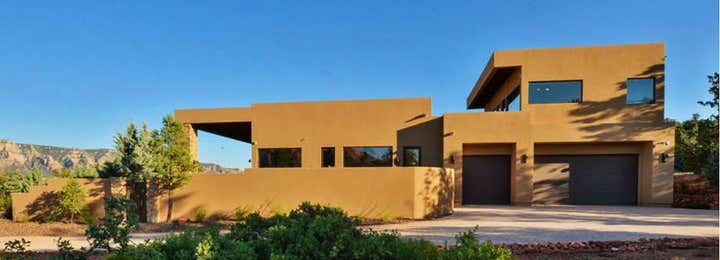 This home was designed for a Movie Producer and her family to vacation in Sedona, Arizona. The style is soft Modern with a Modern Adobe / Santa Fe flair. The home had sliding glass window walls that pocket fully opening the Living room and Master Bedroom to the front courtyard with it s pool.