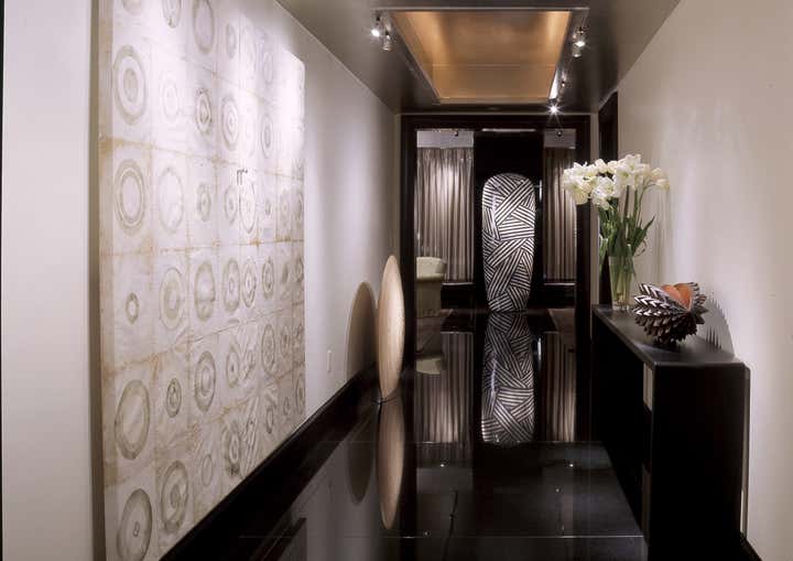 Beginning with adjacent raw apartments in a new, luxury tower in San Francisco, our clients asked us to create a dramatic background for a world-class art collection focused on craft. We created a plan for the combined square footage with a strong central axis that naturally divides public and private spaces, welcoming guests without compromising the privacy our clients had grown accustomed to in the large, traditional house where they raised their family. It was essential that the layout accommodate the artwork as comfortably as it does guests, as the clients entertain often. Mirror-polished black granite floors and pewter leaf tea paper on the walls and ceilings are softened with the hand-woven carpets and sumptuous textiles used throughout. The strong contrast of black, grey, silver and white threads through the backgrounds of the large apartment, allowing the artwork — the majority of which are wood pieces — to be the visual focus and to add warmth by contrasting the cool, urbane palette of the interior. Our custom-designed pieces in combination with artist-designed furniture and lighting commissioned for the rooms coalesce to create a unique urban experience.