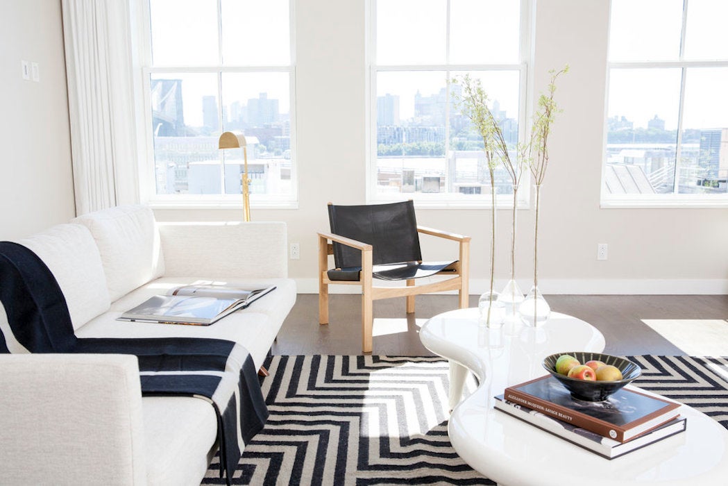 In this New York City penthouse, Cochineal maximizes light with pared-down design. Mixing shapes and textures, we set rounded furniture legs atop a sharply-lined rug and placed woven seating opposite smooth wood and polished brass. Elegant details like headboard straps anchored with smart hardware are distinct but not distracting.