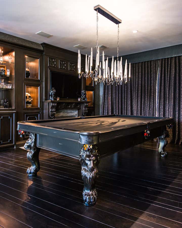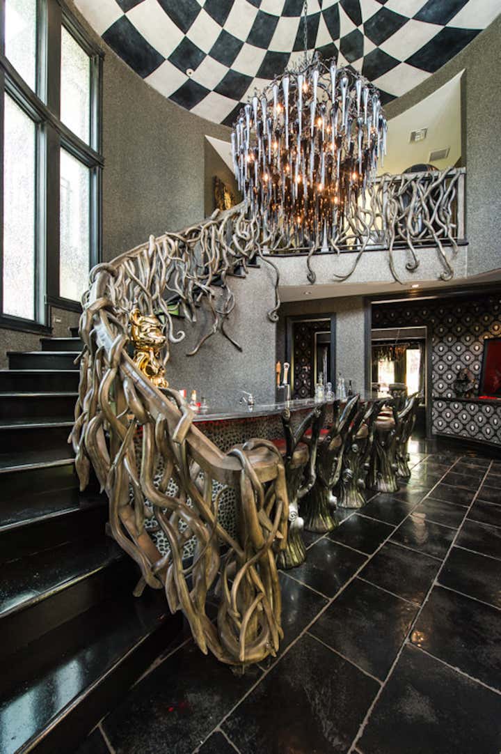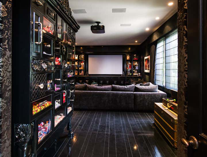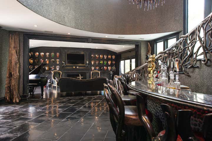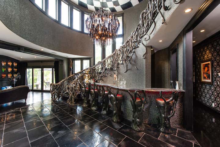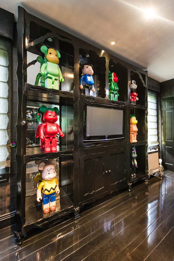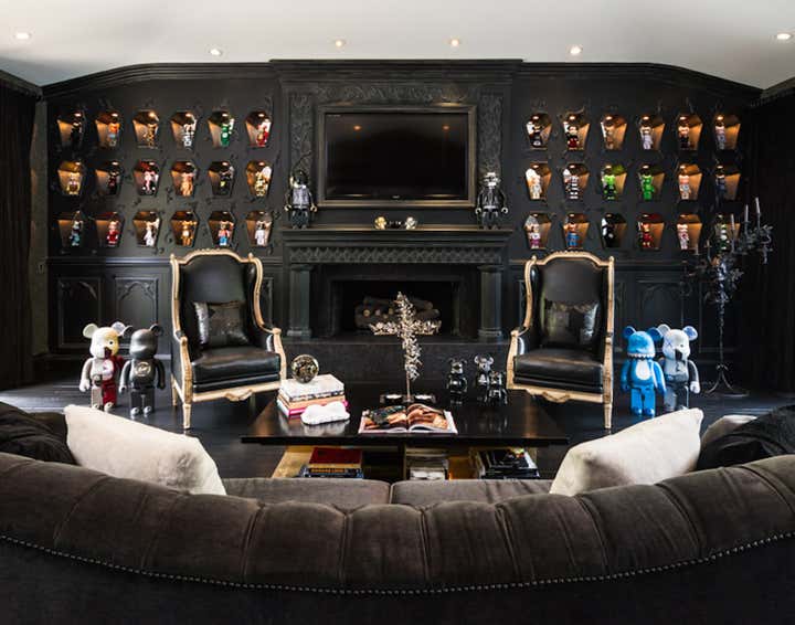 This is a house destination for a music producer in Beverly Hills. A sanctuary where the client wanted a dark, Tim Burton feel to the home and where he could entertain with three bars, game room, theater, and music studio located throughout the home. Everything in this mansion was custom to every detail to the clients life style. The extensive Bear Brick collection was something that we designed around giving them their last resting place, coffins, in the back wall. As you tour the home you will be taken away into another world, exactly what the client wanted.