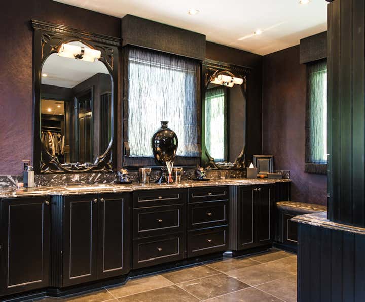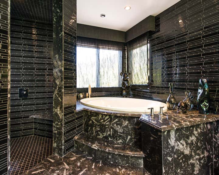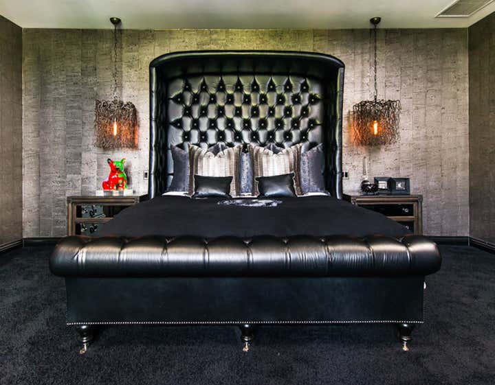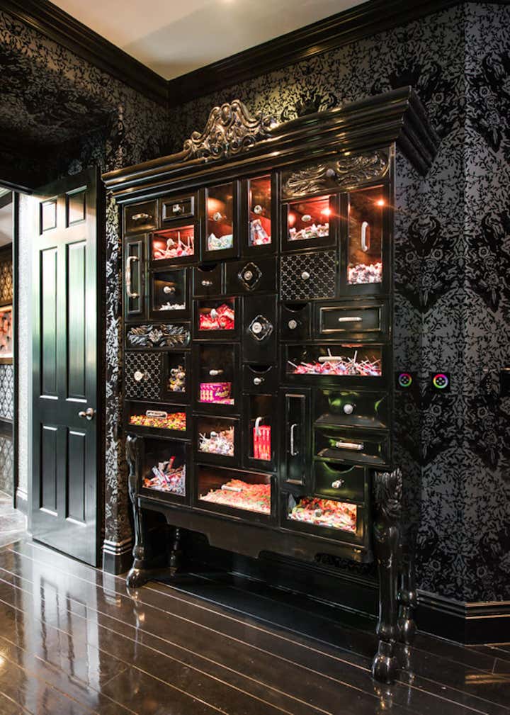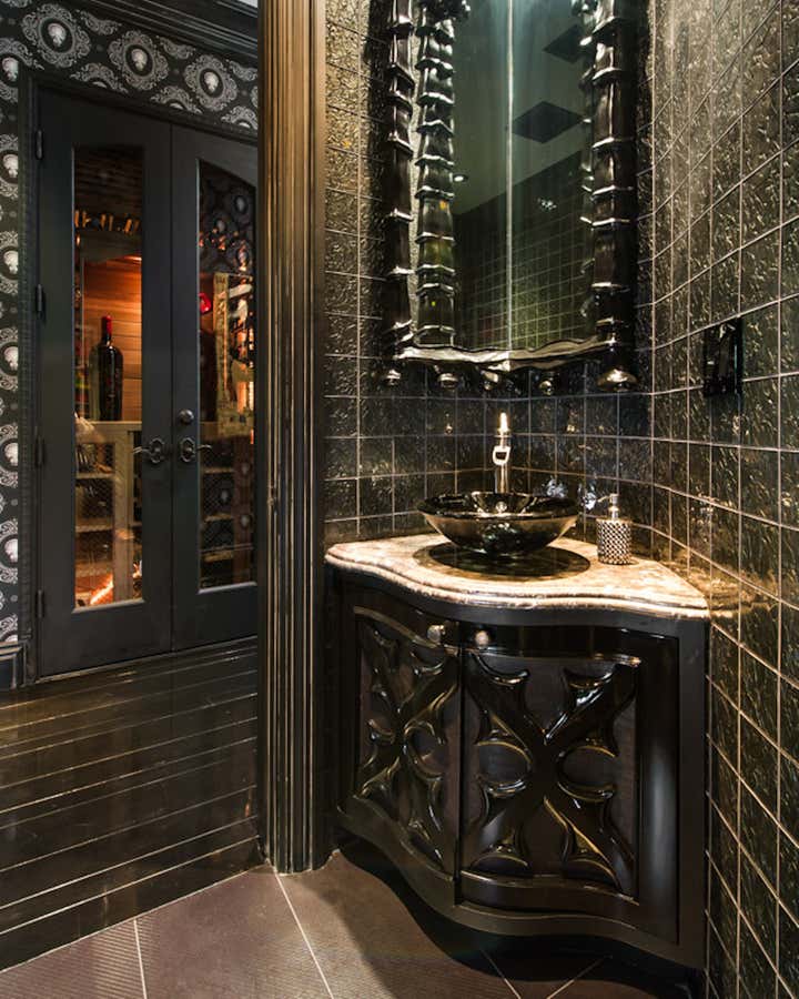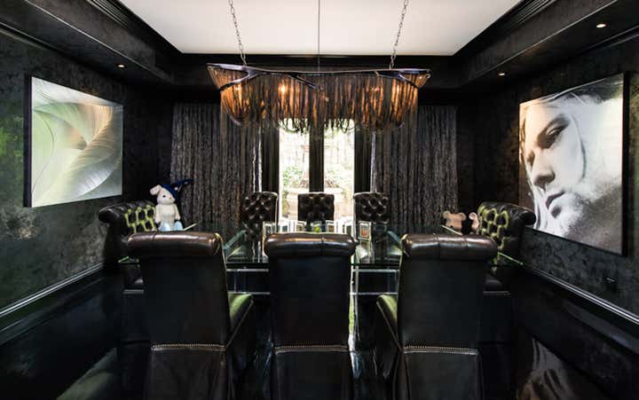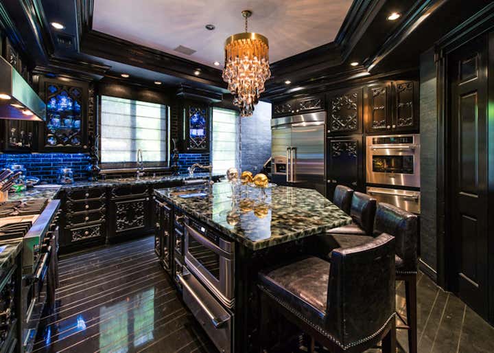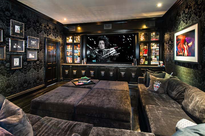 This is a house destination for a music producer in Beverly Hills. A sanctuary where the client wanted a dark, Tim Burton feel to the home and where he could entertain with three bars, game room, theater, and music studio located throughout the home. Everything in this mansion was custom to every detail to the clients life style. The extensive Bear Brick collection was something that we designed around giving them their last resting place, coffins, in the back wall. As you tour the home you will be taken away into another world, exactly what the client wanted.