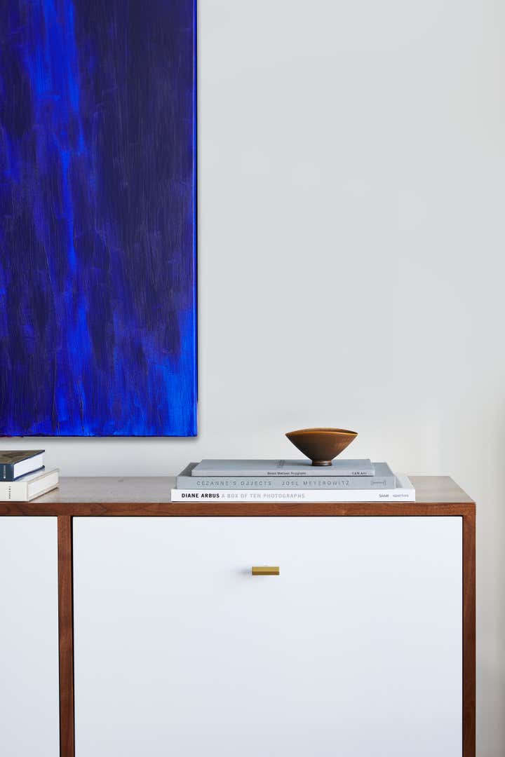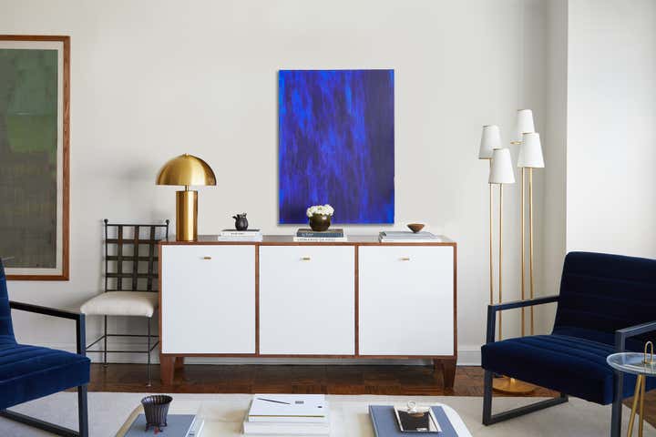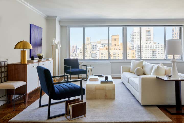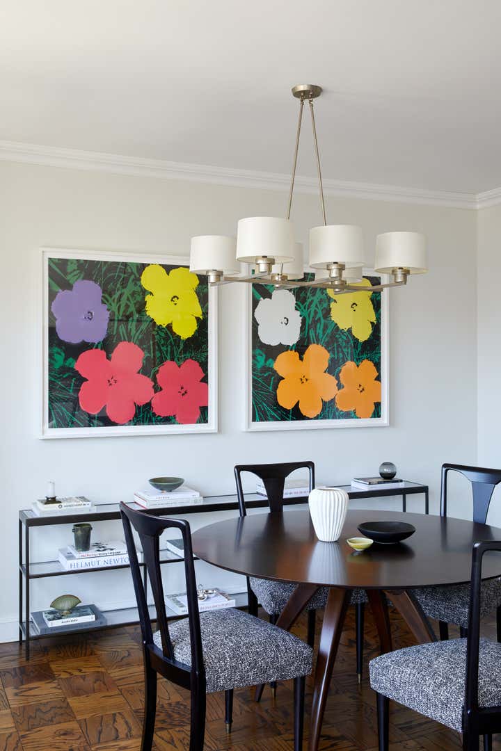 Inspired by Mid-Century Paris, we chose to make the couples art collection and the natural light in the space the centerpieces of this apartment in an Emery Roth designed building on Manhattan s Upper East Side. We played with neutrals and shades of blue in the living space, and allowed a set of Andy Warhol s to take center stage in the dining space. To maintain visual interest throughout, we used a mix of vintage and custom pieces to create a cohesive and sophisticated space for a young couple.