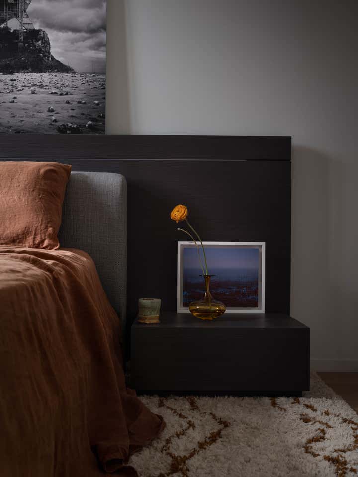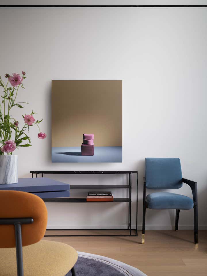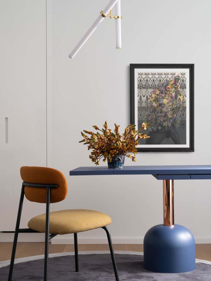 In the kitchen, a square dining table extends to accommodate guests – an otherwise rare find. Bold colors and geometric shapes play against the circular rug below that Ahmad custom designed as part of his collaboration with the rug brand JD Staron.