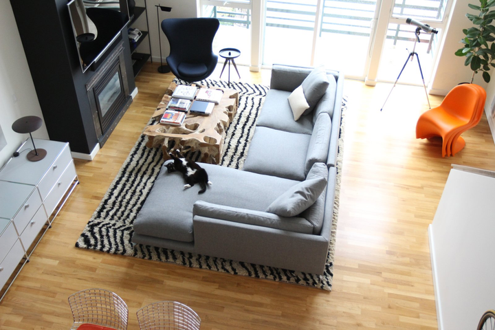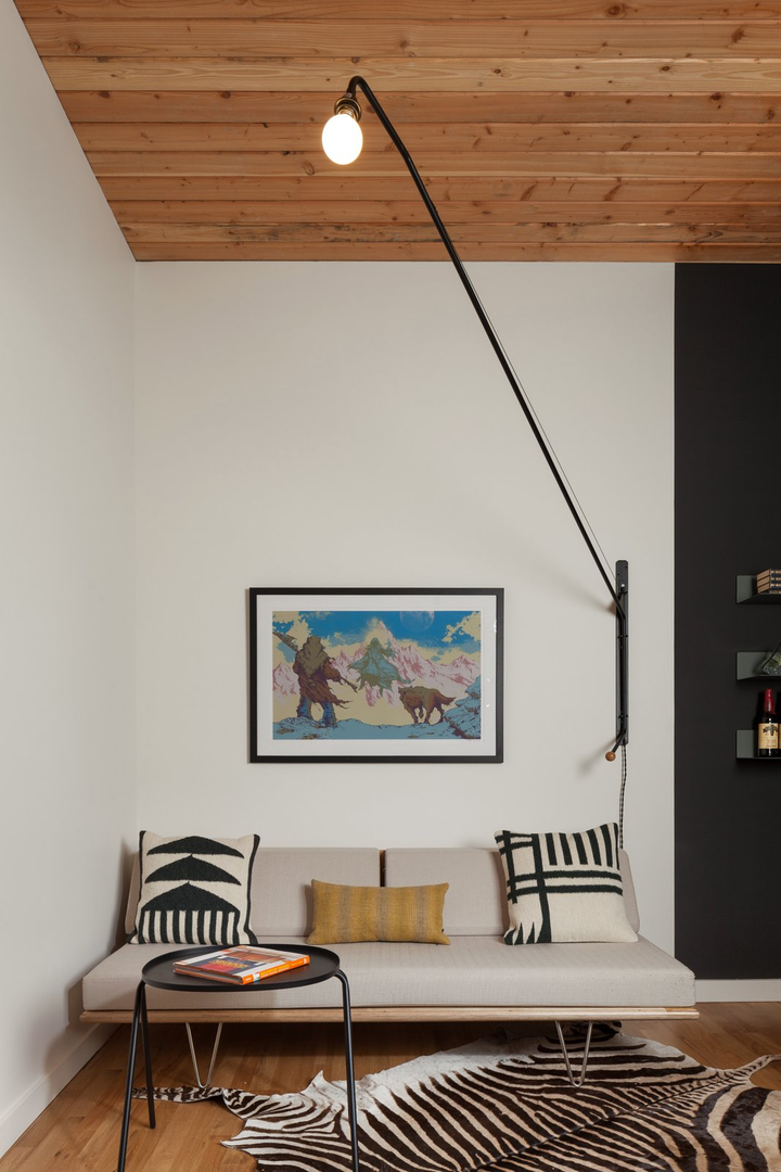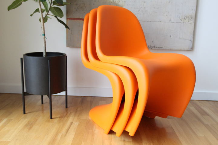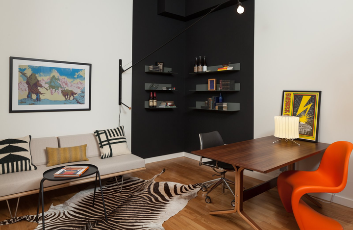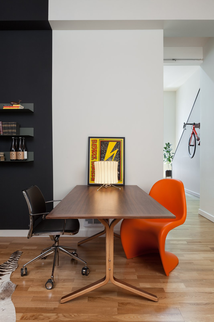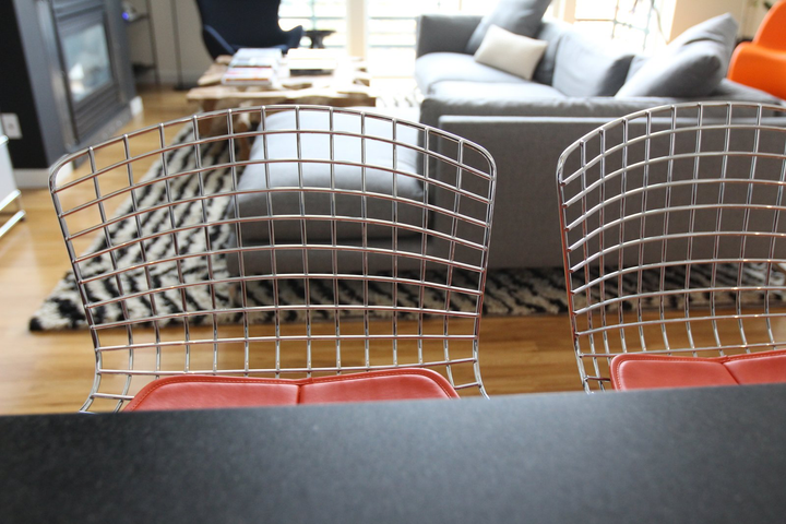 Hyde Evans Design set a modern tone and carried it through this three level condominium. Walls are white with well placed black accents. All are punctuated by tangerine with a series of stackable Panton chairs, which sit readily available for large gatherings.